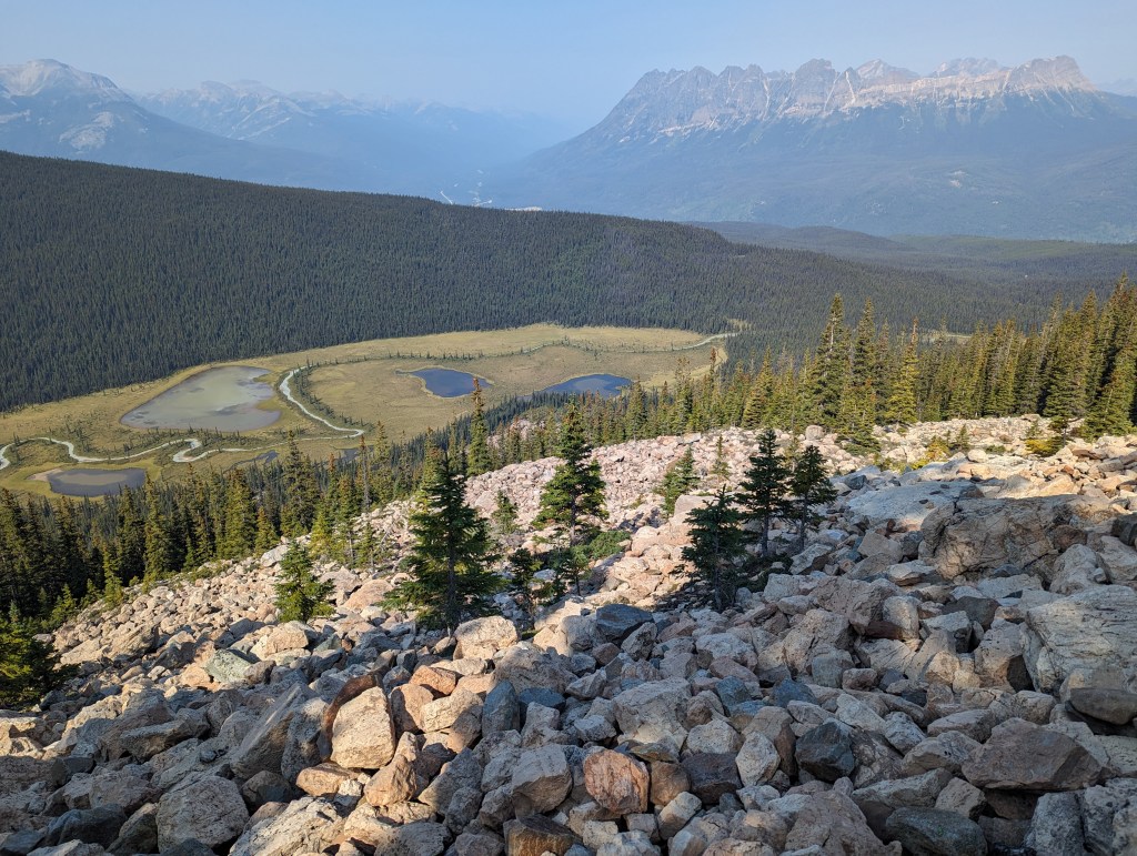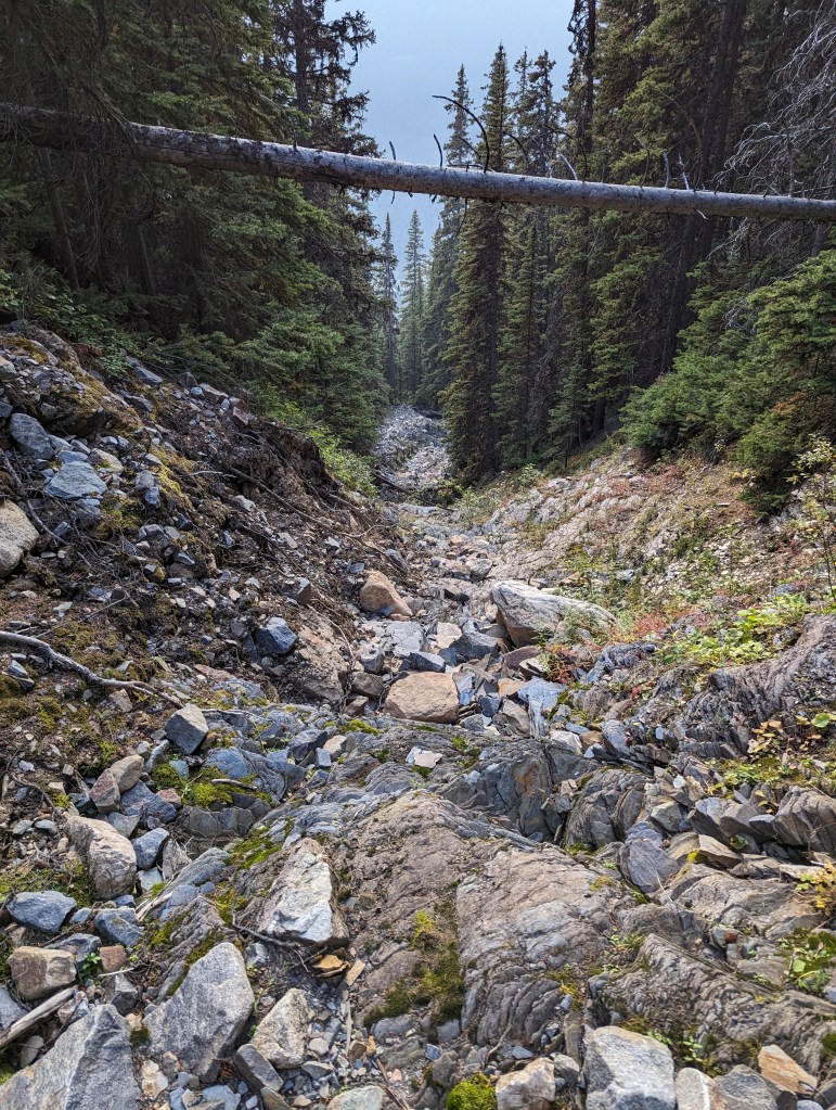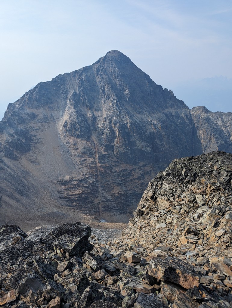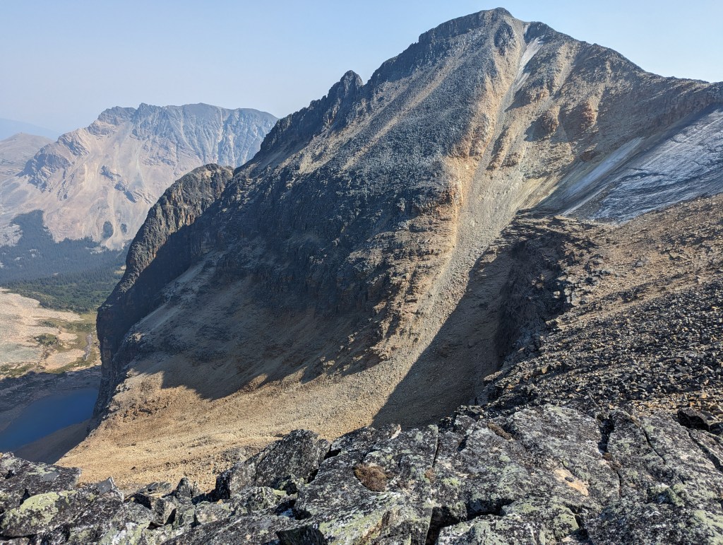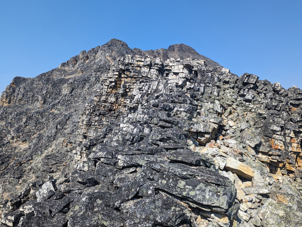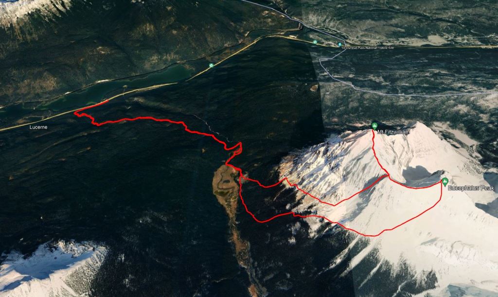 The trailhead was easy to find. Exercise caution when crossing the highway.A grouse welcomed me at the start of the day. The trail is easy up to the first campground.The first campsite at Rockingham Creek was reached in under two hours. It looks to have had recent improvements, including new tent pads.The charming campsite at Rockingham creek has a communal food area along the creek complete with fire pit and bear bin.Continuing across Rockingham Creek before turning right and beginning to bushwhack South along the creek requires crossing this bridge. It held me.The trees along the creek are fairly thin. But, everything in this section is wet and swampy. My pants were quickly saturated in the cool morning dew. Thankfully the inside of my hiking boots stayed dry. It’s worth noting that there had been no rain in the week prior and, overall, the summer was a dry one. I suspect this area is only dry when frozen.After a little over a kilometer of bushwhacking I arrived at a tributary to Rockingham Creek. I was not wearing my Gore-Tex boots and was not keen to have wet feet all day. Heading into the trees to look for an easy crossing, I eventually gave up on the wetland completely and instead hiked up the slope early, angling up towards the rock clearing visible in this photo.Finally reaching the rock clearing, the warm sun felt amazing on my cold, wet clothes. I lingered here for a snack break, kept company by many talkative pikas.The slope above the wetland is mossy and progress was easy. I continued angling up and right, soon reaching a rocky drainage. I followed the drainage up until I was above treeline.From above treeline, the wetland surrounding Rockingham Creek is obvious. The directions from the book would have had me following the creek for another kilometer. Across the valley, to the right, is Yellowhead Mountain. Below it are Yellowhead Lake and the boat launch where the day started.Side-hilling was required due to my route choice, but most of the rock was fairly stable. Traversing across two gullies slowed me down a bit, but I finally reached the correct gully – easily recognizable by its likeness to the gates of Mordor. The lower part of Fitzwilliam is a stable light-coloured rock. But, the upper part is miserable, rotten black rock.The loose rock in the gully can mostly be avoided by scrambling along the left side on solid rock. If traveling with others a helmet is strongly recommended here. Though the solid rock is recommended, take care. Maybe it was fatigue, but I got sloppy and fell here – only two feet, but even short falls can end the day if unlucky.Finally nearing the top of the gully and the Fitzwilliam-Bucephalus col.Yep.Looking South from the col to Bucephalus. I would tackle Fitzwilliam before coming back to Bucephalus.Looking North from the col towards Fitzwilliam.Beginning along the ridge to Fitzwilliam on rotten black rock. This peak is not overly popular, so the majority of loose holds are still there to discover. Feet tend to roll out from under you and no handhold can be trusted.Studying my choss-pile of route options.Nearing the summit of Fitzwilliam.The summit is wide enough to camp on, as garbage strewn indicates. There was no register.One last Look over Fitzwilliam Basin and further to Roche Noir (Center) before returning to the col.Once past the col and on the way up Bucephalus the day felt a bit brighter. The rock comprising the ridge of Bucephalus is more stable and the peak is only 45 minutes from the col.From the summit of Bucephalus, looking down over Fitzwilliam Basin. If a hiker were to continue on the proper trail from the first campsite, it would lead to a second campsite in this basin. However, the peak isn’t accessible from there.Fitzwilliam, viewed from the summit of Bucephalus.Roche Noir and other peaks to the East.Looking back along the ridge to the col. The top of the gully is the notch at the right.By this point my tumble in the gully was catching up with me and every step on descent was uncomfortable. I didn’t like the vibe in the gully and didn’t want to further injure myself, knowing the bushwhack was still ahead. Instead I decided to descend the back of Bucephalus on a talus slope, traversing around to meet up with the bottom of the gully. This was the right choice for my ankle, but was a bit longer. If travelling in a large group, this detour could be a good option to mitigate rockfall hazard.Passing back under the gates to Mordor. Note the stark contrast in rock. By this point my ankle was forcing me to limp. I used my InReach to notify that I would be delayed and then trudged on.On descent I took a different rock gully down earlier to easier terrain. This gully went nearly to the valley floor. Avalanches likely open up different paths from year to year. As of 2023 though, this is the easiest path.From the bottom of the gully/slide path, bushwhacking through trees was relatively easy, eventually leading to the same rocky clearing passed earlier in the day. The contrasting rocks on Fitzwilliam are obvious in this photo.