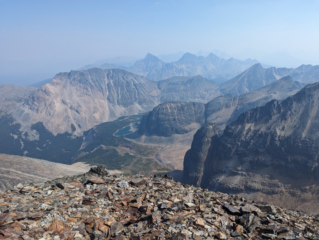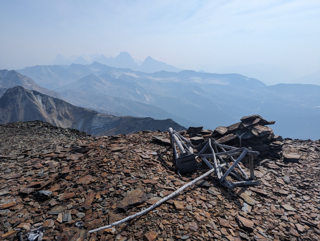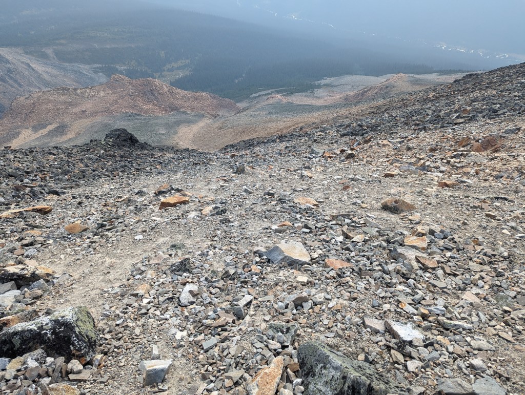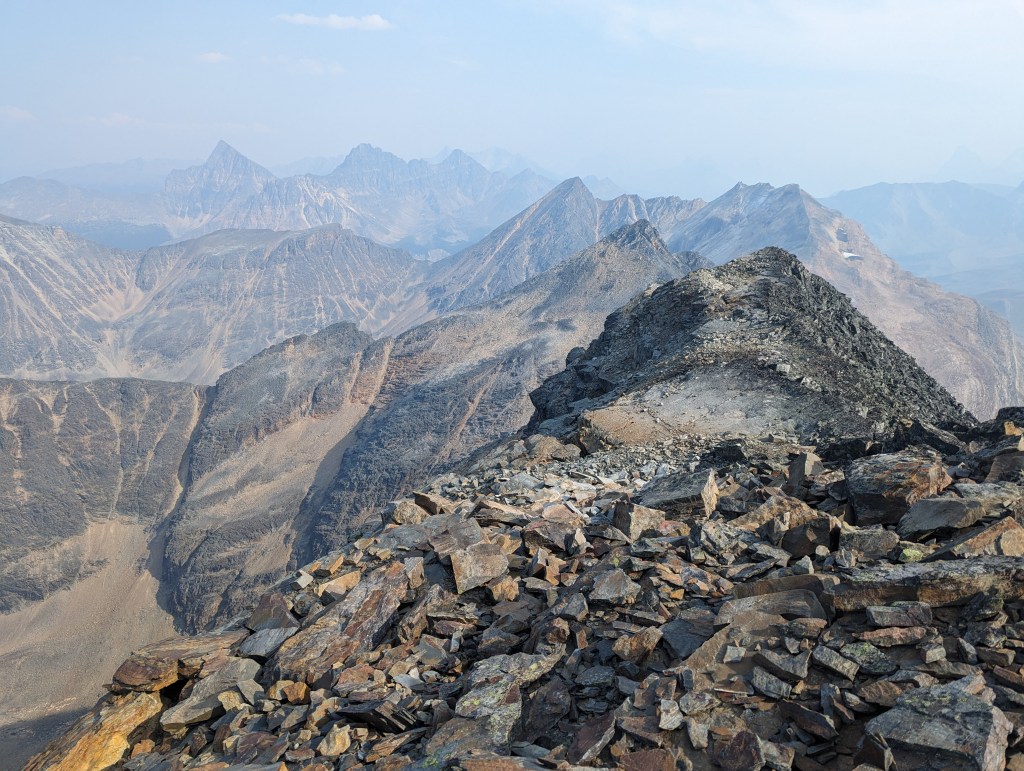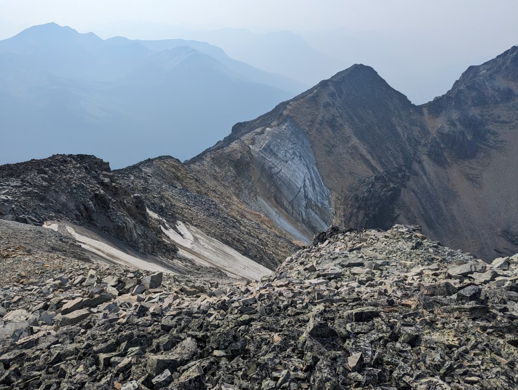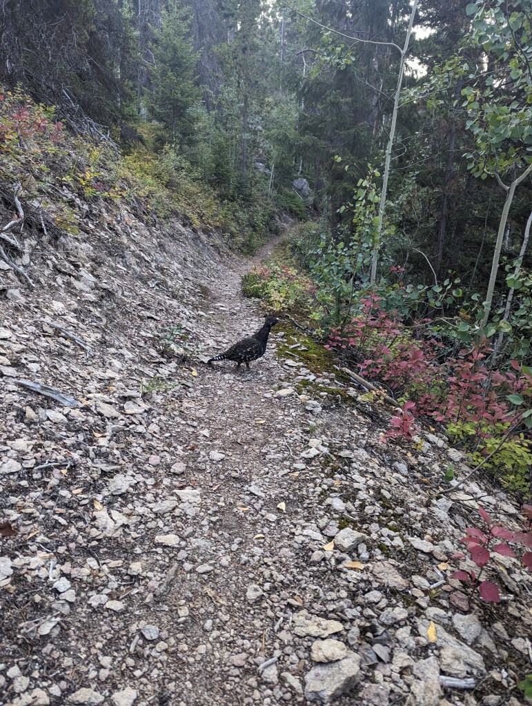 The trailhead was easy to find. Exercise caution when crossing the highway.A grouse welcomed me at the start of the day. The trail is easy up to the first campground.The first campsite at Rockingham Creek was reached in under two hours. It looks to have had recent improvements, including new tent pads.The charming campsite at Rockingham creek has a communal food area along the creek complete with fire pit and bear bin.Continuing across Rockingham Creek before turning right and beginning to bushwhack South along the creek requires crossing this bridge. It held me.The trees along the creek are fairly thin. But, everything in this section is wet and swampy. My pants were quickly saturated in the cool morning dew. Thankfully the inside of my hiking boots stayed dry. It’s worth noting that there had been no rain in the week prior and, overall, the summer was a dry one. I suspect this area is only dry when frozen.After a little over a kilometer of bushwhacking I arrived at a tributary to Rockingham Creek. I was not wearing my Gore-Tex boots and was not keen to have wet feet all day. Heading into the trees to look for an easy crossing, I eventually gave up on the wetland completely and instead hiked up the slope early, angling up towards the rock clearing visible in this photo.Finally reaching the rock clearing, the warm sun felt amazing on my cold, wet clothes. I lingered here for a snack break, kept company by many talkative pikas.The slope above the wetland is mossy and progress was easy. I continued angling up and right, soon reaching a rocky drainage. I followed the drainage up until I was above treeline.From above treeline, the wetland surrounding Rockingham Creek is obvious. The directions from the book would have had me following the creek for another kilometer. Across the valley, to the right, is Yellowhead Mountain. Below it are Yellowhead Lake and the boat launch where the day started.Side-hilling was required due to my route choice, but most of the rock was fairly stable. Traversing across two gullies slowed me down a bit, but I finally reached the correct gully – easily recognizable by its likeness to the gates of Mordor. The lower part of Fitzwilliam is a stable light-coloured rock. But, the upper part is miserable, rotten black rock.The loose rock in the gully can mostly be avoided by scrambling along the left side on solid rock. If traveling with others a helmet is strongly recommended here. Though the solid rock is recommended, take care. Maybe it was fatigue, but I got sloppy and fell here – only two feet, but even short falls can end the day if unlucky.Finally nearing the top of the gully and the Fitzwilliam-Bucephalus col.Yep.Looking South from the col to Bucephalus. I would tackle Fitzwilliam before coming back to Bucephalus.Looking North from the col towards Fitzwilliam.Beginning along the ridge to Fitzwilliam on rotten black rock. This peak is not overly popular, so the majority of loose holds are still there to discover. Feet tend to roll out from under you and no handhold can be trusted.Studying my choss-pile of route options.Nearing the summit of Fitzwilliam.The summit is wide enough to camp on, as garbage strewn indicates. There was no register.One last Look over Fitzwilliam Basin and further to Roche Noir (Center) before returning to the col.Once past the col and on the way up Bucephalus the day felt a bit brighter. The rock comprising the ridge of Bucephalus is more stable and the peak is only 45 minutes from the col.From the summit of Bucephalus, looking down over Fitzwilliam Basin. If a hiker were to continue on the proper trail from the first campsite, it would lead to a second campsite in this basin. However, the peak isn’t accessible from there.Fitzwilliam, viewed from the summit of Bucephalus.Roche Noir and other peaks to the East.Looking back along the ridge to the col. The top of the gully is the notch at the right.By this point my tumble in the gully was catching up with me and every step on descent was uncomfortable. I didn’t like the vibe in the gully and didn’t want to further injure myself, knowing the bushwhack was still ahead. Instead I decided to descend the back of Bucephalus on a talus slope, traversing around to meet up with the bottom of the gully. This was the right choice for my ankle, but was a bit longer. If travelling in a large group, this detour could be a good option to mitigate rockfall hazard.Passing back under the gates to Mordor. Note the stark contrast in rock. By this point my ankle was forcing me to limp. I used my InReach to notify that I would be delayed and then trudged on.On descent I took a different rock gully down earlier to easier terrain. This gully went nearly to the valley floor. Avalanches likely open up different paths from year to year. As of 2023 though, this is the easiest path.From the bottom of the gully/slide path, bushwhacking through trees was relatively easy, eventually leading to the same rocky clearing passed earlier in the day. The contrasting rocks on Fitzwilliam are obvious in this photo.