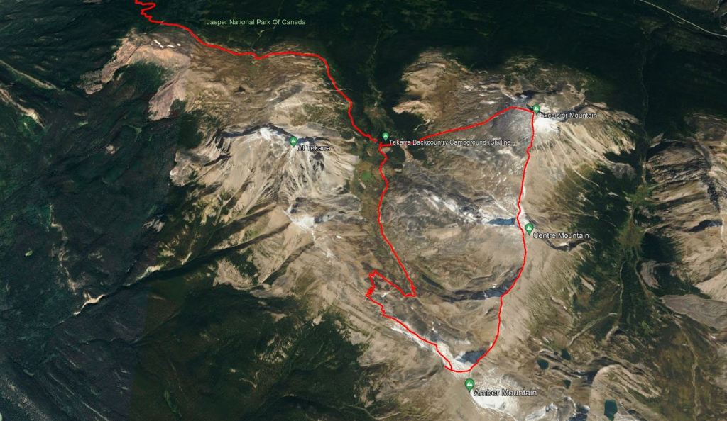 About 200 m east of Tekarra Campsite a rocky clearing opens up. Excelsior is at the left of this photo, with a thick band of trees blocking the way. I spotted a thin line in the trees and, as I got closer, heard running water. I followed this small stream up until above treeline. It was fairly easy.Standing along the small stream, looking down the thin clear (ish) path.Above treeline the stream broadens a bit. After crossing this meadow the boulder-hopping extravaganza begins. The rocky summit section ahead gets steep in places, with precariously balanced boulders, which I didn’t feel trusting of. From far back I picked a line more to the left to stay away from slopes I didn’t like. Maybe it was just the morning light.Approaching the summit of Excelsior Mountain.Looking down Excelsior’s steep Northeast face. The Watchtower is in the background.Reaching the peak of Excelsior. The familiar shape of Mount Edith Cavell (Just right of center) dominates the horizon. Throne Mountain (To the right of Edith Cavell) looks remarkably like its namesake from this angle.Summit panorama from Excelsior.Medicine Lake, to the East.Mount Tekarra, to the West.Beginning along the ridge towards Centre Mountain.Coming up on Centre Mountain. The route is obvious with no real troubles.Looking back at Excelsior.Nearing the summit of Centre, ever boulder-hopping.The summit has a register, but I couldn’t get it open. Note to self: Pack Leatherman.Am I getting worse with the timer…. Or better?Looking along the next portion of ridge connecting Centre to Amber. Amber Mountain is the small hill above the snow patch.Summit panorama from Centre Mountain.Continuing on to AmberA bit of interesting rock along the ridge. The descent of Centre is in the background.Coming up on the final portion of the ridge connecting Centre and Amber. The edges of the ridge are loose, steep, and more effort than sticking to the ridgeline. Most of the ridgeline isn’t as steep as it looks, but the final few meters are probably low fifth class climbing, exactly as steep as it looks in this picture. A better plan would probably have been to lose additional elevation and bypass to the left.Most of the ridgeline isn’t too bad. The sides of the ridge are loose and unpleasant. The last few meters of the ridgeline get a lot worse, but I was too preoccupied to snap a photo.After tackling the final, terrible section of the ridge, and then pausing to say hello to some bewildered looking backpackers, I finally reached the summit of Amber Mountain.At the left is the high point in the ridge between Centre and Amber. A lot of elevation is lost on the way to Amber. The faint horizontal line in the foreground of this photo is Skyline Trail. If backpacking Skyline Trail, one could almost summit this peak without noticing.The final portion of the loop was easy hiking back to Tekarra Campsite on Skyline Trail.The marmots are so habituated to humans that this one didn’t even run away from me. Marmot-butt selfie!After picking up my camping gear from Tekarra Campsite, I backpacked 6km out to Signal Campsite where I had stashed my bike the previous day. I made sure my brakes were still working and then flew down the fire road.Autumn in Jasper National Park.