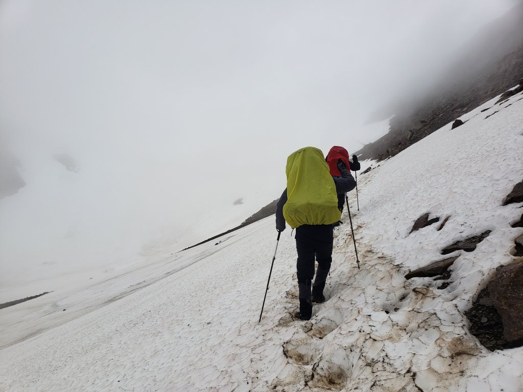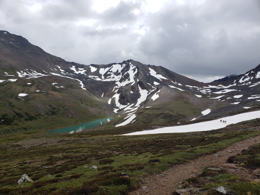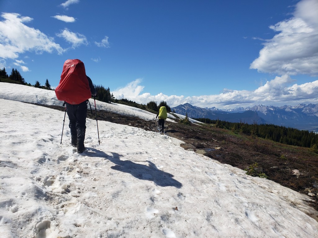 Typical early season conditions.Hiking through “The Notch” in July 2020.Mount Tekarra is to the left. Tekarra Campsite is in the valley ahead.A group ahead crosses a snow patch on the trail. Centre Mountain is to the left. Amber Mountain is out of view to the left.The sun finally emerged just as we were approaching Signal Campsite! There was still considerable snow on the trail in July 2020.
