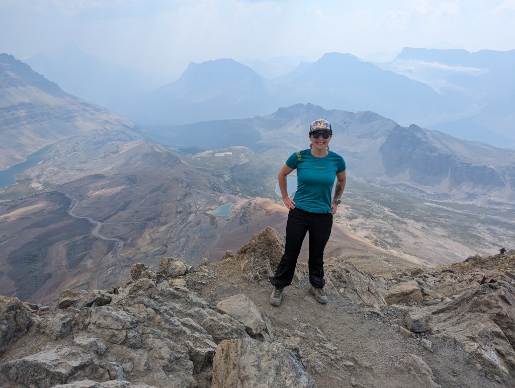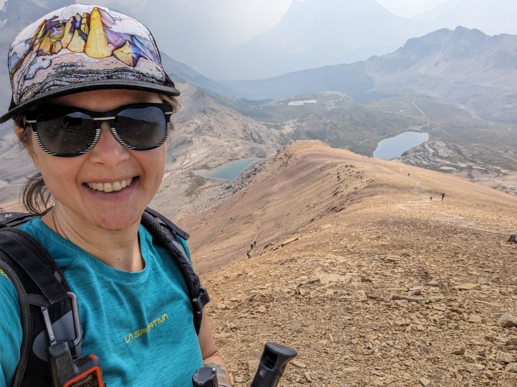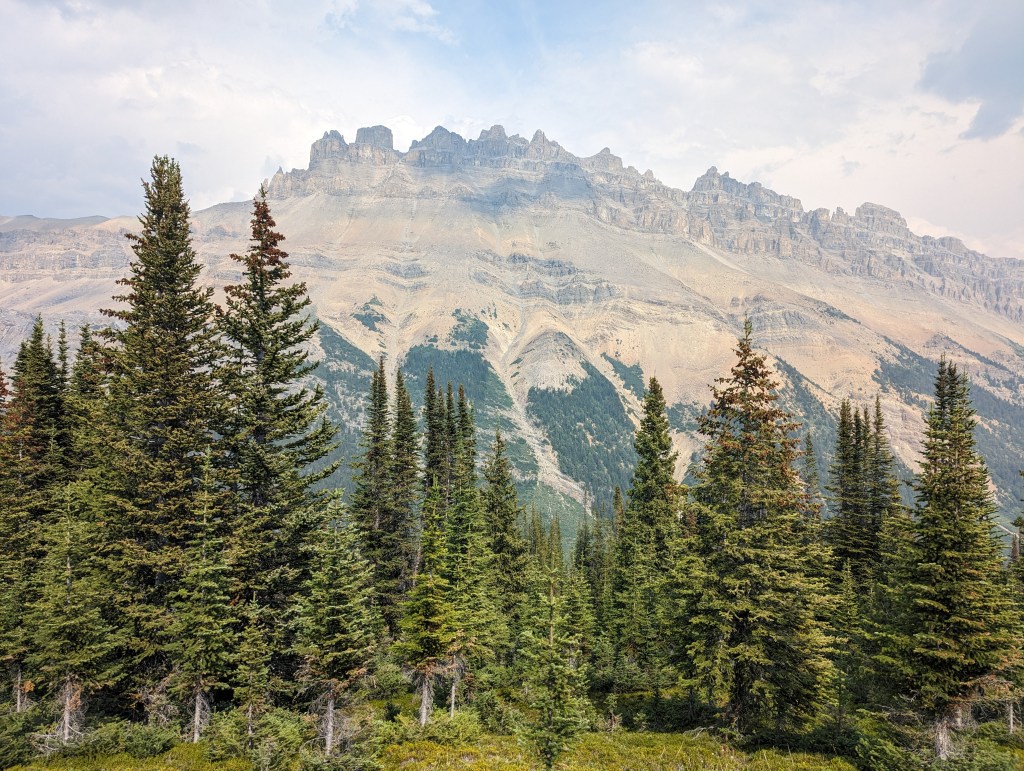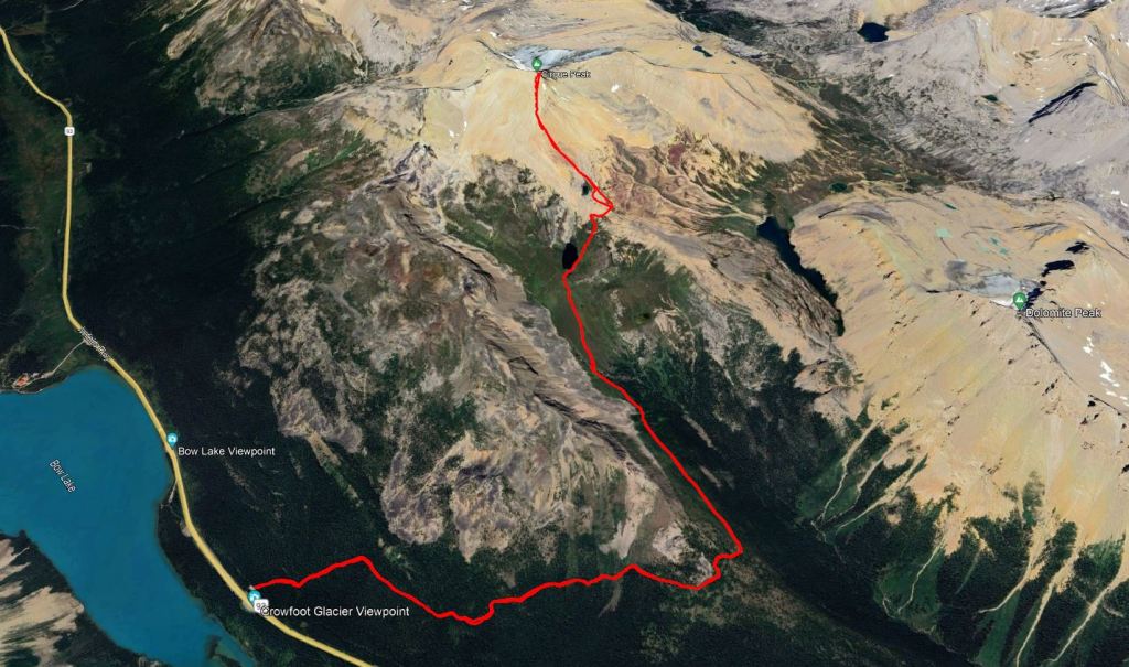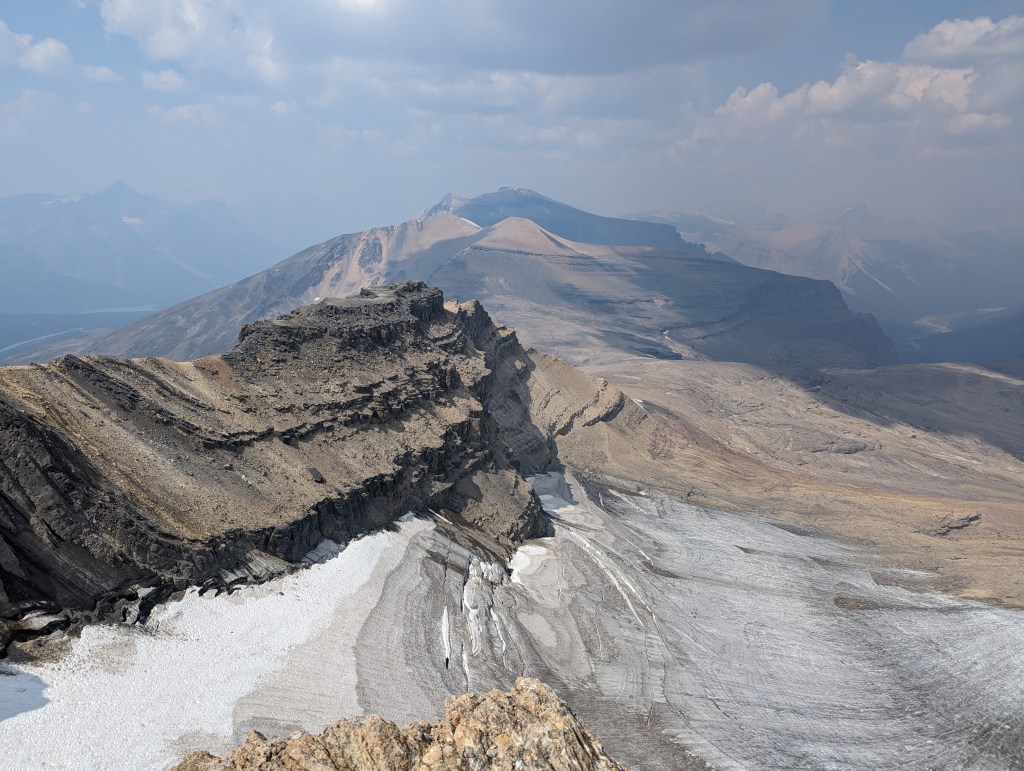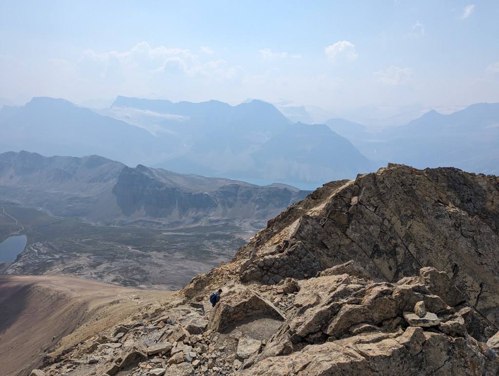 I hiked through here in June 2017 and had to climb over fresh avalanche debris. Already in 2023 the avalanche path barely stands out.Looking back across the highway to the Crowfoot Glacier.Reaching the alpine, catching a first glimpse of Cirque Peak. This section of trail shows bad braiding from hikers avoiding mud in early summer. If you don’t like hiking through mud, it’s best to leave this one for September to avoid further damage.Reaching Helen Lake, Cirque Peak in the background. The trail zig-zags through the cliff to the right.Gaining the cliff and pausing at a tarn at the base of Cirque Peak. There are two obvious paths up: One trail through the scree can be seen here to the center/right and the other passes through the cliff band to the left (Look for a person wearing red). I took the scree path to the right, but it looks like the cliff band to the left is just as easy.Easy travel along the path. Looking back at the tarn, Dolomite Peak in the background.At the spot where the two paths meet. Plenty of people can be seen on both route options.Looking ahead to the final push up Cirque Peak. It gets a bit loose and steep near the top, but is never more than easy scrambling.At the summit! It’s quite smoky, but you can still make out Katherine Lake at the left (At the base of Dolomite Peak) and the Crowfoot Glacier to the right. Helen Lake and the approach trail are at center, behind me.Looking North at the glaciated face of Cirque Peak.Beginning my descent. There are two paths through the last few meters below the summit. Both paths are easy scrambling, but many parties seemed more comfortable using their hands for a few moves here.Passing Dolomite Peak on the hike out.