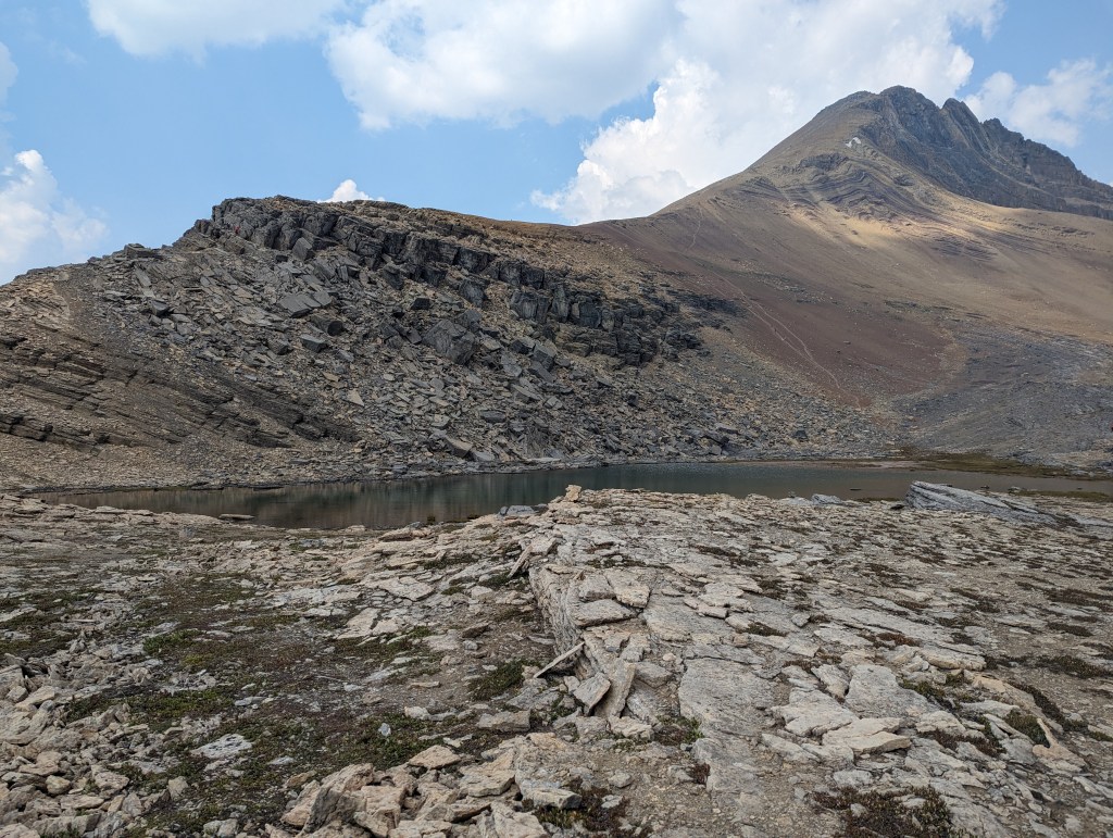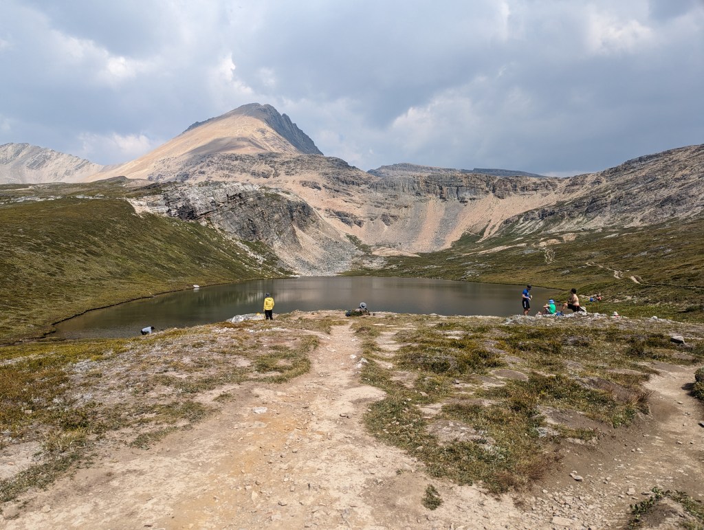 The approach trail is shared with Helen Lake and Dolomite Pass. The small parking lot tends to fill early, but I was able to park across the road at Crowfoot Glacier Viewpoint. Exercise caution when crossing the highway. Most of the day is an easy hike on a well-maintained trail.