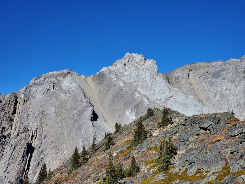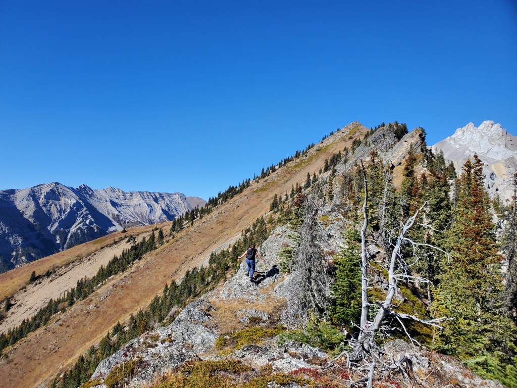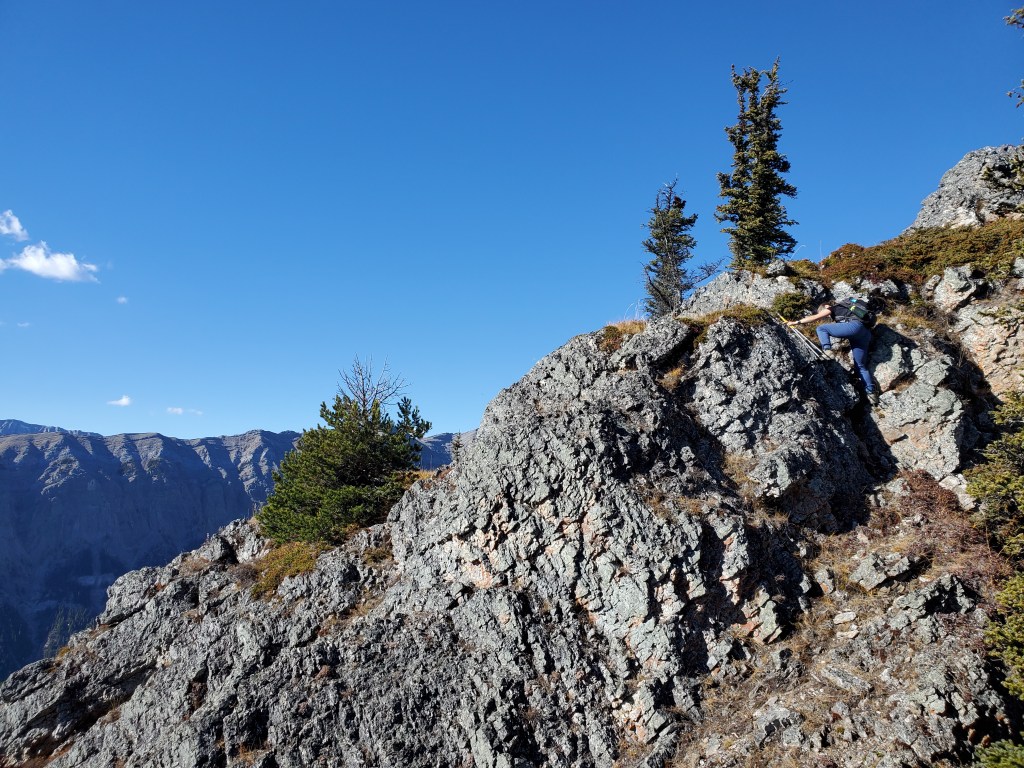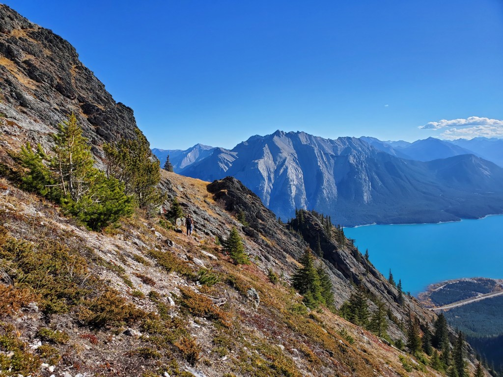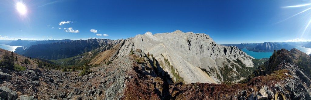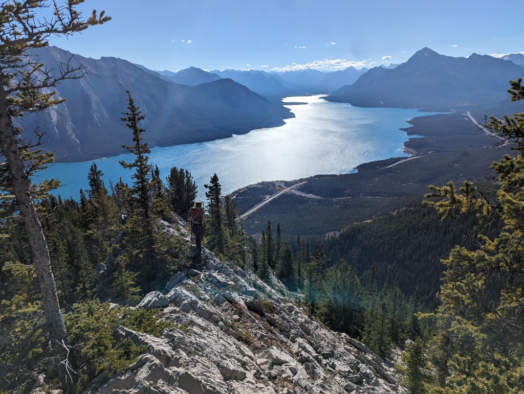 After roughly ten minutes of easy bushwhacking through aspens we reached the toe of the ridge. Impressive views over Abraham Lake open up immediately.Looking back at the way we came. Mount Michener dominates the view. We parked right of center, where the two varieties of tree meet, and then followed the edge of the aspens until we spotted the ridge through the trees.Typical travel at the start of the ridge.The fun portion of the ridge walk begins. Any difficult sections encountered were always easy to bypass .Looking back. The ridge is less fierce once up close.Bypassing a cliff sectionApproaching a false summit along the way.A few fun moderate scrambling moves (easily bypassed to the left).Looking back at a false summit.Approaching the last false summit, just before the peak.Looking back, southward. Abraham Lake narrows in the distance to its primary source, the North Saskatchewan River, with various peaks from the Icefields beyond.Standing on the peak of Little Abraham. Mount Abraham towers above me in the background.Striking views over Abraham Lake and Mount Michener from the peak of Little Abraham.The complex terrain of Mount Abraham lies to the North. It will have to wait for another day though. Summit panorama.Heading back the way we came.Downclimbing a short scramble section. It’s easier than it looks!