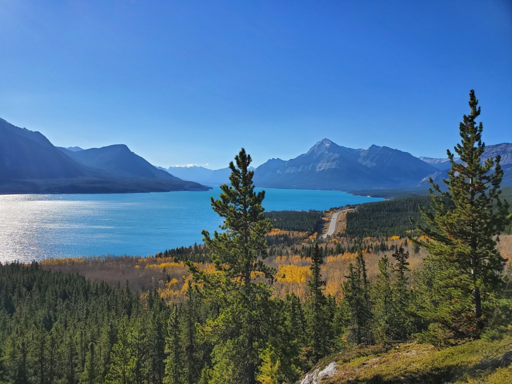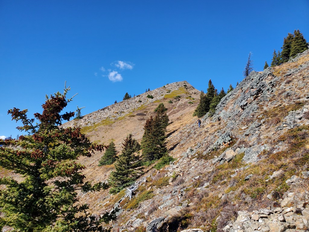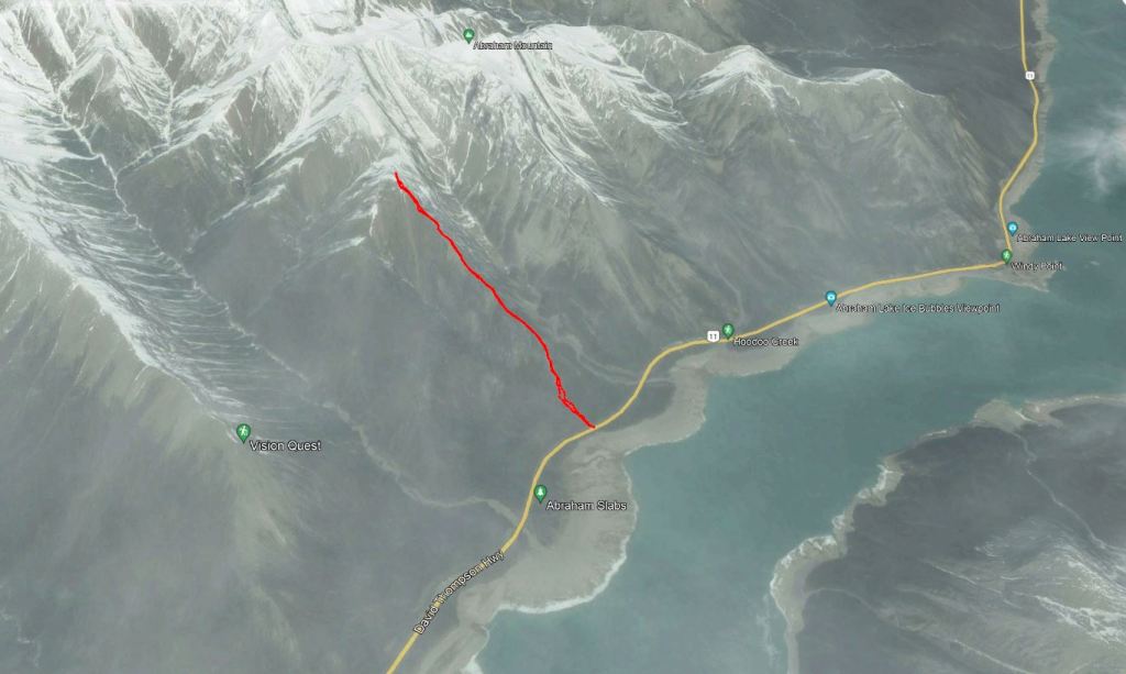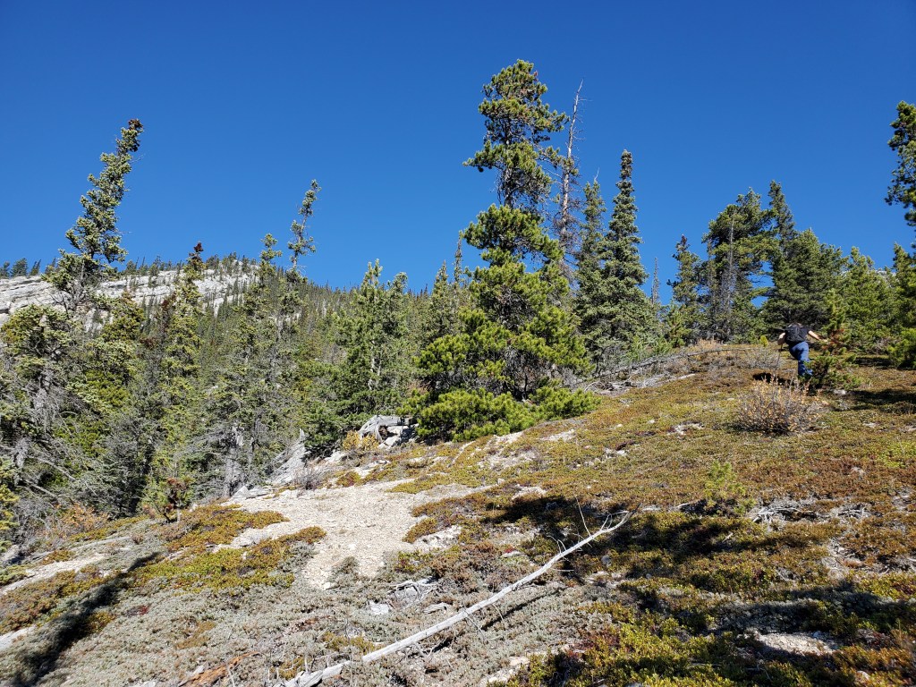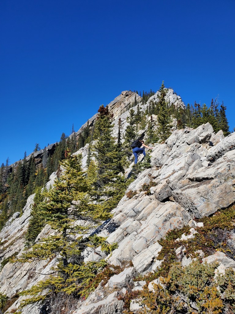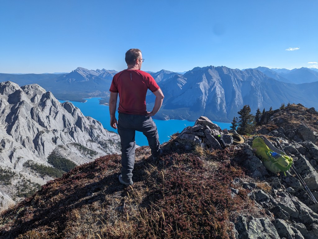 After roughly ten minutes of easy bushwhacking through aspens we reached the toe of the ridge. Impressive views over Abraham Lake open up immediately.Looking back at the way we came. Mount Michener dominates the view. We parked right of center, where the two varieties of tree meet, and then followed the edge of the aspens until we spotted the ridge through the trees.Typical travel at the start of the ridge.The fun portion of the ridge walk begins. Any difficult sections encountered were always easy to bypass .Looking back. The ridge is less fierce once up close.Bypassing a cliff sectionApproaching a false summit along the way.A few fun moderate scrambling moves (easily bypassed to the left).Looking back at a false summit.Approaching the last false summit, just before the peak.Looking back, southward. Abraham Lake narrows in the distance to its primary source, the North Saskatchewan River, with various peaks from the Icefields beyond.Standing on the peak of Little Abraham. Mount Abraham towers above me in the background.Striking views over Abraham Lake and Mount Michener from the peak of Little Abraham.The complex terrain of Mount Abraham lies to the North. It will have to wait for another day though. Summit panorama.Heading back the way we came.Downclimbing a short scramble section. It’s easier than it looks!