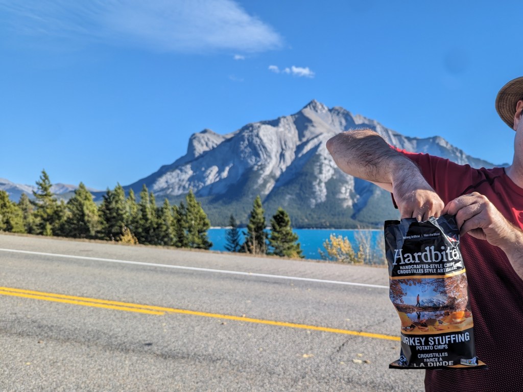 We made it back to the road in 5 hrs 15 min, leaving plenty of time for a Thanksgiving feast. In true dirtbag style, we feasted on ramen noodles and a bag of turkey stuffing chips! Hardbite released a limited edition flavour for Thanksgiving, featuring a photo of Abraham Lake and Mount Michener. I was delighted.