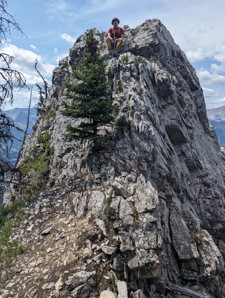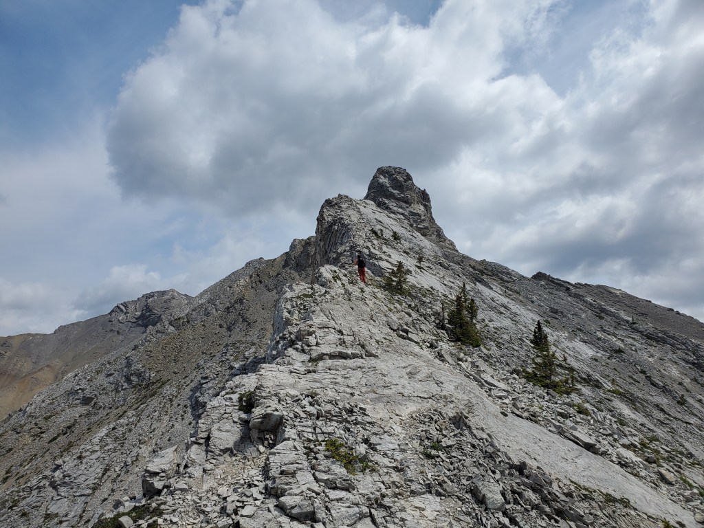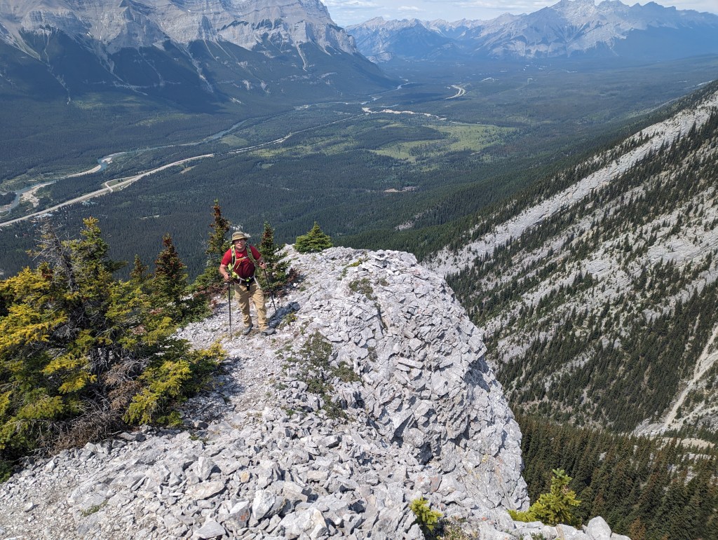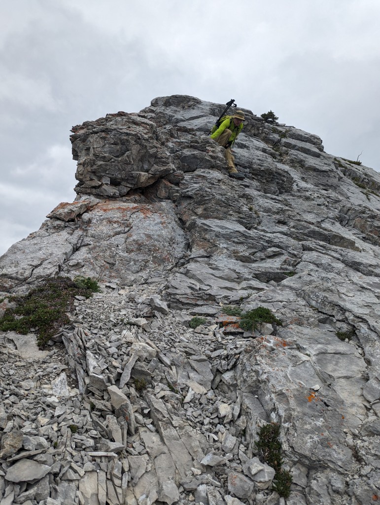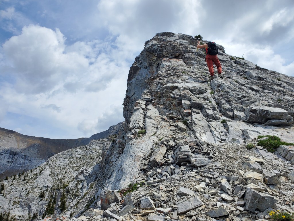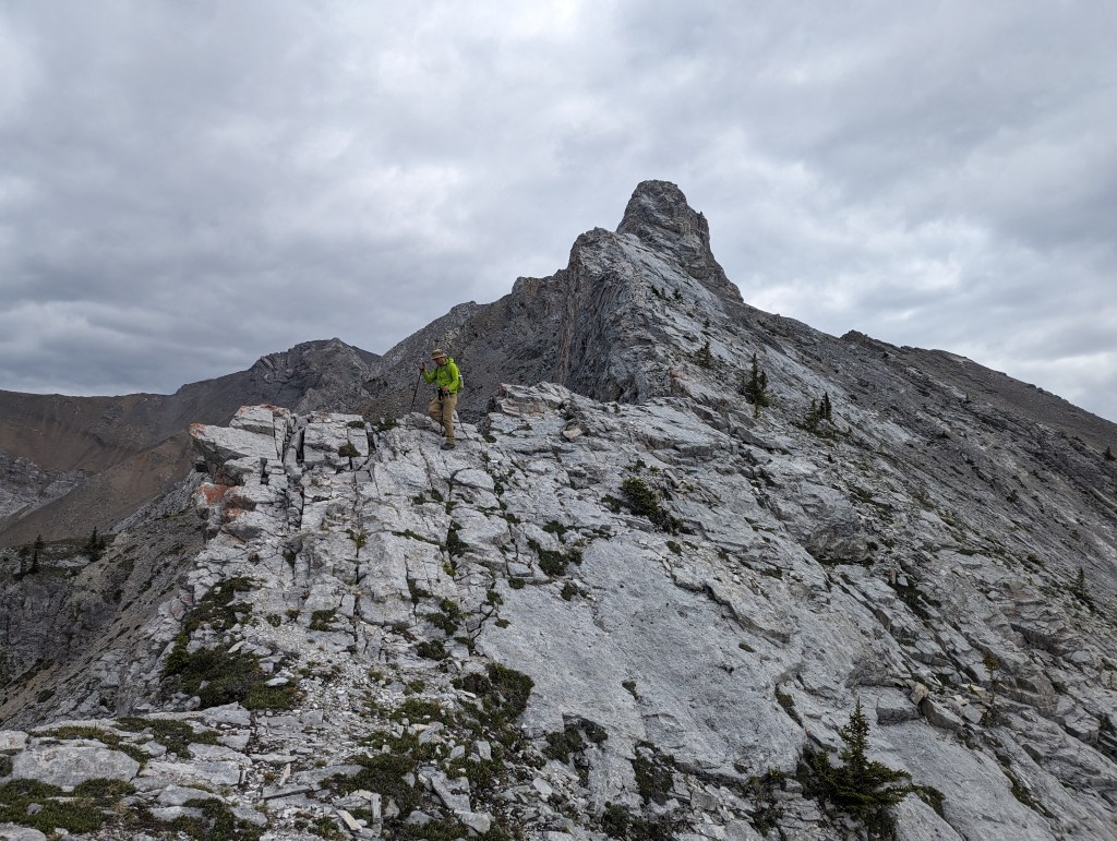 We reached the parking lot in 6 1/2 hrs, deciding next to calm our nerves with ice cream in Canmore. I enjoyed the scrambling portion of this one, but not the bushwhacking. Dan manages a phobia of heights and hates “surprise” difficulty, so didn’t particularly enjoy this one. I might bump the rating from moderate to difficult scrambling if following the ridge closely. There might be a more moderate bypass of the trickiest section, but the gentler slab off the ridge is still gravel-strewn.