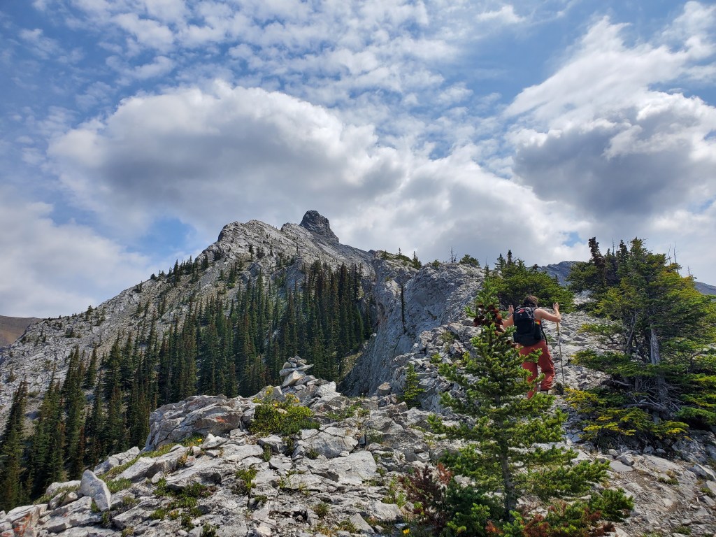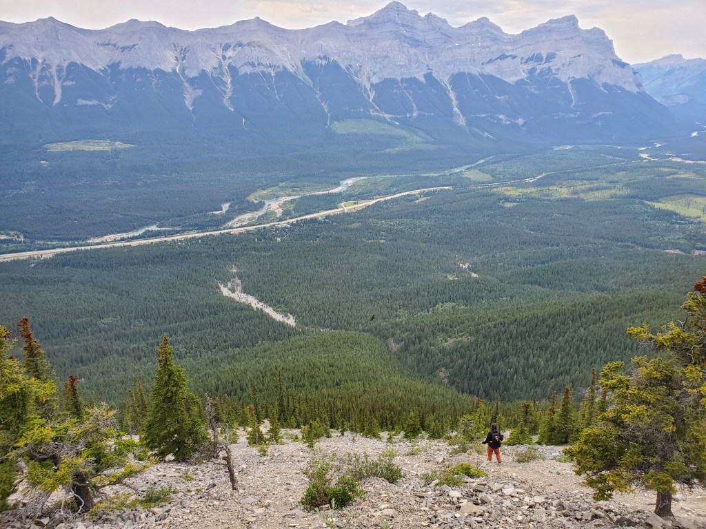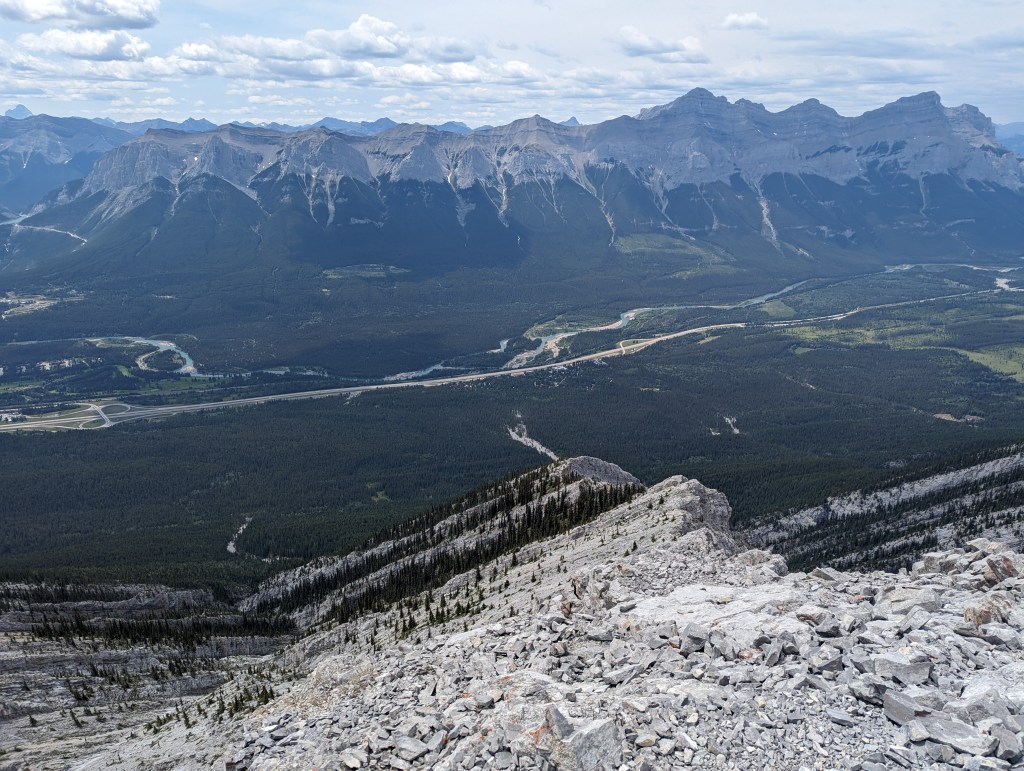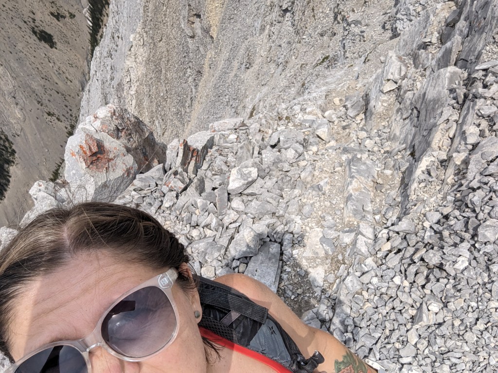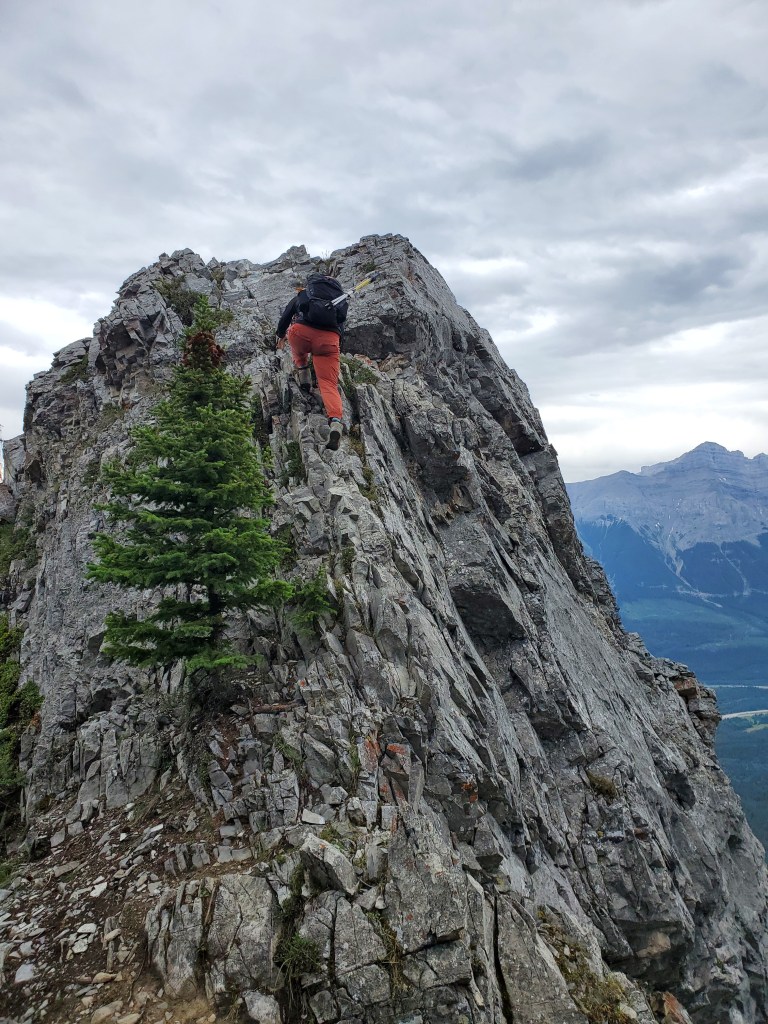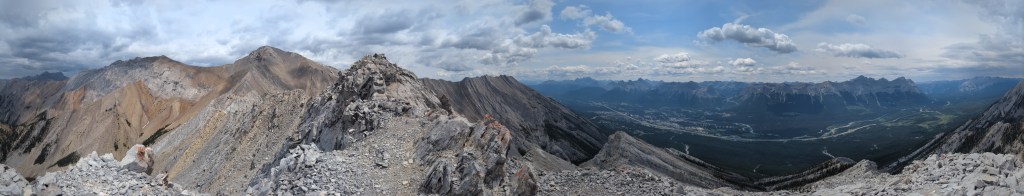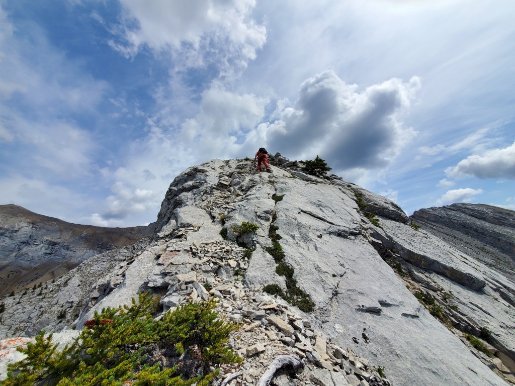 We reached the parking lot in 6 1/2 hrs, deciding next to calm our nerves with ice cream in Canmore. I enjoyed the scrambling portion of this one, but not the bushwhacking. Dan manages a phobia of heights and hates “surprise” difficulty, so didn’t particularly enjoy this one. I might bump the rating from moderate to difficult scrambling if following the ridge closely. There might be a more moderate bypass of the trickiest section, but the gentler slab off the ridge is still gravel-strewn.