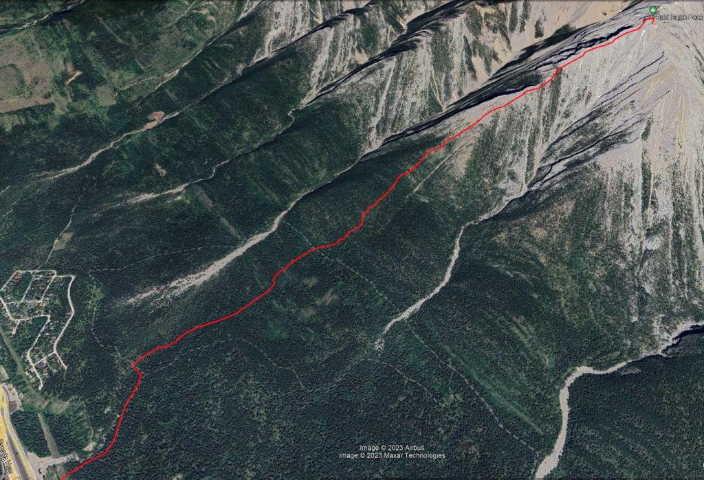 - Notes: 2 km of bushwhacking shown, but can likely be avoided. Closer to difficult scramble rating along ridge.
