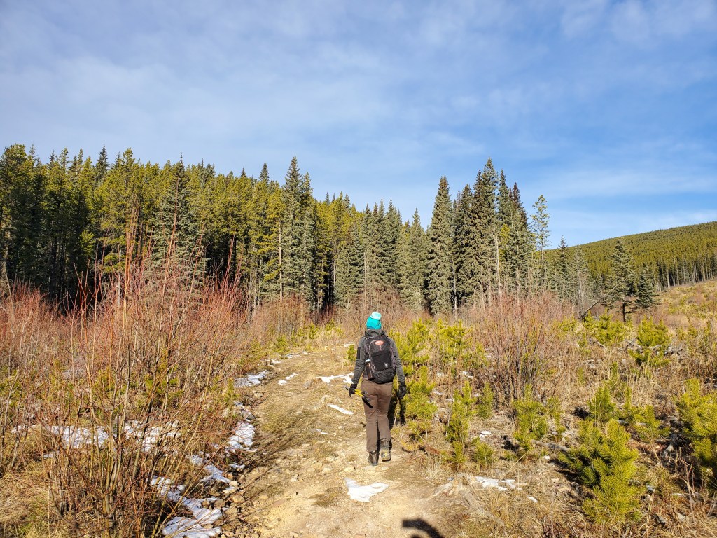Once at the trailhead, the rest of this hike was easy. I dropped a pin into Google Maps at what looked like the nearest road and then visually scanned for the trailhead once close. The trailhead was not well marked, but it’s accessible from a roadside pullout about halfway between the 48 and 49 km road markers on driver’s right (north). A large cut block meets the road, and once you’ve stepped a bit onto the grass and dirt you will see the ruts of a well-used OHV trail leading out of the clearing to the left (northwest).
