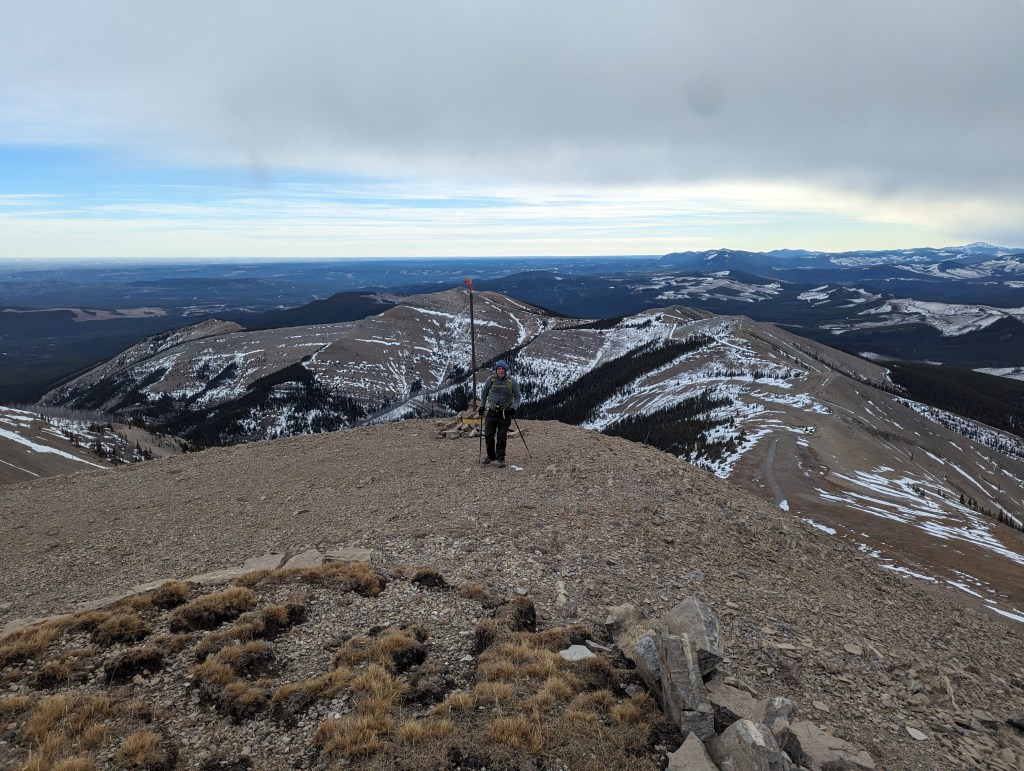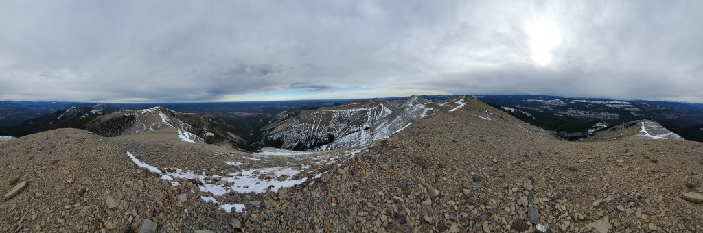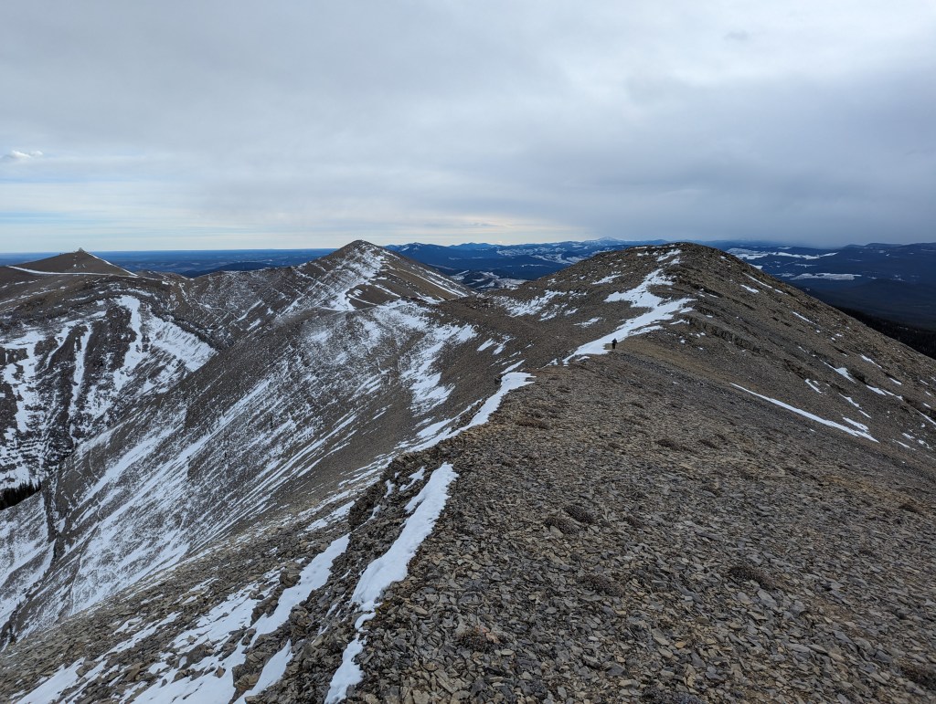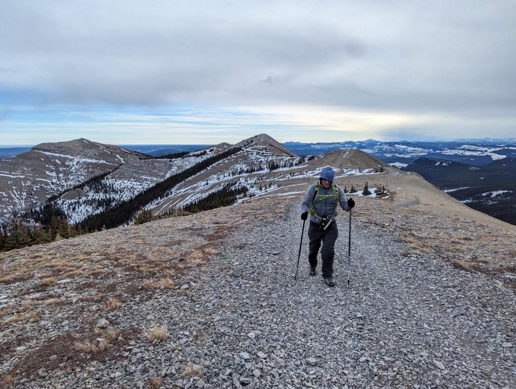 The trailhead is nondescript. There is enough space to park off to the side, out of the way of busy logging traffic.The OHV trail quickly becomes obvious once leaving the road.Some icy sections and frozen puddles were passed in the first few hundred meters, but the trail was in good condition beyond that. We packed spikes as a precaution but never needed them.The trail is fairly flat and sheltered by trees for about half the day, for which we were grateful. We were wishing we’d worn fewer layers here, but the cold wind on the ridge quickly changed our minds!At the edge of the trees we reached a Y in the trail. The OHV trail keeps right at the Y and follows the crest of the ridge. The hiking trail is off to the left. It is more direct, and bypasses unnecessary elevation loss and gain, but at the cost of potential avalanche exposure in snowier years.The OHV trail and hiking bypass met back up after a few hundred meters, at which point we continued along the ridge on the OHV trail again.We followed the OHV trail as it meandered along the winding ridge. The fire lookout is the high point in the center of this photo.Looking back at the way we came. The distant high point at center was bypassed by the hiking trail at the Y. Here the cold wind began to pick up, making us glad for our extra layers.Looking forward, the road can be seen winding around the lookout up ahead. A small firewatch structure stands at this high point, but was closed and secure for winter.Dan reaching the fire lookout. We walked directly up the steep, near part of the slope, rather than following the winding OHV trail over the col and around the back of the structure.We spent little time admiring the solar panels and grounding, eager to keep moving in the cold wind. Following the ridge in the background, we first visited the mound at the left and then continued on to the twin mounds at the right.Looking back at the fire lookout and road winding around it. We had approached from the right and tackled the slope directly. Beyond here there is no OHV trail to follow, but the route is obvious. Shallow snowdrifts presented no serious hazard, and we did not need our trail spikes, but care should always be taken in these conditions.Roughly 600 m beyond the fire lookout we reached the second high point. This one had a cairn and summit register, complete with this little green pal.We continued on past the summit register for roughly 900 m to the twin mounds. This photos is looking back from the final high point of the day. The fire lookout is to the left, the summit register is on the mound just left of center, and one half of the twin mounds is to the right (I am standing on the other twin mound).Looking forward, I am standing on the final high point visited this day.Within the measurement limitations of my GPS watch, the twin mounds are the peak of Ram Mountain. My watch measured the lookout to be at an elevation of roughly 2141 m, the summit register to be roughly 2168 m and this third high point (The twin mounds) to be roughly 2179 m. The view is about the same at all three points. Unless you are keen to bag the true summit, you can probably turn back at any high point you like.Summit panorama. The views don’t change a great deal between high points, to be honest.Returning along the bypass route, thankful to be almost at the trees and out of the wind. If snow-covered, this line across the slope would be in avalanche terrain. The OHV trail would likely still go, at the evaluation and discretion of the user.