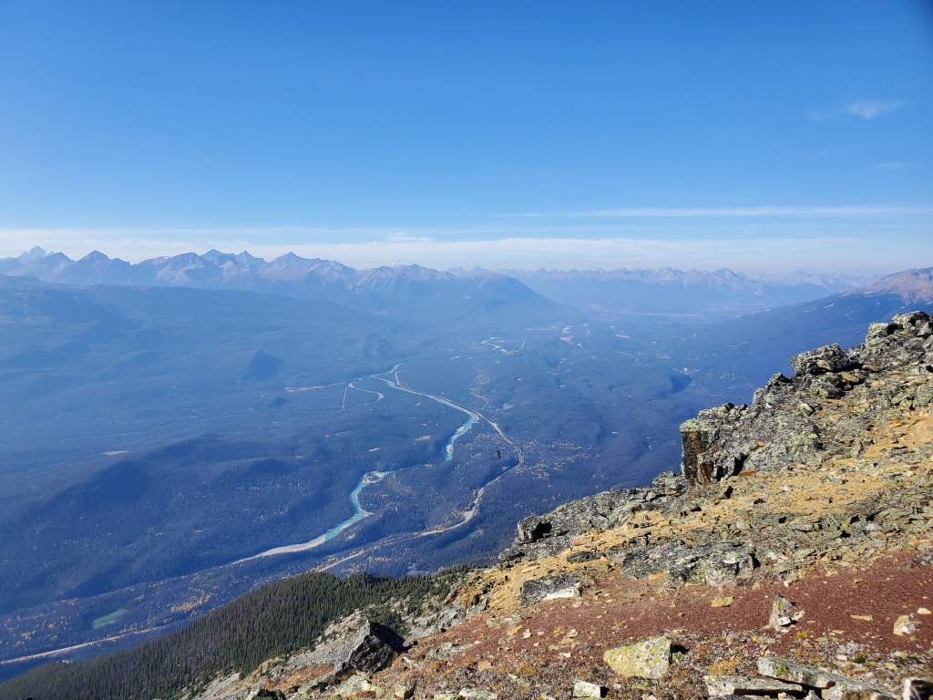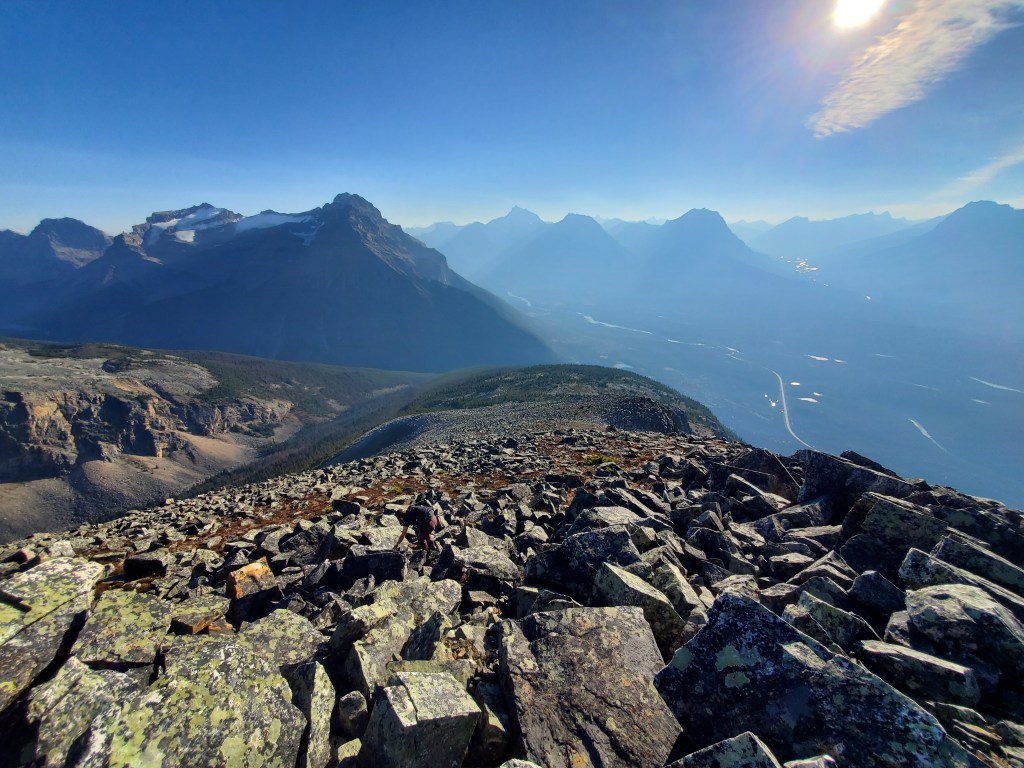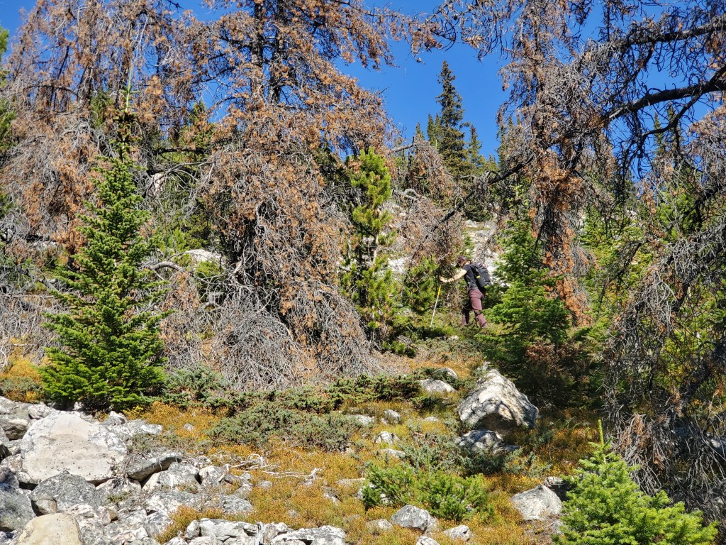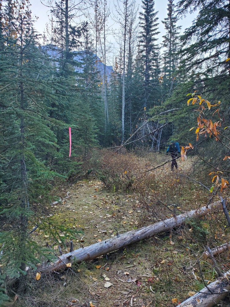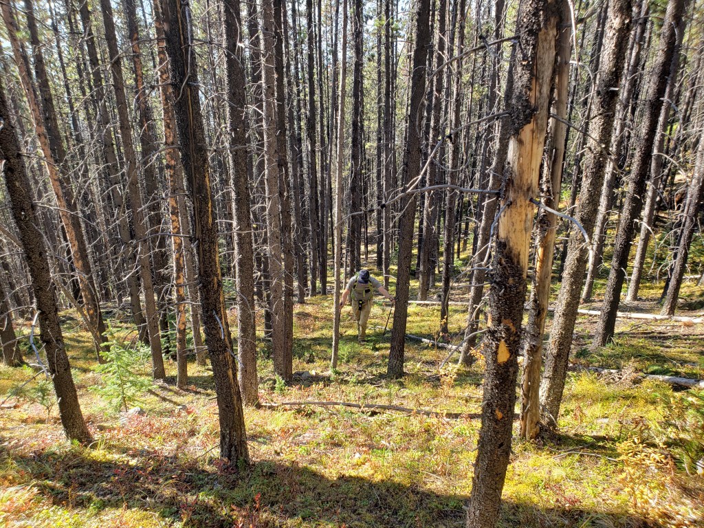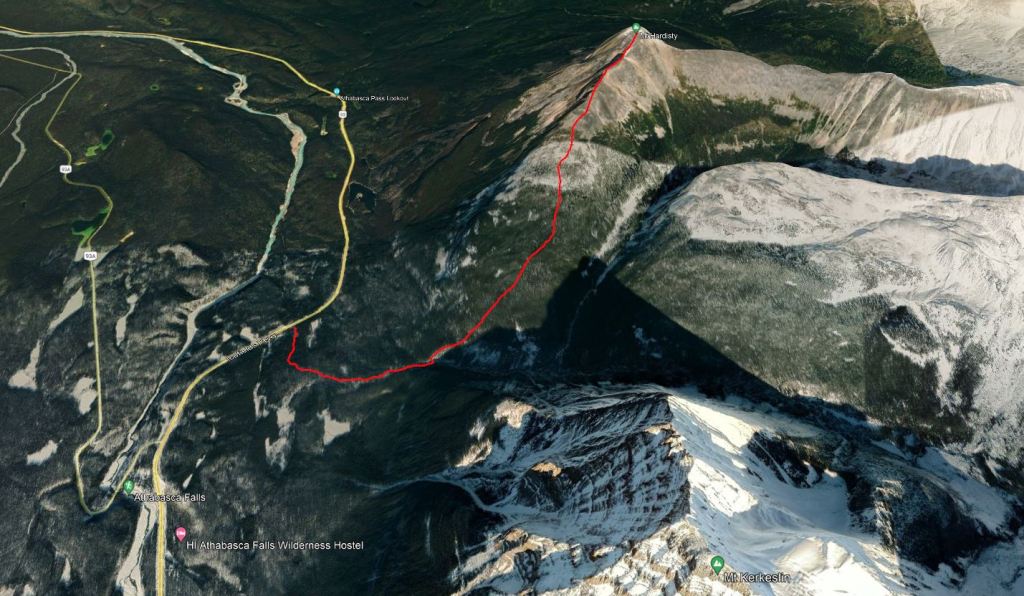 Notes: The bushwhacking is easy, but over 1000 m of elevation is gained before leaving treeline. Progress was slowed by complete failure of both of Dan’s shoes. This route will have been impacted by the Jasper Wildfire in 2024.