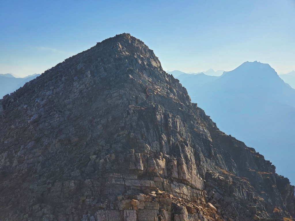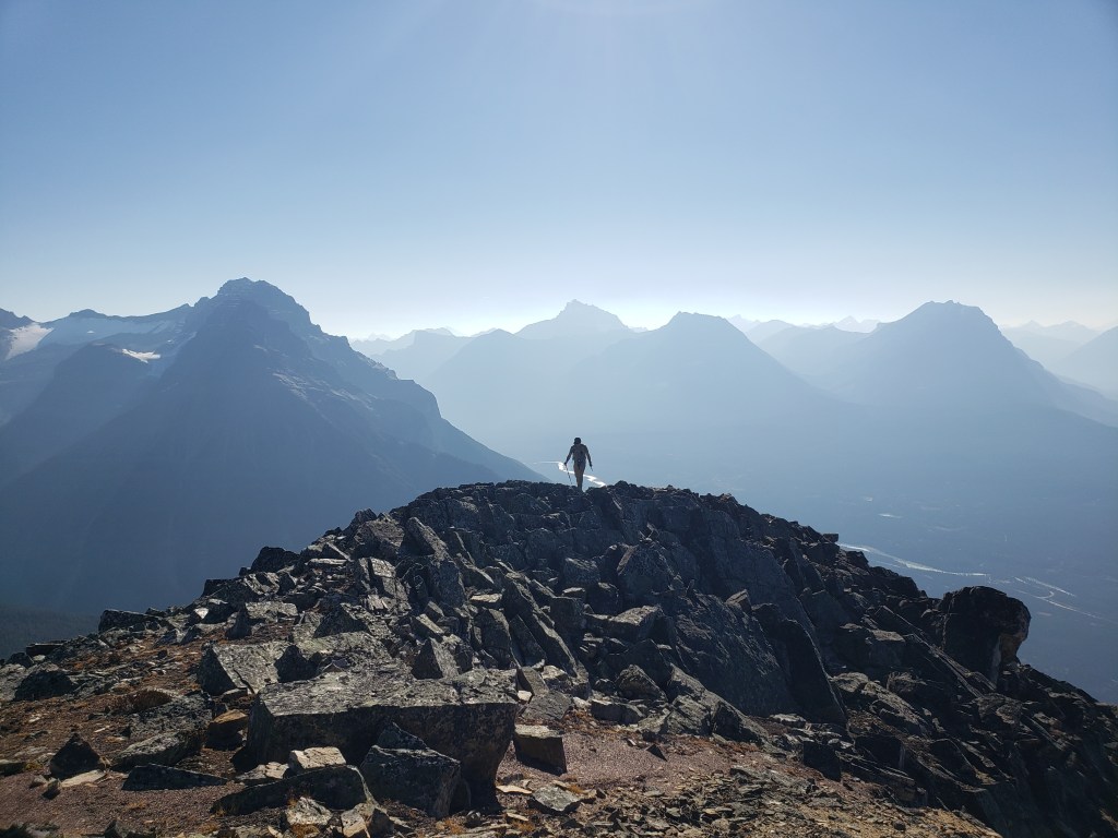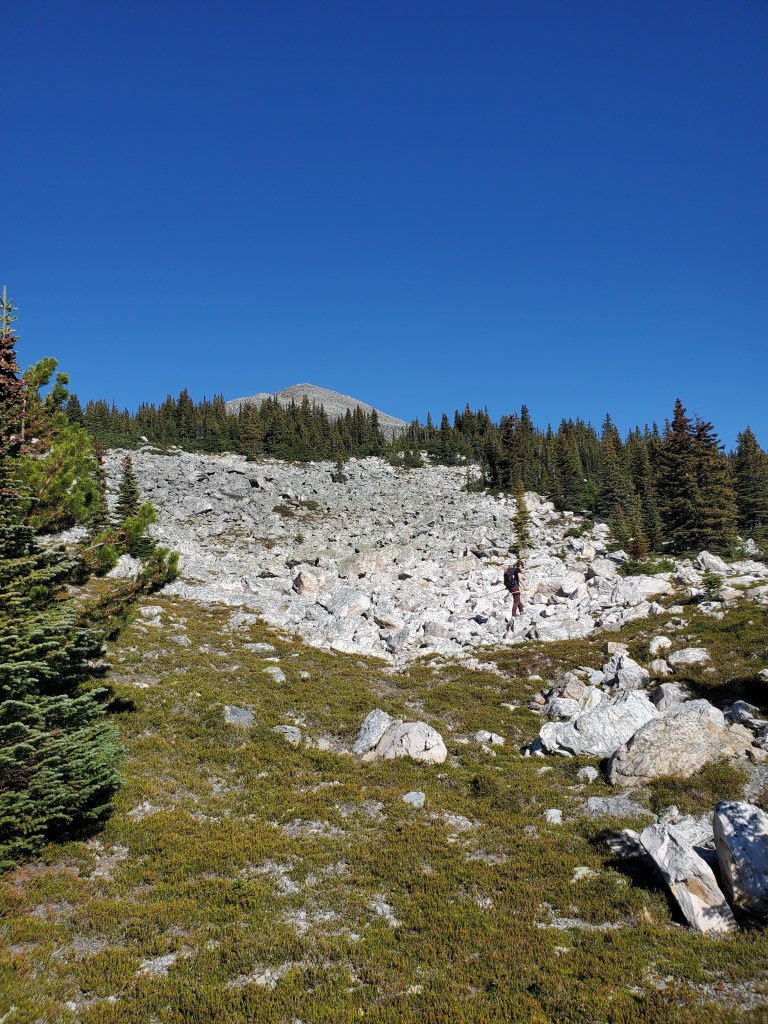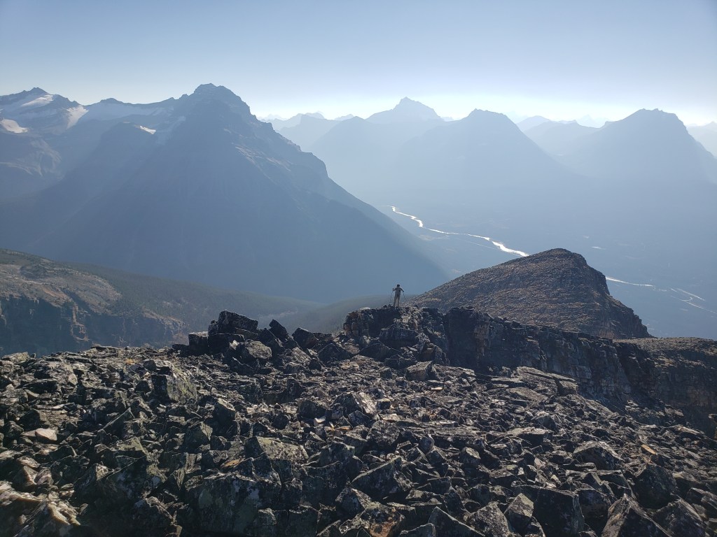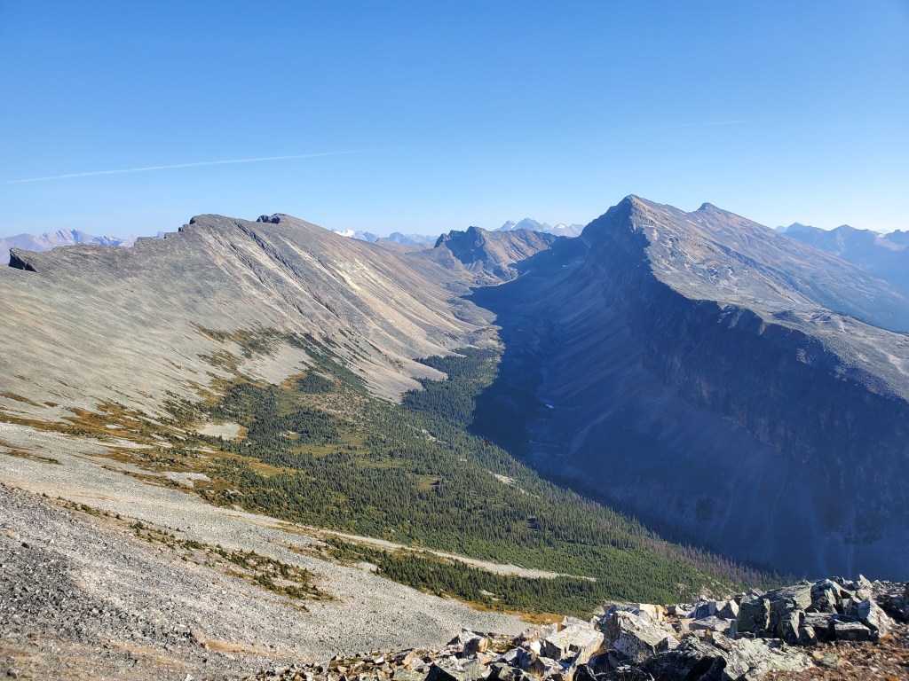 Notes: The bushwhacking is easy, but over 1000 m of elevation is gained before leaving treeline. Progress was slowed by complete failure of both of Dan’s shoes. This route will have been impacted by the Jasper Wildfire in 2024.