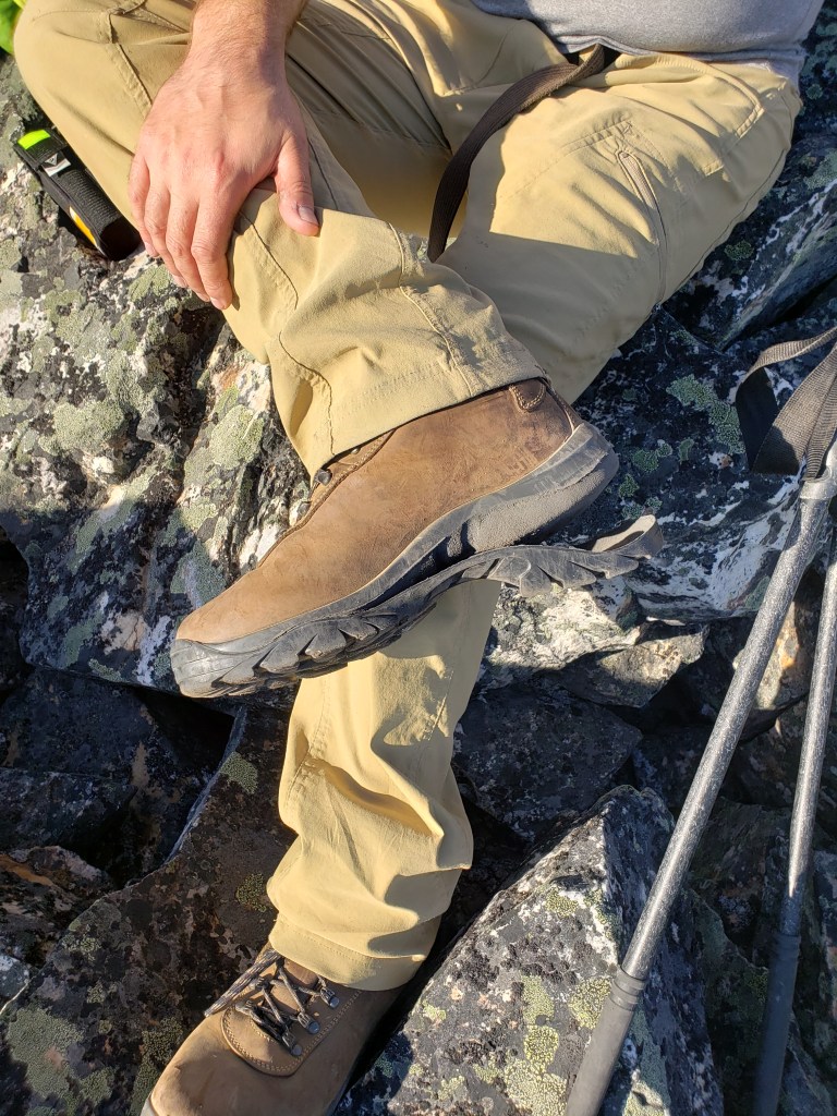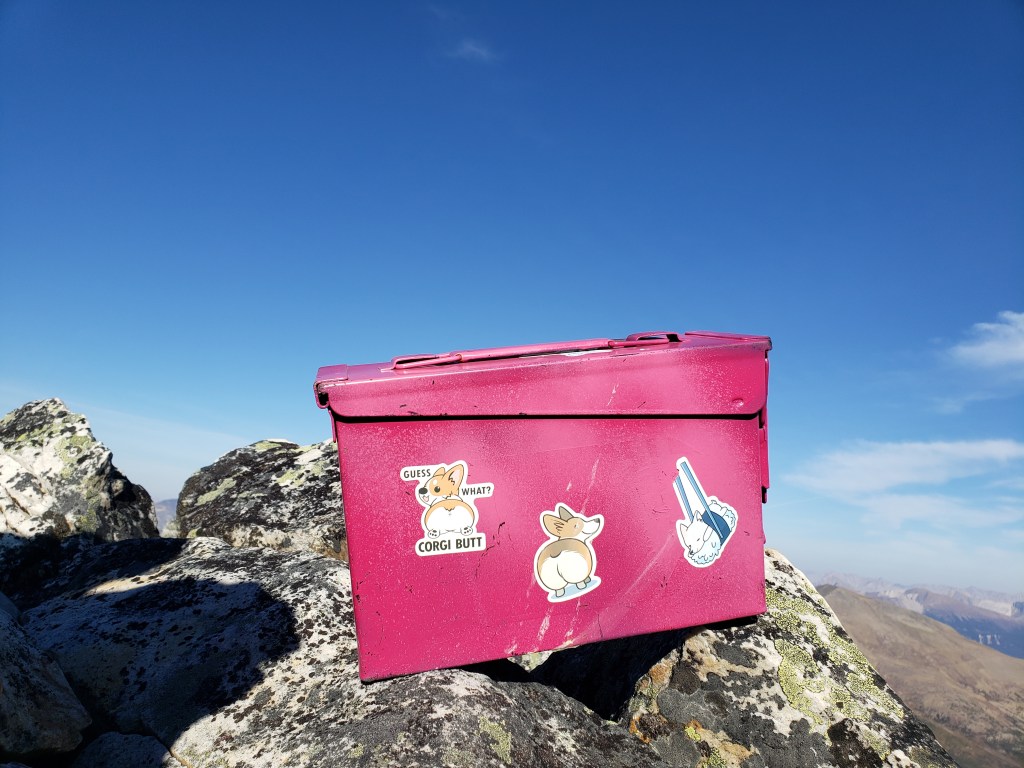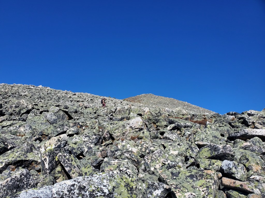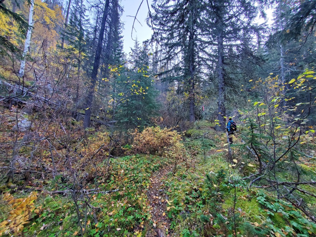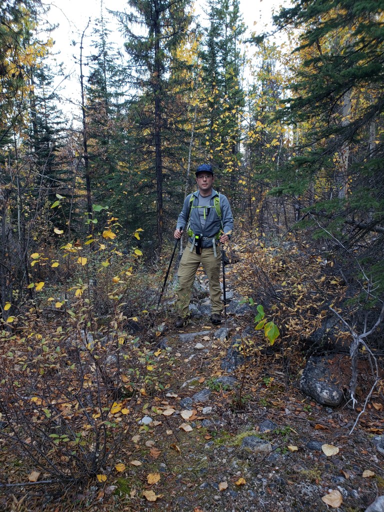 The first 200 m of the trail isn’t very clear. We tried all of the options before settling on the correct path.Once past the first 200 m we were confidently on a trail and heading in the correct direction.We reached what looked like the toe of the ridge to Hardisty as Kerkeslin edged in at the right. Here we turned left off of the trail. We had to drag ourselves up a few meters of steep, loose dirt before gaining the easy ridge. The trees were sparse and the bushwhacking was very straightforward.We passed through a few small burnt patches, but they weren’t an obstacle. The larger obstacle turned out to be the hiking boots I’d picked up for Dan just before this trip. We changed the lacing to alleviate pressure points, but he still ended up with severe blisters.After 3 hrs of only seeing tree trunks, patches of rock started to appear among the trees.Our first glimpse of Mt Kerkeslin, but not our last glimpse of trees. The terrain alternates between narrow tree belts and short stretches of talus before the summit ridge.The tree belt ahead here really was the final one, at last, and we were finally out in the autumn sunshine.Most of the summit ridge was easy scrambling on talus like this. One or two blocky sections further on might be moderate scrambling, depending on one’s choice of footing.Smoky views of Mount Kerkeslin and distant Mount Fryatt. From this point, the terrain was a mix of broken talus interspersed with easy, cracked slab sections.Looking North at the eerily bare peaks around Jasper townsite including Whistler’s Peak (center) and Pyramid Mountain (right). We couldn’t recall ever seeing so little snow, particularly for October.Looking East at Evelyn Peak (right).I poke my head over the slab to make sure Dan is still following.There are a few blocky sections of the ridge and one or two moves of moderate scrambling left before the summit.Guess what? Corgi butt! These pink ammunition boxes delight me wherever I find them.Summit panorama.Surprise toy fight!Mount Hardisty provides a perfect vantage point over Skyline Trail. The peaks at the left are: Tekarra, Centre, Excelsior, and The Watchtower. The interesting peak just right of Dan doesn’t seem to have a name yet, surprisingly.Returning the way we came. I pick my way up this blocky section of the summit ridge.Some moderate scrambling moves, but nothing too exposed.Continuing down the summit ridge, back towards the trees.Dan’s sole had been gradually peeling back over the course of the day. By this point, one sole was flopping freely and the other was starting to peel too. His blisters had been worsening over the hike and were slowing him down significantly. He used some spare string to keep his shoes together as best he could and we continued on our way.One last view of sunny Mount Kerkeslin before returning to the trees.Our shoe-related delays meant that we finished the day bushwhacking as the Sun set. I earned a couple of nice scratches on my shins, trying to step over logs in the dark. Dan never wore those hiking boots again. They had looked brand new when purchased second-hand online, and seemed in pristine condition before we set out, but fell apart as though they had been the subject of a bad resole job.