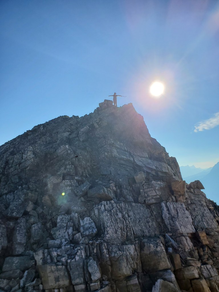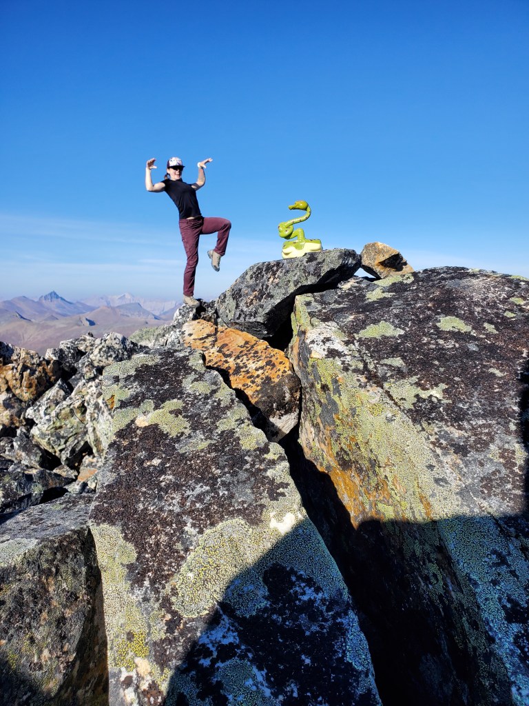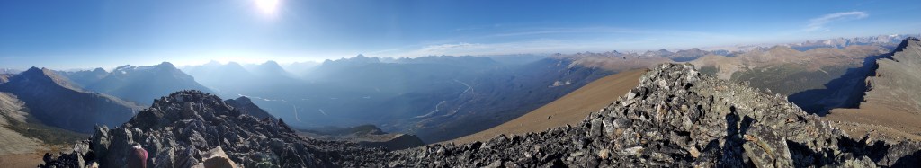 Mount Hardisty is a good choice for shoulder season or even winter, depending on conditions. 1000m of elevation is gained before leaving the trees – that’s 3 hrs before the first glimpse of surrounding views, 3 1/2 hrs before being fully out of the trees, one way! Judging by the hilarious account from Giant’s Gate, this peak is probably best avoided in mosquito season. Entries in the summit register indicated that a few parties have ascended starting from Horseshoe Lake. The entries boasted of a shorter and more pleasant ascent, but this is all of the information I gleaned.