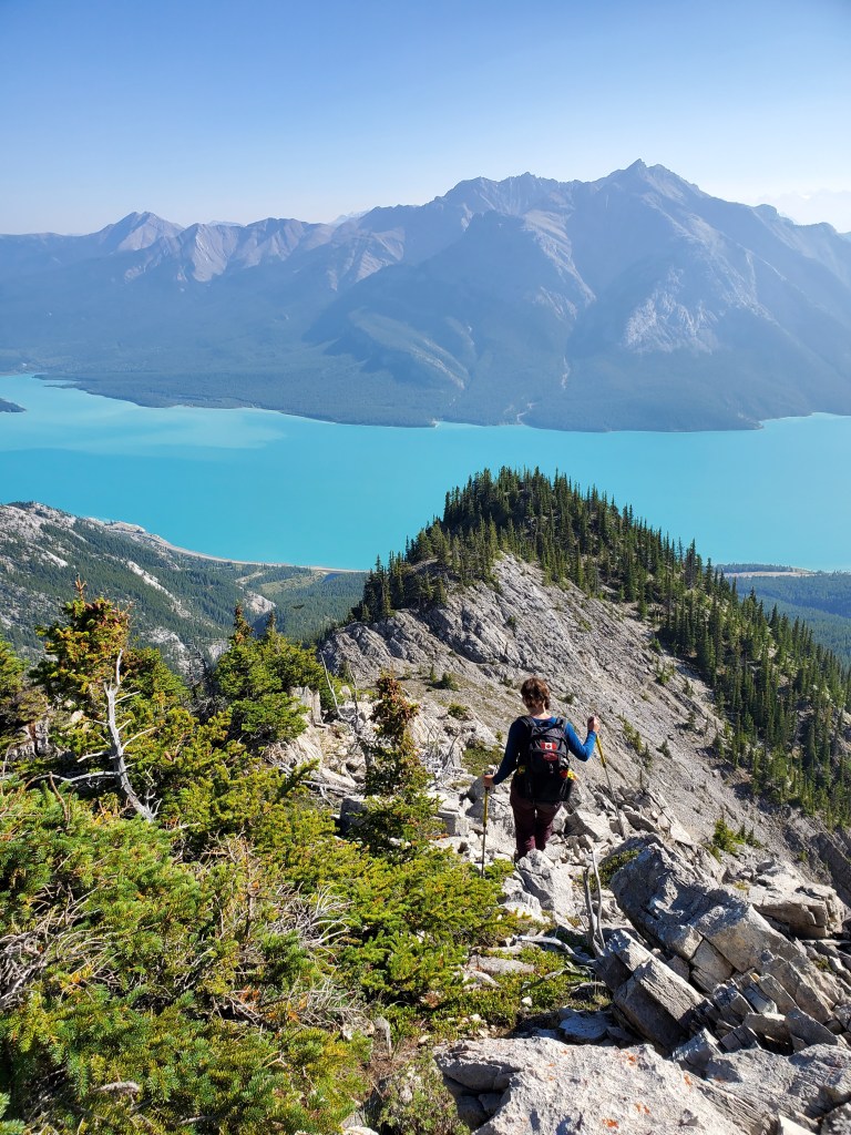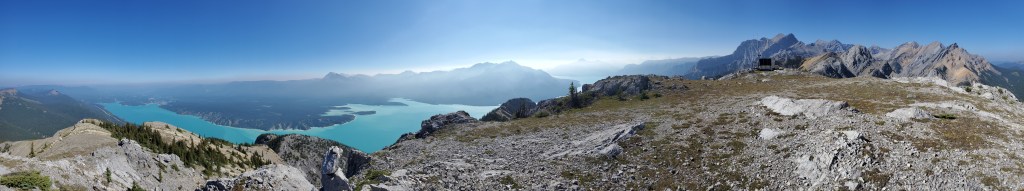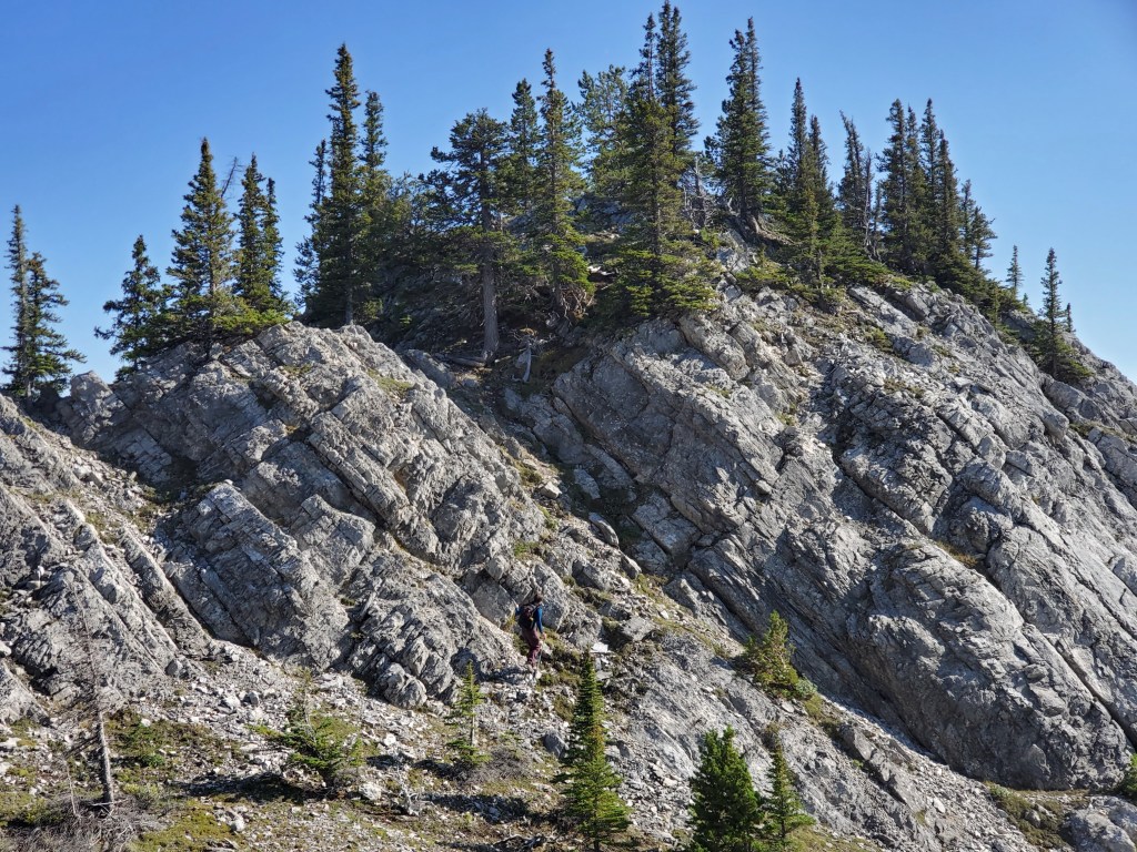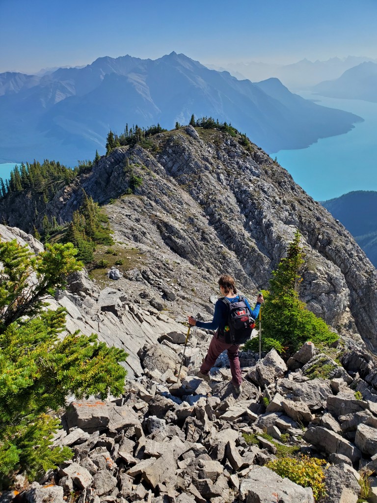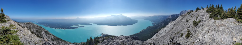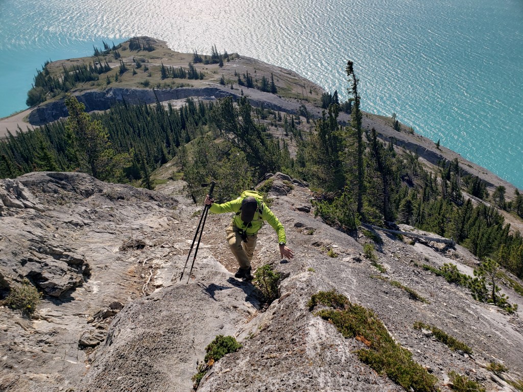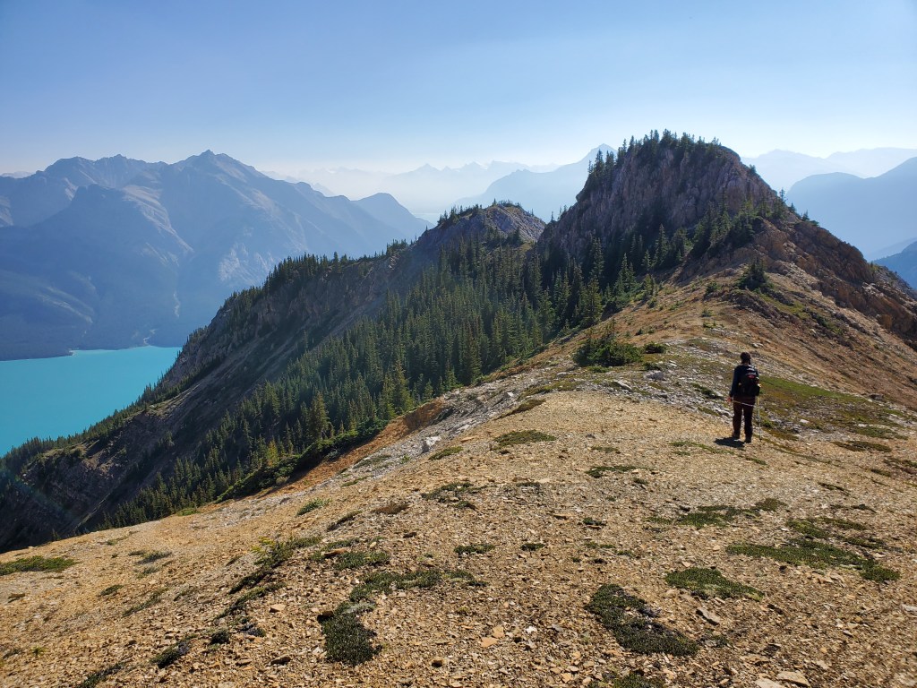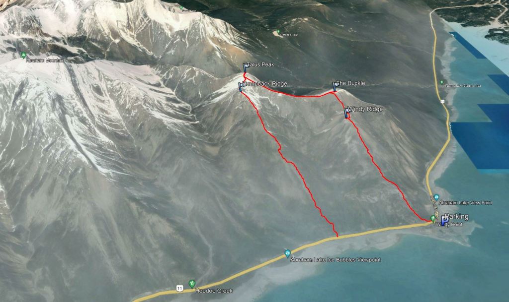 The view of Abraham Lake from the parking lot. Windy Point lives up to its name!Beginning up Windy Ridge. We picked up a trail across the highway from the driveway to the parking lot.There is no bushwhacking on the Windy Ridge portion of the loop. We were immediately scrambling up the steep ridge. The parking lot can be seen across the highway. Approaching the second hump of the ridge. There are a few moderate lines to choose up the slab and they all looked fun. It’s plain to see why there are so many climbing crags around Windy Point.We chose a line stemming up a fun corner feature.The path to this line looks well-trodden, though not necessarily by humans. All of the trees along this sheep trail are likely to hold ticks in Spring.Continuing the walk up sla-aa-ab.Dan following on some easy to moderate scrambling. The steep nature of the ridge means Abraham Lake provides an impressive backdrop for all of the photos.Approaching the third hump in Windy Ridge.Trails zig-zag through the slab making travel easier.Almost at the high point of Windy Ridge, scouting out the best line.Reaching our first peak of the day: Windy Ridge. Abraham Mountain is the large peak in the background.Summit panorama from Windy Ridge.Continuing on to The Buckle, which is the high point in this photo. A communications repeater station is barely visible. We’ll be traversing around the bottom of the summit block to the left and then climbing the left side of the face.The path traversing around the left of The Buckle becomes obvious once close.The traverse was across a much gentler slope than our initial impression had us believing.Scrambling the difficult line up The Buckle. It’s worth noting that I have been rock climbing for several years and this line is well within the grade I am confident climbing. Not everyone should feel comfortable on this terrain, and that’s OK. Unconfirmed reports indicate that there may be an easier line much further left, behind the peak. It’s also possible to simply skip this peak and continue straight on to Talus Peak.Dan follows me up the difficult scramble.You can almost pinpoint the instant he realizes he married a goat, not a woman.Reaching our second peak of the day: The Buckle. Taking in the scenic view of mobile radio equipment framed by Abraham Mountain. This is not a cell tower. Dipole antennas like these would typically be used for radio by first responders such as fire fighters or SAR.Sublime views over the intensely turquoise waters of Abraham Lake.The wind did not let up; in fact it stole the lid to Dan’s sandwich container! With it the wind carried in smoke from the Chetamon Wildfire in Jasper.Summit panorama from The Buckle.Downclimbing The Buckle via the same line we had ascended.Glancing back up at Dan as he follows the difficult downclimb of The Buckle.Continuing on to Talus Peak (right).As we grew closer, the walk up to the peak came into view. The terrain up Talus Peak was all easy.Reaching our third peak of the day: Talus Peak. Reviewing the summit register, this peak sees a few parties per year.Summit panorama from Talus Peak.Dan stands on Talus Peak. In the background is The Buckle (center) and Windy Ridge (right). It can be seen where an alternate ascent route might exist up the back of The Buckle. In the distance, on the other side of Abraham Lake, is Kista Peak. Continuing on to Humpback Ridge. I expected this last part to be somewhat of a dull bushwhack, but it might have been the best scrambling of the day. There’s a lot of variety to this ridge!Feeling cute, might delete later.Crossing over the first hump and continuing down to the next one.Looking back at the first hump, presumably the peak of Humpback Ridge (and our fourth peak of the day).Views over Abraham Lake were largely unobscured by trees. There was less bushwhacking than I expected.I casually continue down the next hump.Glancing down the side of Humpback Ridge. The route won’t take us this way – we’ll continue along the ridge.Looking back up as Dan follows me down the ridge.I near the bottom of this hump.Glancing back up at Dan. The line appears much steeper from below. The previous photo better shows the actual terrain.Making our way over and up the next hump of the aptly-named Humpback Ridge.Looking across our circuit at The Buckle (left) and Windy Ridge (right).Downclimbing another hump (I’ve lost track of how many this is). It’s not as steep as it looks – slugform is just my natural climbing style.Hiking over the last hump before descending back to the valley.Leaving Humpback Ridge and entering the trees. There is about 400 m of bushwhacking still to get back to the highway, but it was reasonably intuitive to follow the slope downhill and a few clearings along the way made it easy to keep our bearings.Looking back up at the bushwhack. We came from the treed hump at the left.