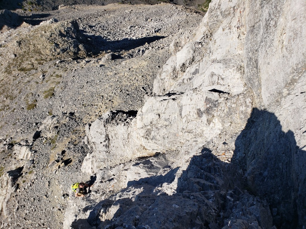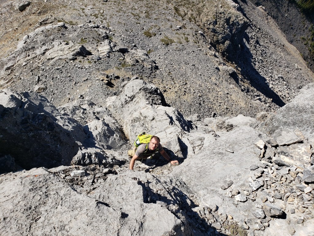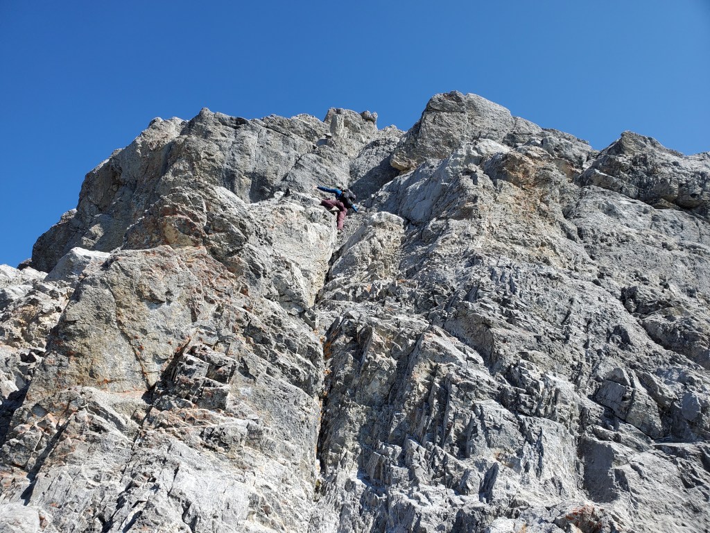 The optional scramble up The Buckle is difficult and exposed. Without this section, the route still has several moves of moderate scrambling, though the moves are a fun combination of slab climbing and stemming through corner features.