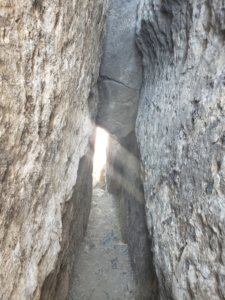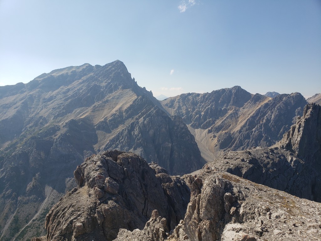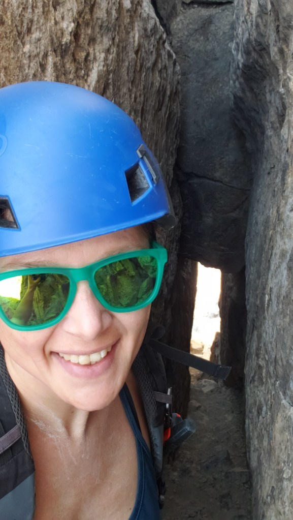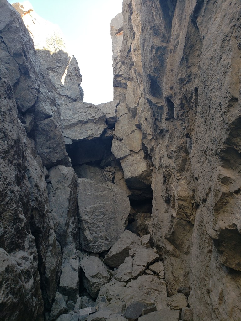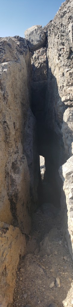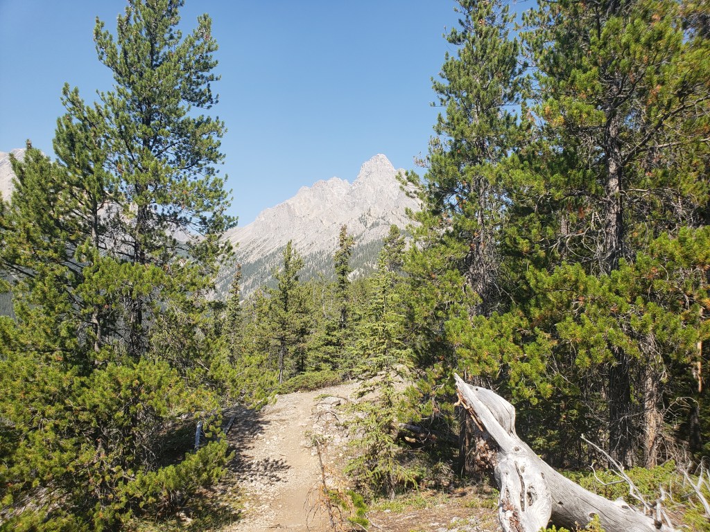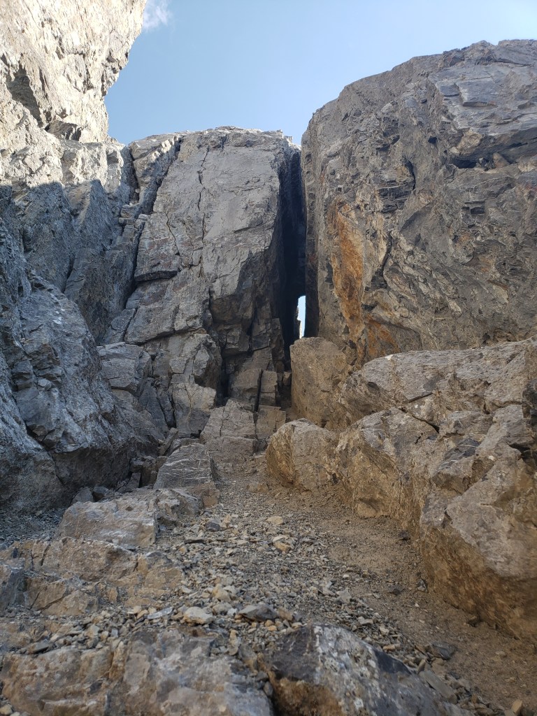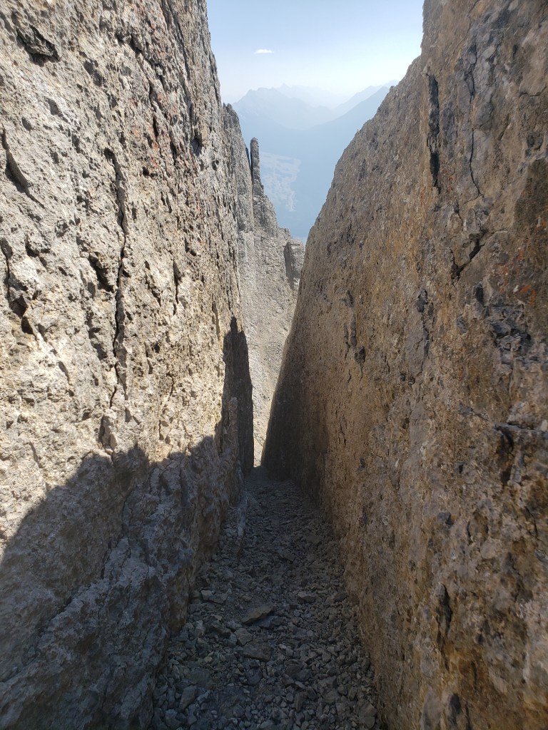 Immediately from the trailhead I had to rock-hop across a creek. The water was low and this was easy to cross. A nice bridge has been built, and it lies on the shoulder of the creek (for reasons I don’t know). This photo is looking back at the unused bridge and empty parking lot.Just over 1 km from the trailhead, the trail turns right and starts rising out of the trees. It was a hot, smoky September long weekend and even this gentle elevation gain had me sweating.Once up the toe of Mount Edith, the trail heads back into good tree cover for almost 2 km. Mount Edith comes into view through a gap in the trees. I followed the trail under the peaks to the far side of Mount Edith.Just before highest point between Mount Cory and Mount Edith, I turned right and started trending up the slope toward the tallest of Edith’s three peaks. From the shoulder of Edith, the views of Mount Louis (right) are extraordinary. Mount Fifi just pokes up to the left of Louis.I followed a trail up the slope of Mount Edith and under the cliffs of the first peak until I reached the south-facing chimney in Kane’s route description. A cairn at the right side of this photo confirmed I was at the correct chimney. I took the right-hand chimney.The chimney has tall, textured walls that offered secure hands. I found I had to brace my feet against the walls too to keep them from sliding out on the loose gravel. A larger person might find this a bit more snug, and a bit more secure.The chimney wasn’t as much of a squeeze as I expected. I’m turned sideways in this photo to show the terrain only – it wasn’t necessary to turn sideways to ascend the chimney. I’m only 5’4″ though, so a larger scrambler may have a different experience.Exiting the chimney and moving across to the peak was only moderate scrambling. At the notch described by Kane, where others have reported needing to jump, I simply downclimbed to where it narrows, and then moved securely across the gap. Here I am at the peak, with impressive Mount Louis in the background.To the southeast are Mount Norquay (left), Mount Rundle (distant left) and Sulphur Mountain (distant center).From the first peak I stemmed back down the chimney and then continued along the trail under the cliffs to the middle peak. The scramble up to the second peak was moderate by this route and the elevation loss/gain was only about 30 m. The view from this peak is almost identical to the first peak, but it was virtually no effort to reach.Looking west to Mount Cory from the middle peak of Mount Edith.Looking southeast to the third peak of Mount Edith. Mount Norquay is to the left. I descended the middle peak via the large scree gully to the south and then walked across to the base of the third peak.The cave mentioned by Kane was obvious, and was much bigger than I expected from his account. Most scramblers should be able to pass through without issue. A steep trail leads up to the mouth.The cave slopes upward with one small rock step to scramble up.The cave was very roomy, even more so than the chimney up the first peak.Zig-zagging southward to the south ridge was easier to navigate thanks to many cairns. I made sure to look back at my route for the return trip. This photo is of the two large rocks wedged behind a flake which I had to heave myself up and over, then exit to the left. The final scramble up the south ridge didn’t feel that exposed and I would probably only put it at upper-moderate scrambling.Reaching the third peak of Mount Edith, looking North to Edith’s other peaks and Mount Louis.I retraced by steps back to the cave. This shot is looking back down it.Looking out of the mouth of the cave at the gully I had descended from the middle peak. The gully was loose and steep, certainly not something I would want to scramble with others above me.From the bottom of the cave I followed a drainage back down to the main trail, then hiked back out the way I’d come. Here I am on the main trail, with the south peak in the background.By the time I reached the toe of Mount Edith again, the day had cooled slightly and the smoke had cleared. Here is a better shot of Mount Rundle (left) and Sulphur Mountain (center). The Bow River winds around Sulphur Lakes.
