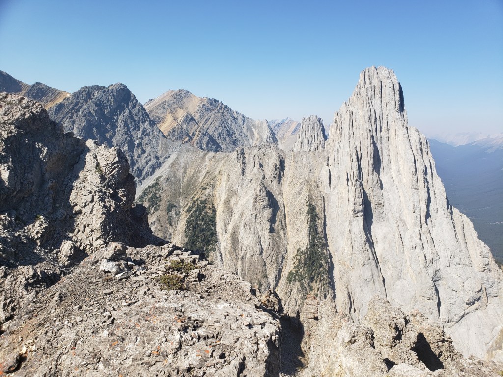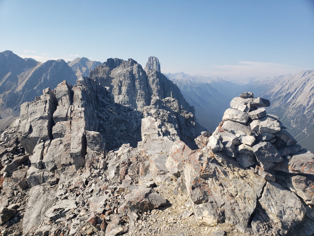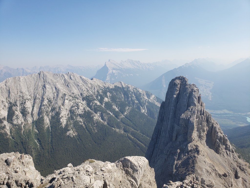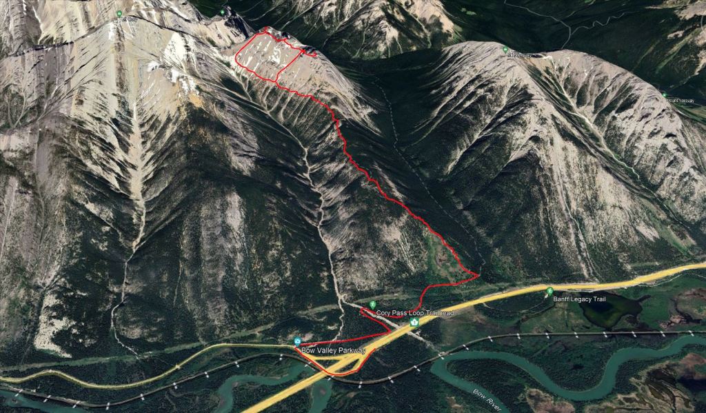 Notes: Trip report is for all three peaks. The scrambling is upper-moderate for a small-to-medium sized person but larger people may need to modify their route choice. The Bow Valley Parkway (Hwy 1A) is often closed to vehicles but can still be biked. This trip report includes roughly an extra 3 km of walking to and from the highway due to this closure.