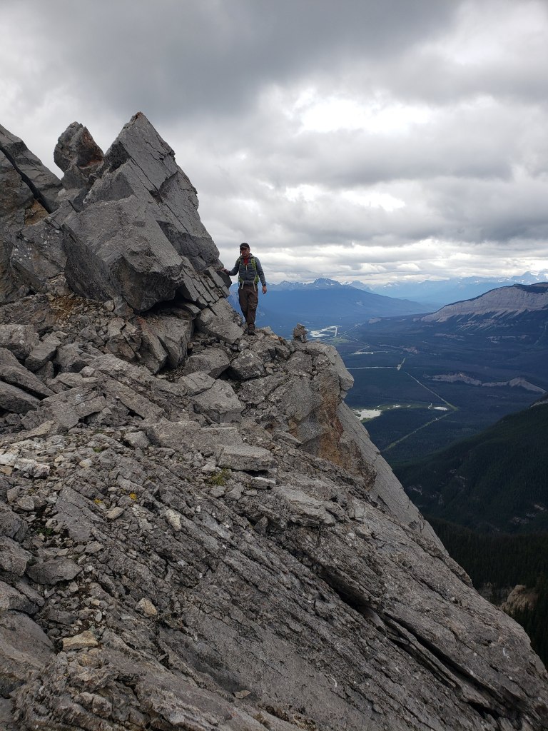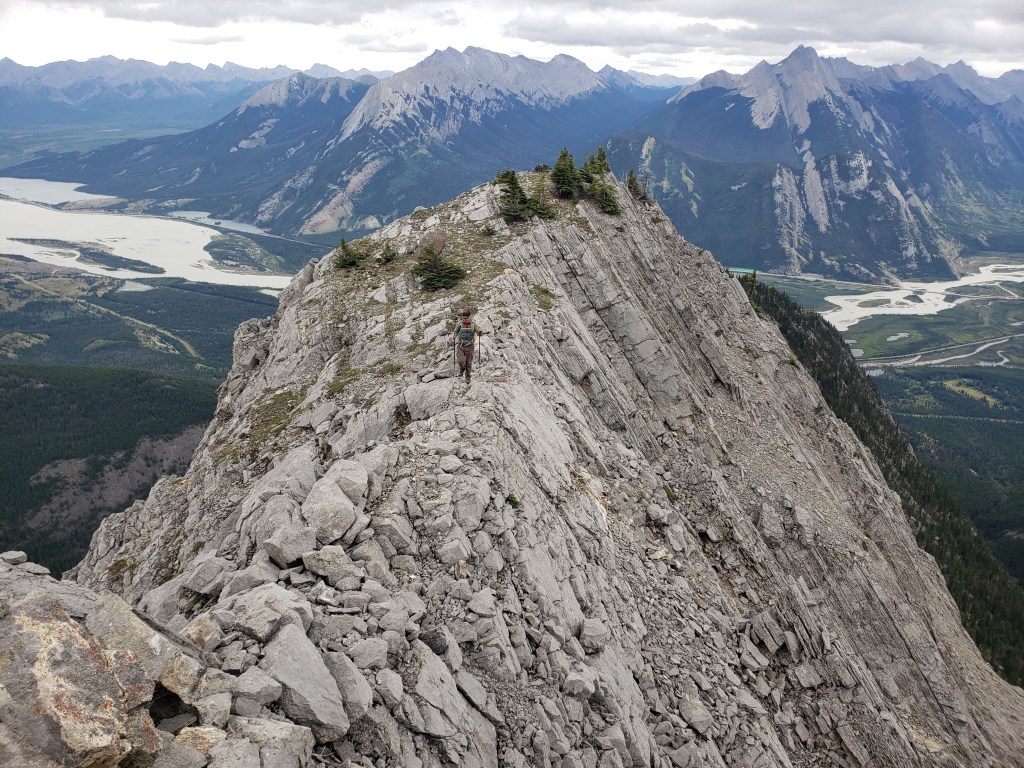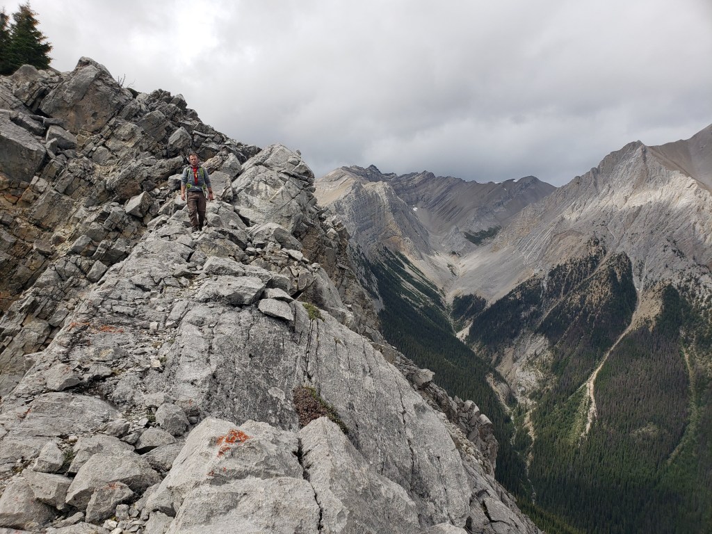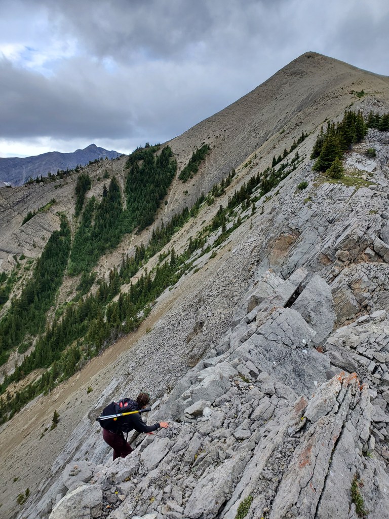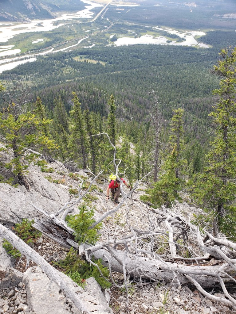 Just past the toe of Esplanade Mountain, a driveway leads to the Snaring warden station. We parked just off the driveway, taking care to park in a bald patch, not in the long dry grass that could be ignited by a warm engine. The ascent ridge of Esplanade Mountain can be seen in the background. The ridge is gained to the left, out of view.We walked past the warden station and followed a path into the forest. 2023 Update: Aerial photos show a small green patch around the still existing warden station, but everything surrounding and beyond the warden station was destroyed about a week after the photos you are seeing were taken.We scouted for an easy crossing over the creek to our left and found a fallen tree to shimmy across.It was about 1 km of bushwhacking to gain the ridge. A meadow or two are passed along the way, depending on route choice.We encountered a small cliff band in the trees. There is likely an easier place to gain it, I just liked the look of this corner feature.Almost on the ridge, the slope gets a little steeper. Game trails helped us along.We finally gained the ridge. Here the trees thinned out and the line up the ridge started to come into view.The ridge gets nice and steep immediately. The scree was minimal and solid slabs of rock made travel more pleasant.Gazing across the Athabasca River to Morro Peak (center) in front of its larger parent peak, Hawk Mountain.In my opinion, this section of difficult scrambling is the crux of the trip. The 4 m cliff is encountered early in the day. I traversed starting at the scrubby shrub to the right, then moved left and up, ending just above the cairn. It requires balanced moves across slab. Two difficult and more exposed sections are coming up still, but I found this part the most featureless and, hence, most difficult.Traversing left towards a cairn. I spotted a small piece of cordelette tied to a tiny tree above this line. I’m assuming this is only to mark the line. This should go without saying, but: the trees above this cliff are not of adequate size to serve as a tree anchor. Continuing up the ridge along undulating slab.Dan follows me up the steep ridge of Mount Esplanade. The ridge seen to the right is The Palisade.Did I not mention that this is a difficult scramble? Tee hee! This is the second section of difficult scrambling. We climbed the line straight above me in this photo, trending to the right at the top. The climb was big moves up the blocky face – easier than it looks, but still exposed.The summit of Esplanade Mountain finally comes into view. The steep, narrow ridge leading to the peak will be the third difficult scrambling section of the day.Jasper Lake is seen to the southeast. The sharp, unmistakable face of Roche Miette marks the north edge of the Miette Range.To the northeast is eye-catching Gargoyle Mountain. This peak may be best recognized from older $10 notes. Mount Esplanade itself is featured on the note too, directly in front of Gargoyle.As the ridge narrows, the trail passes adjacent to large slab cliffs. The trail wasn’t present throughout, but was helpful when available.We begin the final section of narrow ridge before the peak.As the ridge narrows, things get a bit more interesting.This is the third section of difficult scrambling. Cairns guided us around an impassible section along the crest of the ridge. We downclimbed to a thin traverse around a corner. The traverse is only a few meters long.Dan reaches the end of the traverse. A small cairn next to Dan marks the route.Nearing the end of the narrow ridge. Views to the southeast include the Miette Range (distant left), Jacques Range (center-left), and Colin Range (center-right).The final push to the summit was the only real scree-slog of the day, and it was comparatively easy.We reached the peak of Esplanade Mountain! Cliff Mountain is in the background to the left.Another shot of Gargoyle Mountain. The ridge beyond it is Roche de Smet. A keen eye might see what we soon spotted: A red water-bottle containing the summit register.Summit panorama from Esplanade Mountain (featuring me retrieving the summit register).The previous entry in the summit register was from only a month prior, so the register likely wasn’t lost for long. I tried to better bury it in the summit cairn when we left. At the right of this photo is the toe of Chetamon Mountain, and behind it is The Palisade. The distinctly pyramid shaped mountain behind The Palisade is, you guessed it, Pyramid Mountain.Another shot of Chetamon Mountain. Its peak is slightly further right than the edge of this photo.After enjoying the views at the peak, we began our return trip along the narrow ridge section.Looking back for one last glimpse of the peak.I reach the start of the traverse section.Dan follows behind me through the traverse. The previous photo better shows the fall potential here.Reaching the end of the narrow ridge, nerves perhaps a bit worse for wear.Continuing forward down the ridge. Aerial photos from 2023 show strips of green along this section of ridge. The islands of trees in these steep slab cliffs make it hard to say whether any of these green patches would be on the route, or even accessible.Dan downclimbing the exposed, blocky section.I knew exactly where I was on the descent when I spotted the little piece of cordelette wrapped around a scrawny tree trunk (right). It’s the featureless cliff traverse! Dan snapped this shot of me stretching to span and shift my weight across the crack.Dan lowers himself onto the start of the downclimb. The moves are tricky, but it’s certainly less airy than the ridge traverse.