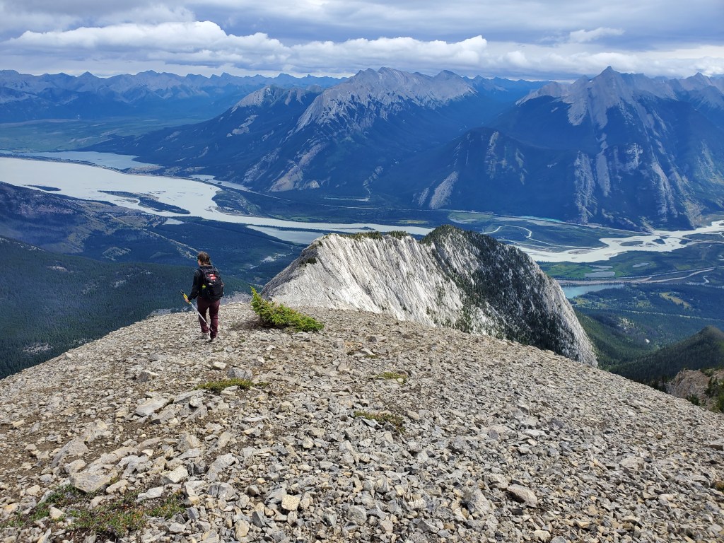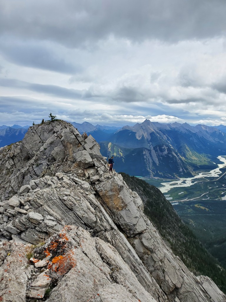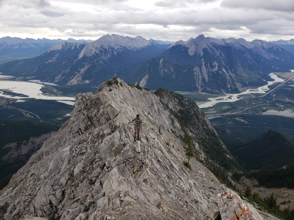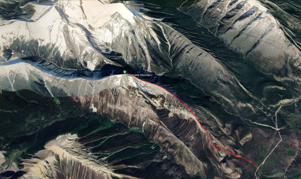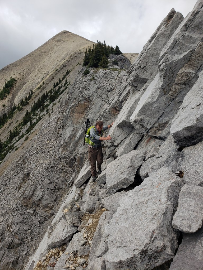 Just past the toe of Esplanade Mountain, a driveway leads to the Snaring warden station. We parked just off the driveway, taking care to park in a bald patch, not in the long dry grass that could be ignited by a warm engine. The ascent ridge of Esplanade Mountain can be seen in the background. The ridge is gained to the left, out of view.We walked past the warden station and followed a path into the forest. 2023 Update: Aerial photos show a small green patch around the still existing warden station, but everything surrounding and beyond the warden station was destroyed about a week after the photos you are seeing were taken.We scouted for an easy crossing over the creek to our left and found a fallen tree to shimmy across.It was about 1 km of bushwhacking to gain the ridge. A meadow or two are passed along the way, depending on route choice.We encountered a small cliff band in the trees. There is likely an easier place to gain it, I just liked the look of this corner feature.Almost on the ridge, the slope gets a little steeper. Game trails helped us along.We finally gained the ridge. Here the trees thinned out and the line up the ridge started to come into view.The ridge gets nice and steep immediately. The scree was minimal and solid slabs of rock made travel more pleasant.Gazing across the Athabasca River to Morro Peak (center) in front of its larger parent peak, Hawk Mountain.In my opinion, this section of difficult scrambling is the crux of the trip. The 4 m cliff is encountered early in the day. I traversed starting at the scrubby shrub to the right, then moved left and up, ending just above the cairn. It requires balanced moves across slab. Two difficult and more exposed sections are coming up still, but I found this part the most featureless and, hence, most difficult.Traversing left towards a cairn. I spotted a small piece of cordelette tied to a tiny tree above this line. I’m assuming this is only to mark the line. This should go without saying, but: the trees above this cliff are not of adequate size to serve as a tree anchor. Continuing up the ridge along undulating slab.Dan follows me up the steep ridge of Mount Esplanade. The ridge seen to the right is The Palisade.Did I not mention that this is a difficult scramble? Tee hee! This is the second section of difficult scrambling. We climbed the line straight above me in this photo, trending to the right at the top. The climb was big moves up the blocky face – easier than it looks, but still exposed.The summit of Esplanade Mountain finally comes into view. The steep, narrow ridge leading to the peak will be the third difficult scrambling section of the day.Jasper Lake is seen to the southeast. The sharp, unmistakable face of Roche Miette marks the north edge of the Miette Range.To the northeast is eye-catching Gargoyle Mountain. This peak may be best recognized from older $10 notes. Mount Esplanade itself is featured on the note too, directly in front of Gargoyle.As the ridge narrows, the trail passes adjacent to large slab cliffs. The trail wasn’t present throughout, but was helpful when available.We begin the final section of narrow ridge before the peak.As the ridge narrows, things get a bit more interesting.This is the third section of difficult scrambling. Cairns guided us around an impassible section along the crest of the ridge. We downclimbed to a thin traverse around a corner. The traverse is only a few meters long.Dan reaches the end of the traverse. A small cairn next to Dan marks the route.Nearing the end of the narrow ridge. Views to the southeast include the Miette Range (distant left), Jacques Range (center-left), and Colin Range (center-right).The final push to the summit was the only real scree-slog of the day, and it was comparatively easy.We reached the peak of Esplanade Mountain! Cliff Mountain is in the background to the left.Another shot of Gargoyle Mountain. The ridge beyond it is Roche de Smet. A keen eye might see what we soon spotted: A red water-bottle containing the summit register.Summit panorama from Esplanade Mountain (featuring me retrieving the summit register).The previous entry in the summit register was from only a month prior, so the register likely wasn’t lost for long. I tried to better bury it in the summit cairn when we left. At the right of this photo is the toe of Chetamon Mountain, and behind it is The Palisade. The distinctly pyramid shaped mountain behind The Palisade is, you guessed it, Pyramid Mountain.Another shot of Chetamon Mountain. Its peak is slightly further right than the edge of this photo.After enjoying the views at the peak, we began our return trip along the narrow ridge section.Looking back for one last glimpse of the peak.I reach the start of the traverse section.Dan follows behind me through the traverse. The previous photo better shows the fall potential here.Reaching the end of the narrow ridge, nerves perhaps a bit worse for wear.Continuing forward down the ridge. Aerial photos from 2023 show strips of green along this section of ridge. The islands of trees in these steep slab cliffs make it hard to say whether any of these green patches would be on the route, or even accessible.Dan downclimbing the exposed, blocky section.I knew exactly where I was on the descent when I spotted the little piece of cordelette wrapped around a scrawny tree trunk (right). It’s the featureless cliff traverse! Dan snapped this shot of me stretching to span and shift my weight across the crack.Dan lowers himself onto the start of the downclimb. The moves are tricky, but it’s certainly less airy than the ridge traverse.