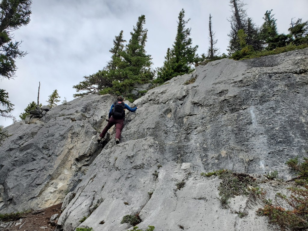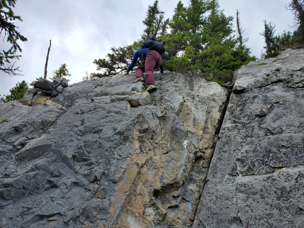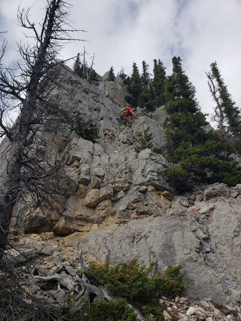 Esplanade Mountain is some of the best quality scrambling in Jasper. Unlike many peaks around Jasper, Esplanade has minimal scree and no talus. There are about three sections of difficult scrambling, but I found these to be fun moves on good quality rock. Sadly, lightning ignited a wildfire on Chetamon Mountain (the next peak west of Esplanade) about three days after our trip. The 2022 Chetamon Wildfire ultimately spread east across Esplanade, Gargoyle, and Roche de Smet. Updated aerial photos show only a few sections of green left on the steepest part of the ridge and around the warden station. Virtually every other tree along the route was scorched.