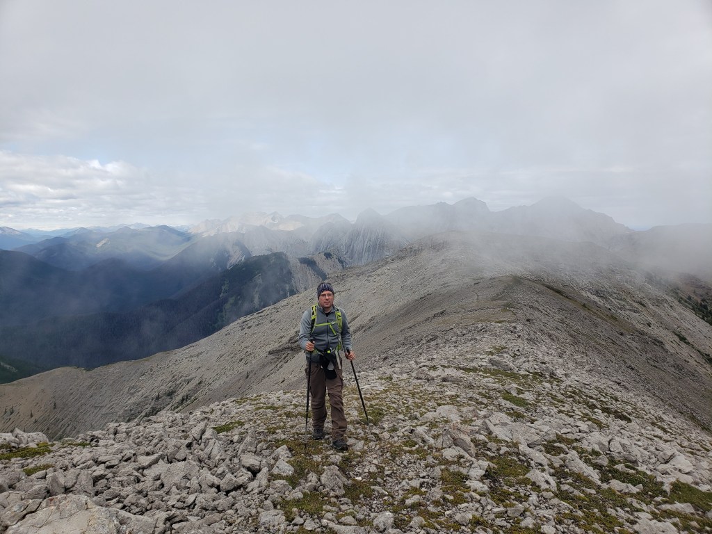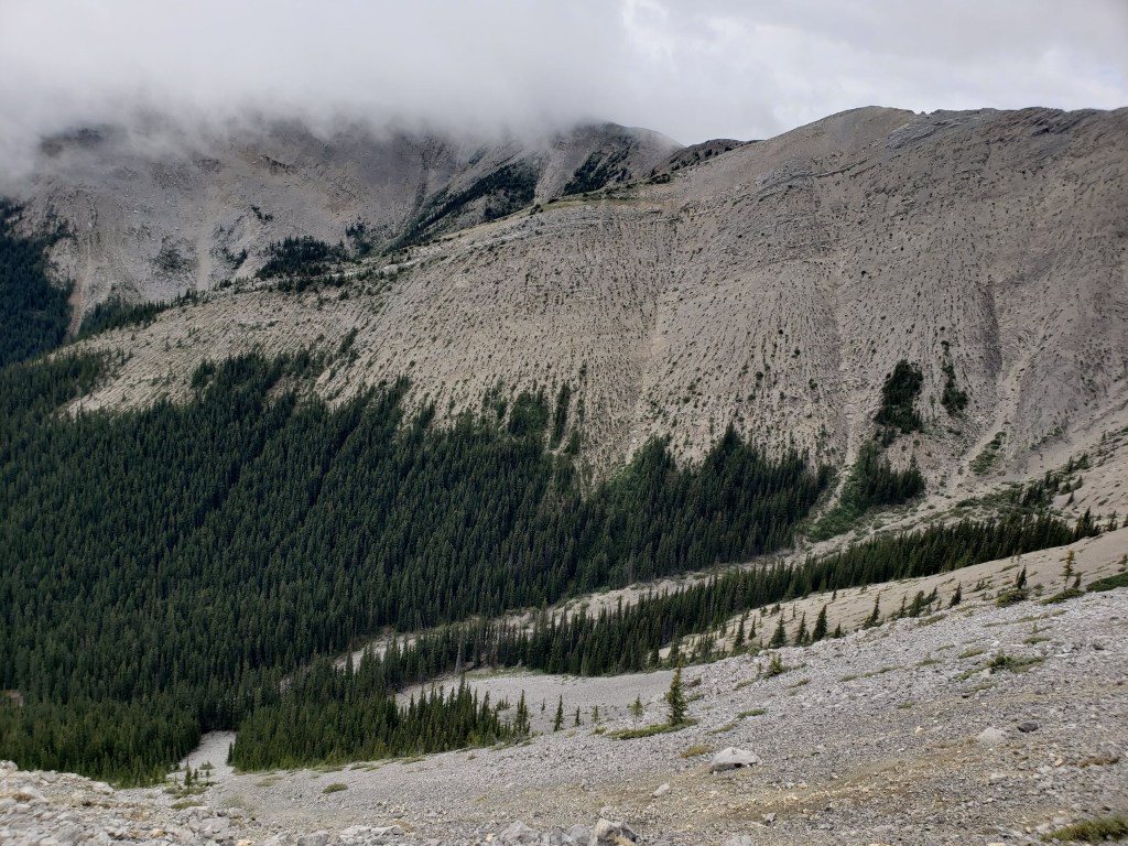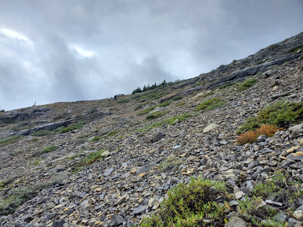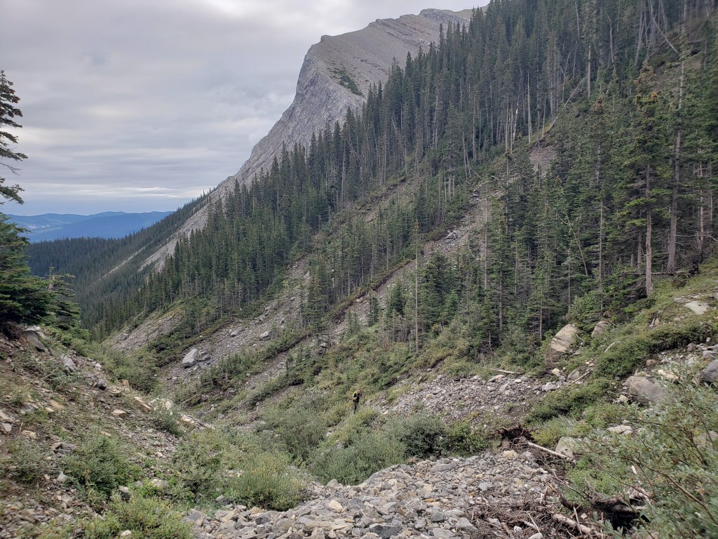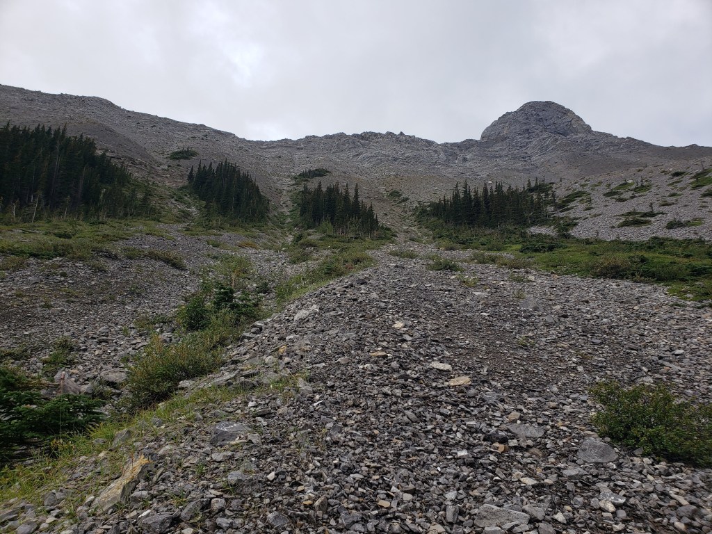 A trail can be picked up just north of Supply Creek. It’s easy to walk up the wide, dry creek bed too.A short way up the trail, signage confirms we are following the correct creek. The County’s access road leads to this spot.Supply Creek was mostly broad, dry gravel when we were there. Bedson Ridge lies ahead. We are aiming for the right-hand side of the low middle section.The turn up a branch to the right was marked with a number of cairns and inukshuks. I am pointing to the branch in this photo.A bit of hands-on scrambling over rocks was needed as we made our way up this branch.We passed through a few bushy sections, too.We went pretty much straight up the middle of this photo. We aimed for a low spot in the ridge, knowing any elevation gained would immediately be lost as we descended the back side.Looking back the way we came. Brûlé Lake comes into view behind us.Reaching the top, still on easy terrain.Upon reaching the top of the ridge, we got to see for ourselves how much elevation we would be losing and regaining to reach the peak (in clouds, to the left). It was certainly demoralizing.We briefly toyed with the idea of side-hilling around the U, but realized the error in our thinking after a few steps. Most of the scree is loose and tedious, much better for scree-skiing down. We spotted a solid looking gully at the far side that would allow us to regain elevation without too much of a trudge back up and we aimed for this.We crossed the floor of the U and bushwhacked through a short section of trees to get to the gully on the opposite side. Travel up the gully was decent, definitely easier than side-hilling the whole way around.Looking back at the side of the U we’d come from. The fierce block at the left is what prevents a scrambler from simply ridge walking around the top. I think the block resembles an Ogre head in profile, don’t you? Perhaps we can call it “Ogre Peak”? This fits well with nearby Ogre Canyon.Regaining the ridge, still on easy terrain.We regained the ridge on sort of a nose feature. This photo is looking south with the two sides of the U extending along the two sides of the shot. Ogre Canyon would be at the far toe of the left-hand ridge.Finally on the ridge and traversing around the rest of the U. The peak lies ahead in clouds.Looking back. We’d ascended the nose at the right. “Ogre Peak” is just behind it.Almost at the peak, hoping the clouds will part.Looking back. Is Boule Roche (not to be confused with Roche Brûlé) almost visible through the clouds?Spot WX‘s weather forecast was exactly accurate and the clouds broke just as we reached the peak. We came up Supply Creek out of the shot to the right, and then re-gained the nose at the right.Looking southwest over the Athabasca River.Summit panorama on Bedson Ridge.Looking across the U at the way we came. We gained the ridge slightly left of Dan and then scree-skied down the chute above my backpack. On the return trip we will aim to gain as much elevation as possible on solid terrain within the trees. The peak to the left is what I’m calling “Ogre Peak”. The peak to the right isn’t officially named, but locals call it Brûlé Mountain or Roche Brûlé.Views to the north of the Boule Range.Traversing around the U to the nose (right)Dan stands in front of Boule Roche. The peak is barely visible behind its jagged ridge.Descending back down the nose into the flat center of the U.We regained the ridge without too much fuss. Brûlé Lake looks a bit more cheerful in the afternoon light.After following Supply Creek back out to the gravel road, we stopped to take in some of the historic sites along the closed off section of 2nd St. Here are the foundations of the former Brûlé School.Here I’m walking the front steps to the former Mine Manager’s House, now all but reclaimed by nature.