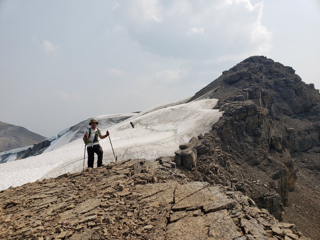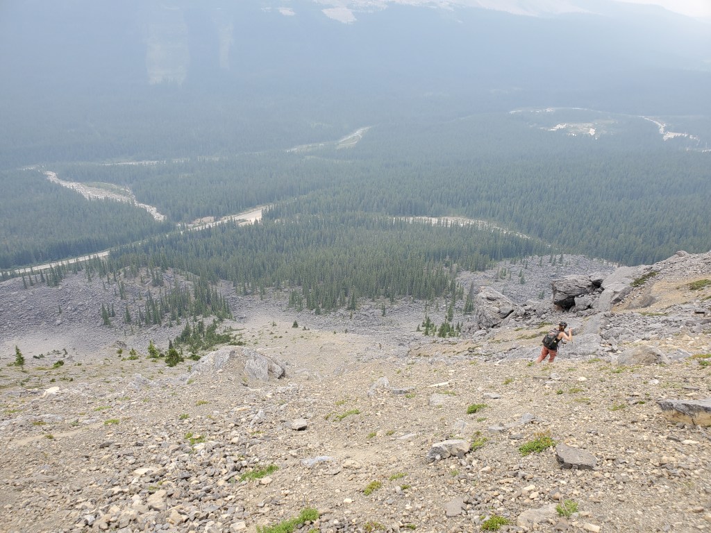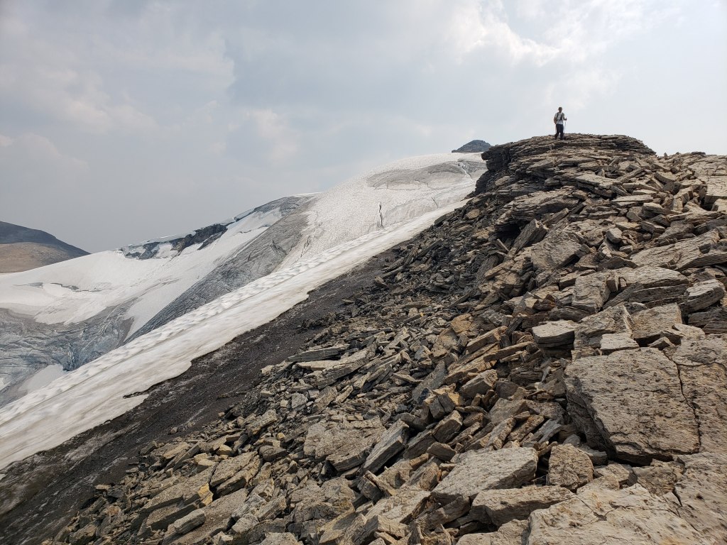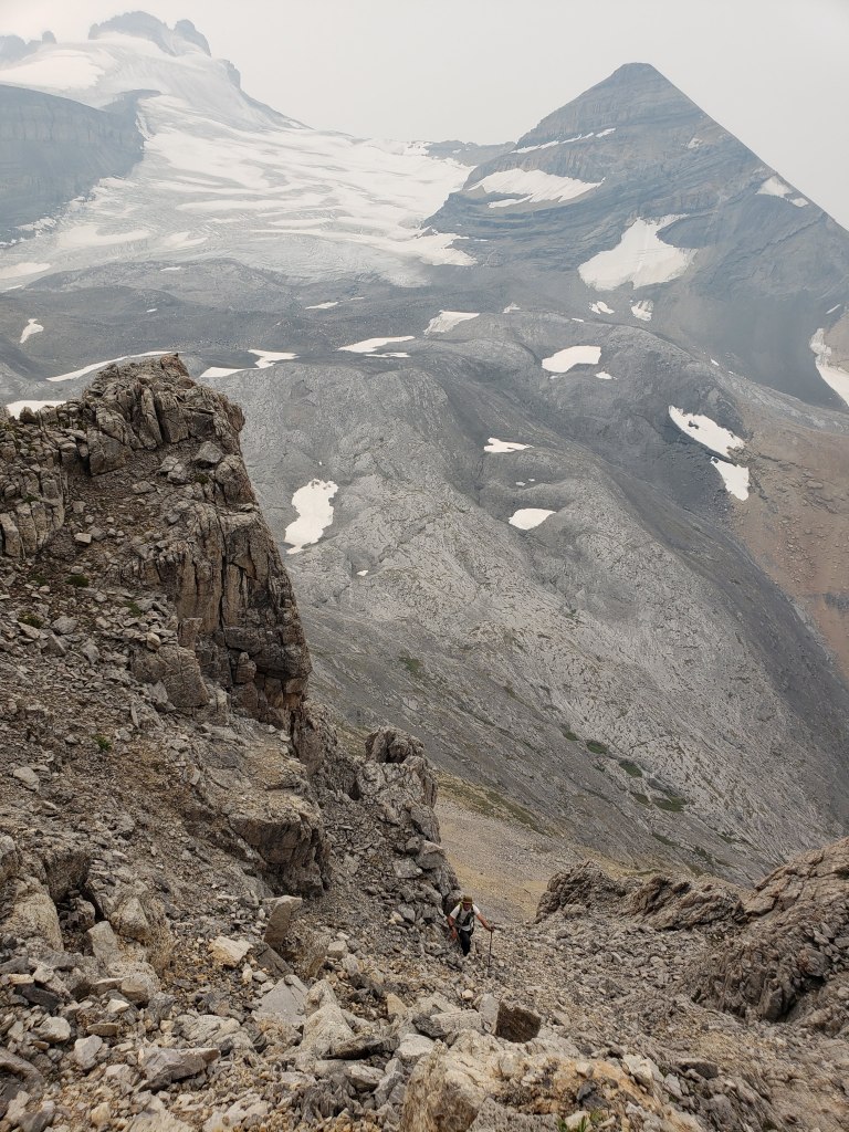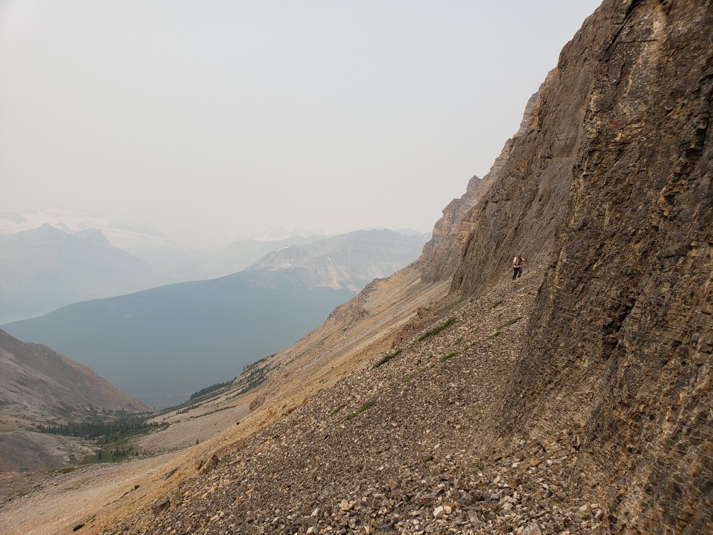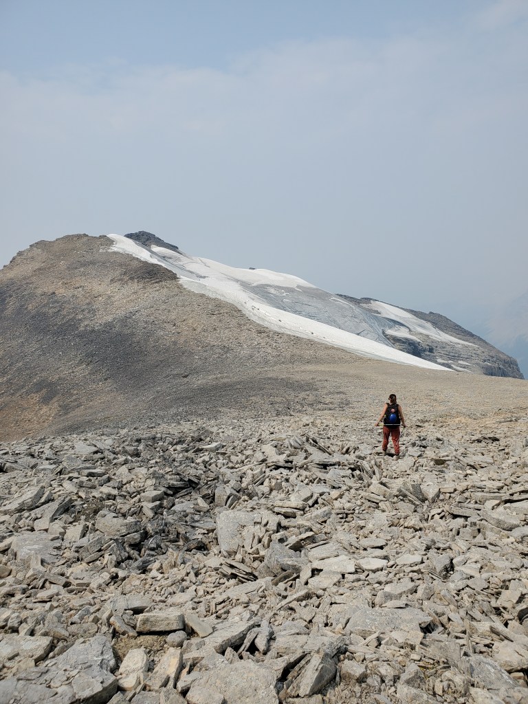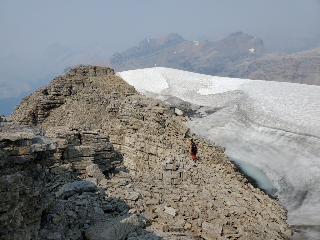 We parked at a pull-out near Hector Creek and easily found the trail in. We were soon at the waterfall.A well-worn trail winds up this small cliff, starting from the left. A few moves of moderate scrambling are needed.Looking down as Dan makes his way up the cliff. It looks like there are a few fun lines to choose from.We followed the trail as it rose to the left side of the valley between Andromache and Hector. We’re aiming to ascend the left slope near the gentle spot above my head.This shot looks back at Dan as we made our way up and to climber’s left, hugging the base of the cliff where the terrain was most solid. We paused for a little window in the cliff face.We reached a friendly-enough looking gully and decided to gain the ridge here. Had we continued below, the ridge might be gained via easier terrain than this.Nearing the top of the gully. Mount Hector (left) and Little Hector (right) are in the background.The ridge flattens out on top and the walk to the first high point is very straight-forward.A cairn marks the first high point on Andromache. Some mapping identifies this as the peak (at 2996 m), but it looks like newer mapping marks the peak as the next high point (at 3002 m). We paused for a photo with Mount Hector in the background.Continuing on to the next high point.Gazing down across the Molar Glacier.Looking back as Dan follows along the glacier. This felt to us like solid ridge, not moraine, but continued evaluation throughout the traverse is prudent. The double-peak of Molar Mountain can be seen in the background, to the left of the high point we just came from.The second high point has a smaller cairn and a summit register. Strange, from this angle, the previous high point almost does look higher.A smoky summit panorama.We continued traversing along the glacier, being mindful to stay on solid rock.Some interesting glacier formations are passed along the ridge.Looking back, the ridge can be seen to grow quite narrow in places. This traverse would not be a scramble if snow was present.Continuing along the ridge. The shoulder of Noseeum Peak is to the right and Dolomite Peak is nearly fully obscured by smoke further back.Gazing across the Molar Glacier to Molar MountainDan follows, staying high on the rocky ridge. Reaching the edge of the ridge, we begin our descent. We kept a lookout for a cliff at skier’s left and stayed to the right of it. This slope is an awful, tricky descent down sand-slab with loose rocks. It’s impossible to keep one’s footing and becomes increasingly frustrating (and painful on the rear).This descent is covered in crystals. Several rock-admiration breaks were called for as we repeatedly lost our footing and needed a breather.Looking back up at the way we descended. We traveled down from the ridge via the huge scree pile, avoiding the cliff to the right of it.We felt extremely relieved to finally reach the bottom of the sand-slab slope. The descent was unpleasant the entire way.The bottom of the final slope abuts a short gravel road littered with rusty cans. We followed it out to the highway and then finished the day walking 2 km back to the car along the highway.