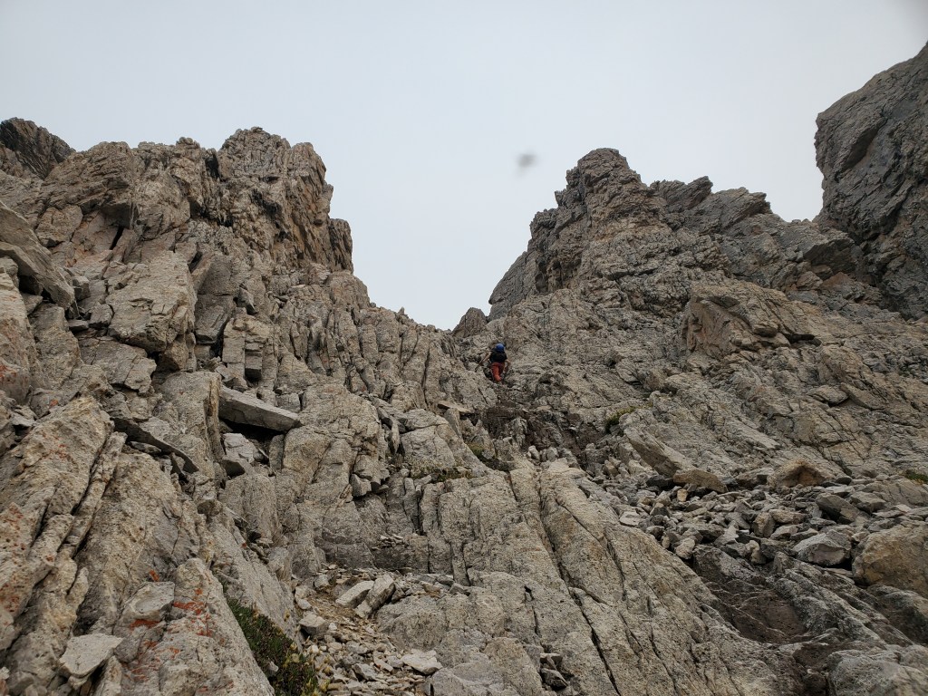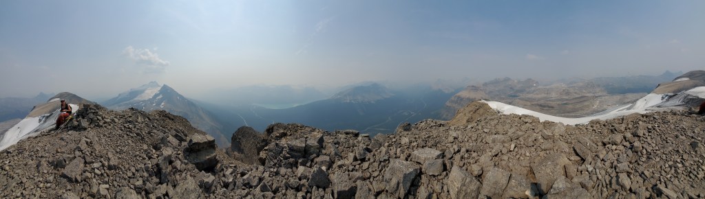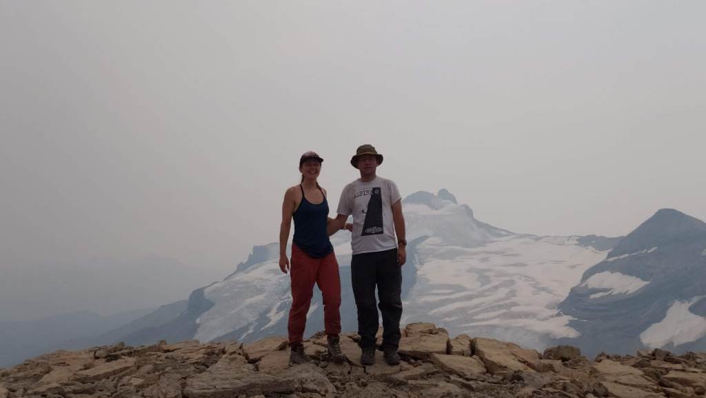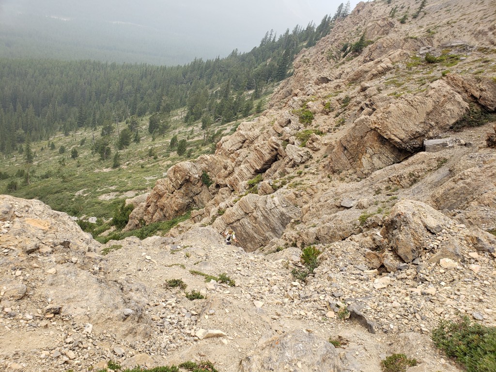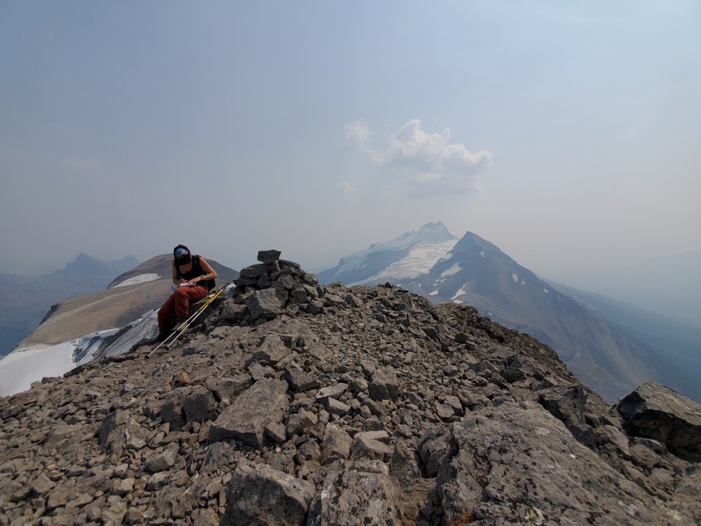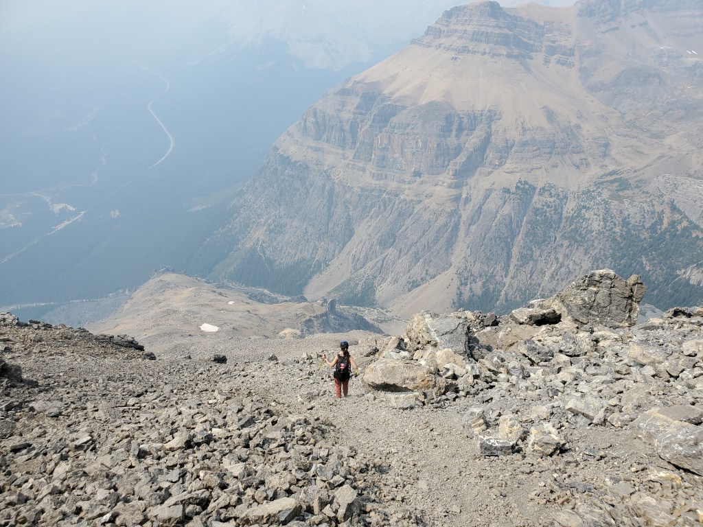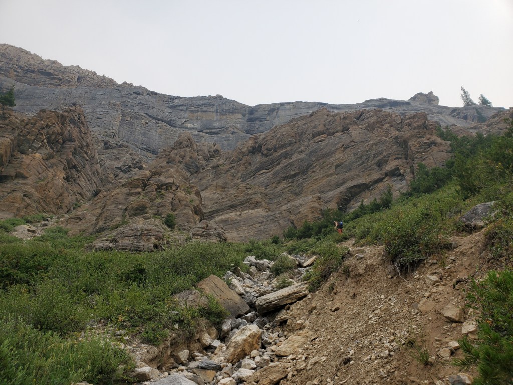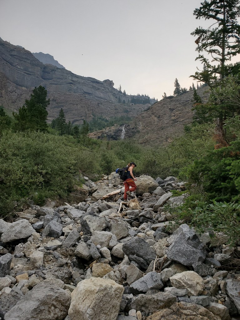 We parked at a pull-out near Hector Creek and easily found the trail in. We were soon at the waterfall.A well-worn trail winds up this small cliff, starting from the left. A few moves of moderate scrambling are needed.Looking down as Dan makes his way up the cliff. It looks like there are a few fun lines to choose from.We followed the trail as it rose to the left side of the valley between Andromache and Hector. We’re aiming to ascend the left slope near the gentle spot above my head.This shot looks back at Dan as we made our way up and to climber’s left, hugging the base of the cliff where the terrain was most solid. We paused for a little window in the cliff face.We reached a friendly-enough looking gully and decided to gain the ridge here. Had we continued below, the ridge might be gained via easier terrain than this.Nearing the top of the gully. Mount Hector (left) and Little Hector (right) are in the background.The ridge flattens out on top and the walk to the first high point is very straight-forward.A cairn marks the first high point on Andromache. Some mapping identifies this as the peak (at 2996 m), but it looks like newer mapping marks the peak as the next high point (at 3002 m). We paused for a photo with Mount Hector in the background.Continuing on to the next high point.Gazing down across the Molar Glacier.Looking back as Dan follows along the glacier. This felt to us like solid ridge, not moraine, but continued evaluation throughout the traverse is prudent. The double-peak of Molar Mountain can be seen in the background, to the left of the high point we just came from.The second high point has a smaller cairn and a summit register. Strange, from this angle, the previous high point almost does look higher.A smoky summit panorama.We continued traversing along the glacier, being mindful to stay on solid rock.Some interesting glacier formations are passed along the ridge.Looking back, the ridge can be seen to grow quite narrow in places. This traverse would not be a scramble if snow was present.Continuing along the ridge. The shoulder of Noseeum Peak is to the right and Dolomite Peak is nearly fully obscured by smoke further back.Gazing across the Molar Glacier to Molar MountainDan follows, staying high on the rocky ridge. Reaching the edge of the ridge, we begin our descent. We kept a lookout for a cliff at skier’s left and stayed to the right of it. This slope is an awful, tricky descent down sand-slab with loose rocks. It’s impossible to keep one’s footing and becomes increasingly frustrating (and painful on the rear).This descent is covered in crystals. Several rock-admiration breaks were called for as we repeatedly lost our footing and needed a breather.Looking back up at the way we descended. We traveled down from the ridge via the huge scree pile, avoiding the cliff to the right of it.We felt extremely relieved to finally reach the bottom of the sand-slab slope. The descent was unpleasant the entire way.The bottom of the final slope abuts a short gravel road littered with rusty cans. We followed it out to the highway and then finished the day walking 2 km back to the car along the highway.
