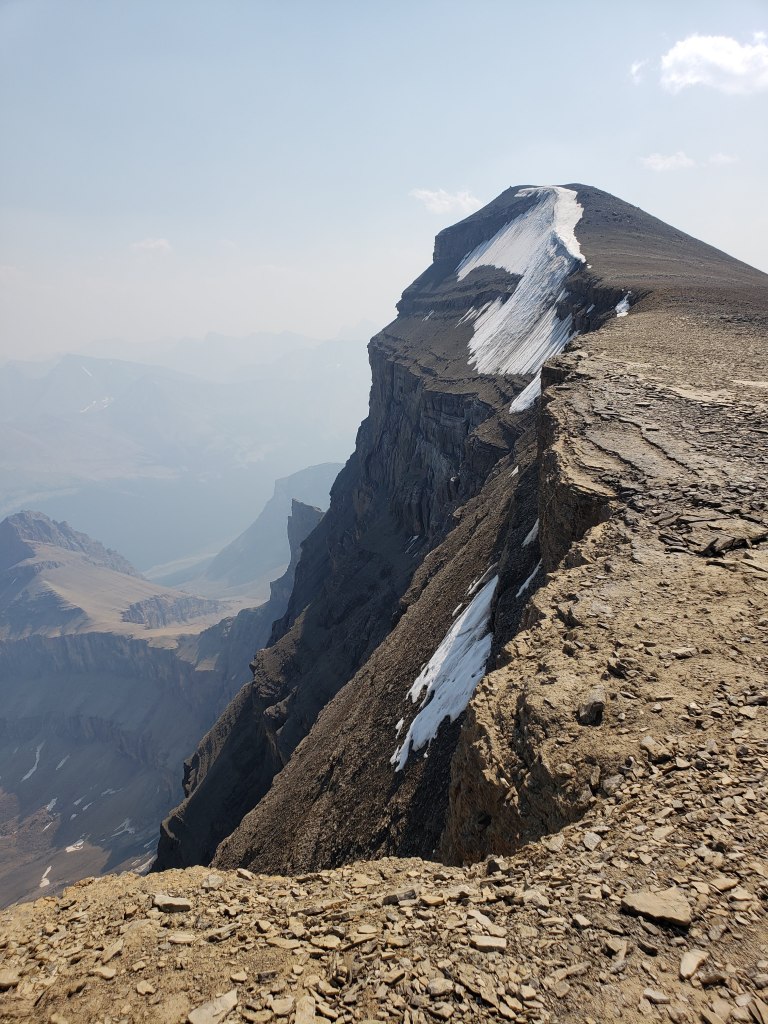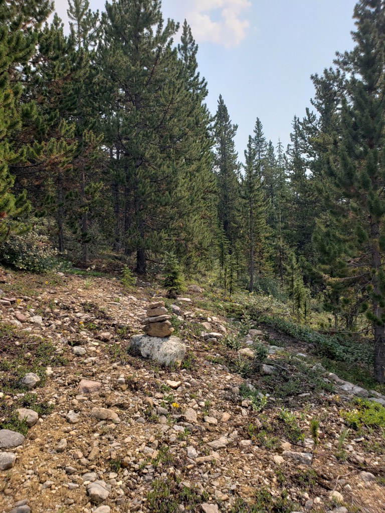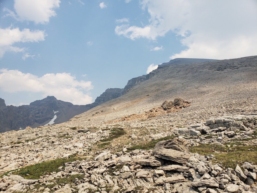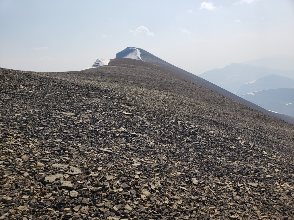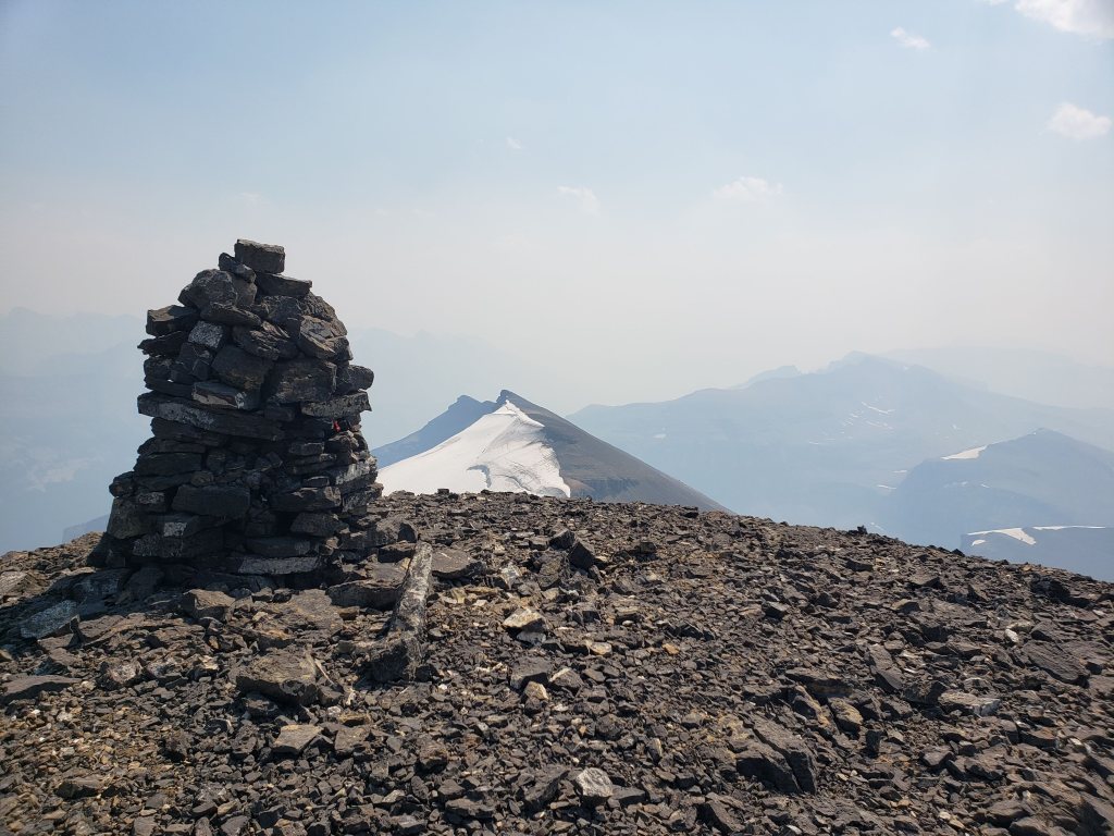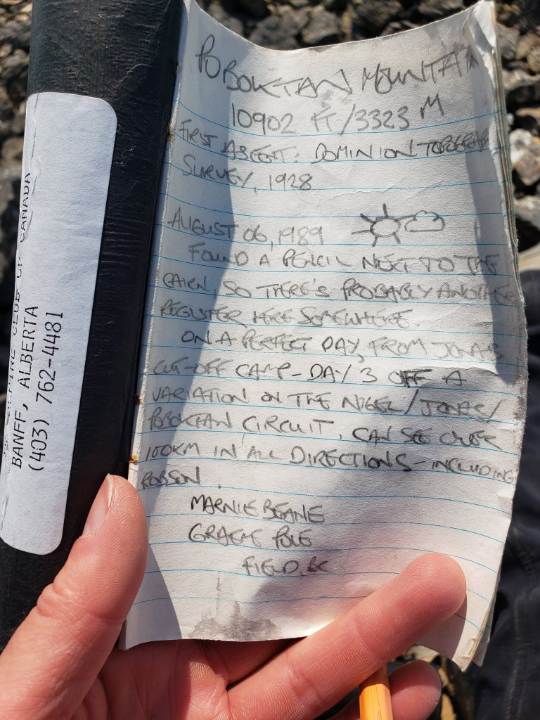 I investigated their recommended approach and I could see where an avalanche must have once cleared a gap in the trees, but that gap is probably now 15 year growth amongst a forest of 30 year growth and is no longer easy travel. I only took a few steps into the new growth before deciding this was terrible and going back to the drainage pictured above. The drainage was much easier and the turn-off was marked with flagging tape and should be easy to find. The ~5 m cliff pictured above was the only scrambling of the day, but it was easily bypassed at either side.I continued along the drainage mentioned above, which runs directly below the large bowl in the northwest of the mountain. Most of the travel was easy, like in this photo. I exited the drainage before the sides got too steep. This still put me in the trees at that point, but high enough that they were thin and easy to navigate.Once above the trees, the way up is obvious. However, it’s over 2 1/2 hrs to the summit ridge from this point, mostly on tedious treadmill scree. To the left, behind the boulder, is the large bowl above my ascent drainage – hence the importance of exiting the drainage before the walls get too steep.After an eternity of trudging up loose scree, I was starting to question whether I was even making progress – the rock all looks the same and it feels like you’re going nowhere! I tried following lines of run-off and I tried trudging through open slope, but it was all awful. My only advice here would be to bring a friend for moral support. I was overjoyed to finally catch a glimpse of the summit ridge.Finally nearing the summit of Poboktan Mountain. The enormous summit cairn can be seen even from back here.To the west (behind, when looking at the summit) lies the Brazeau Icefield. Unfortunately it was very smoky this day and views were minimal.Poboktan is only 30 m shy of being an 11,000er and I almost wonder if these ambitious cairn-builders were trying to bridge the gap! I had to circle this monolith twice to find the summit register – it’s hidden on the right side of the cairn in this photo, about half way up.It’s interesting to find such an old summit register. This one was placed by Marnie Beane (Pole) and Graeme Pole (Canadian author and photographer) in 1989.Another familiar name – this legend needs no introduction.Photo proof, of sorts, that I was here. By this point the thick smoke obscured all views.The scree-ski out was very easy, taking just over an hour.From the bottom of the scree it’s only 100 m of traversing through thin trees to return to the drainage. This photo is looking back at the easiest line through the trees. I returned the way I’d come, making it back to Waterfalls Campsite in the afternoon.I made it back to Waterfalls Campsite in 7 hrs 45 min, with easily enough time to continue back out to the trailhead. Instead I chose to relax at camp and enjoy an evening of reading alone. I had noted while packing for this trip that the weather would turn cold and rainy overnight, so I packed a small tarp to supplement my bivy sack – an adorable gesture in retrospect.I woke very early the next morning to snow on adjacent Waterfall Peaks – in July! I swiftly packed up camp and hit the trail just before the wind picked up and the downpour started. My original plan had been to head to Replica Peak next, but severity of the weather changed my mind. I finally ended up returning for Replica Peak in 2023.
