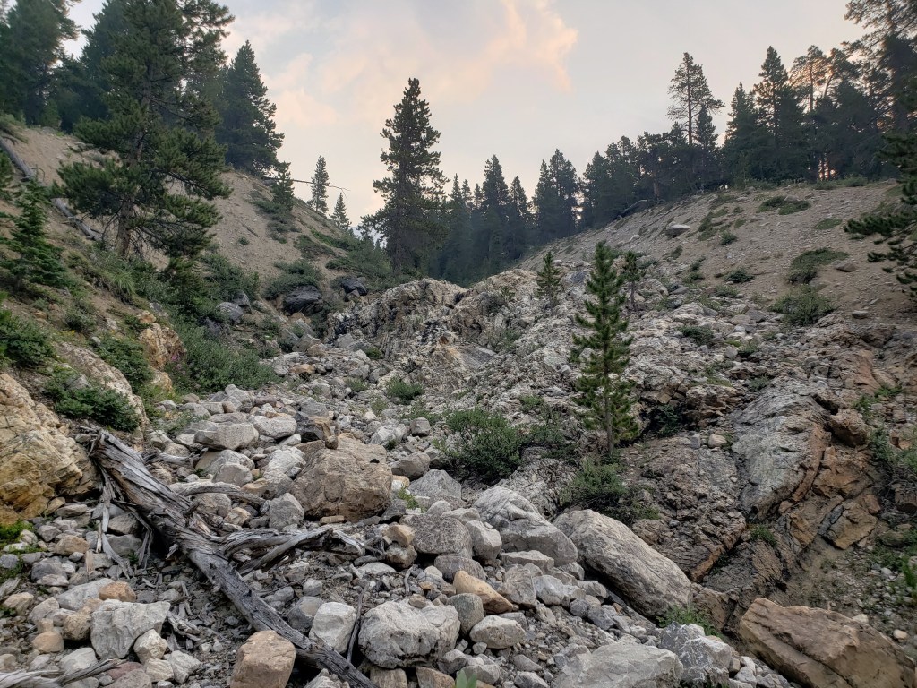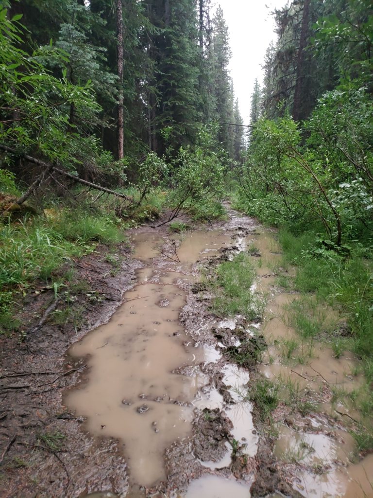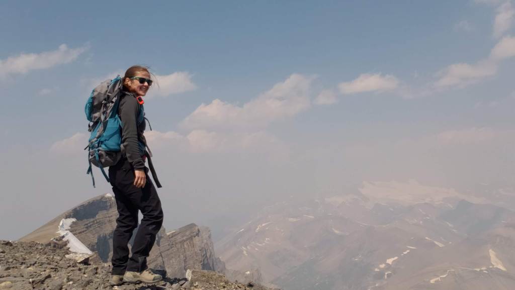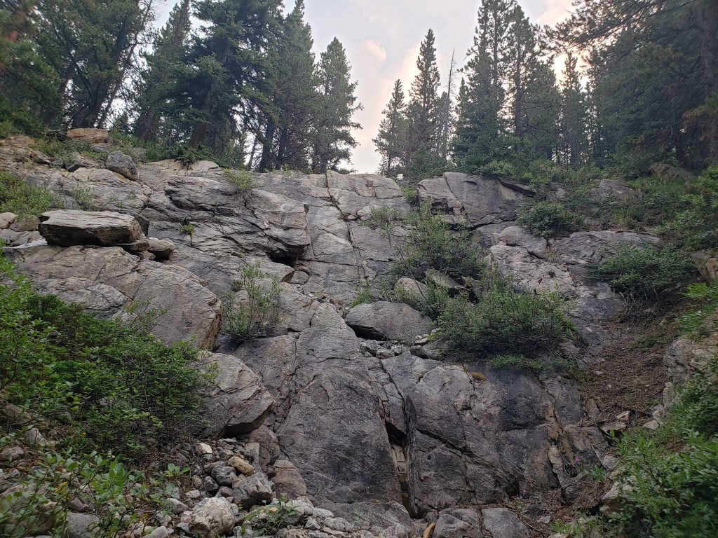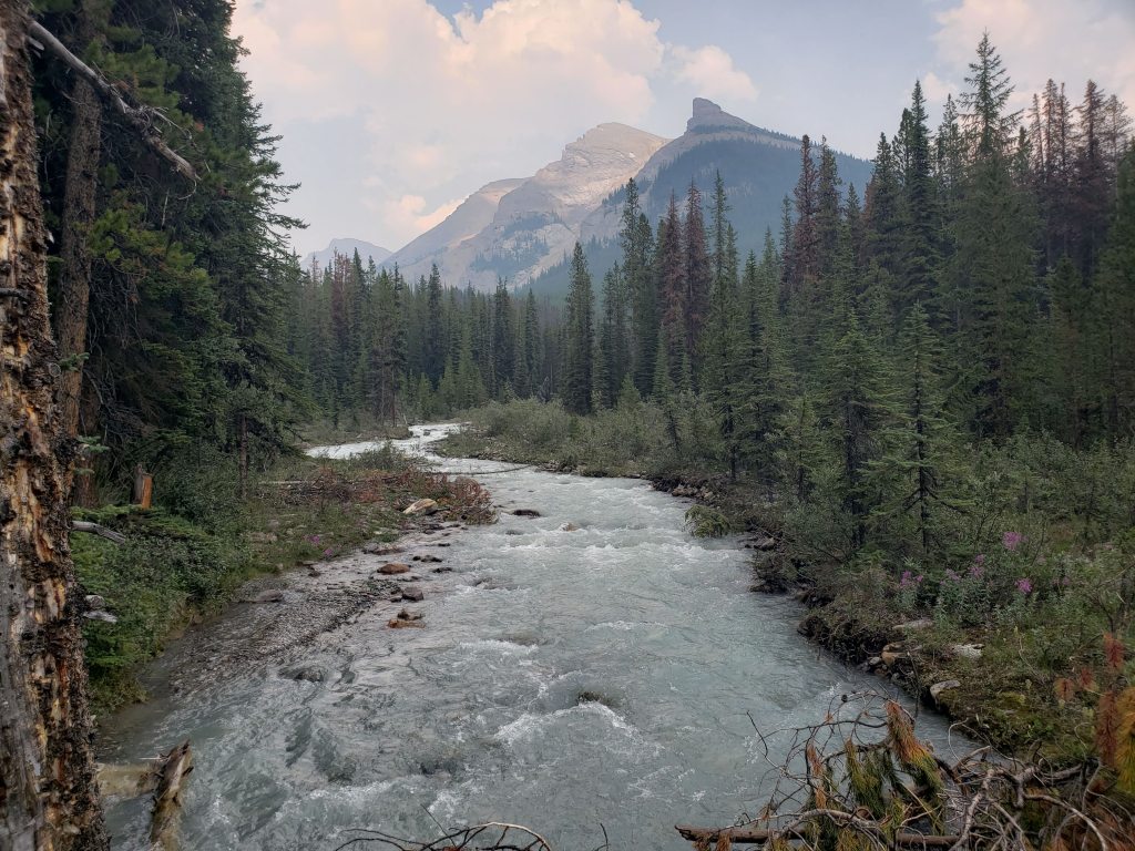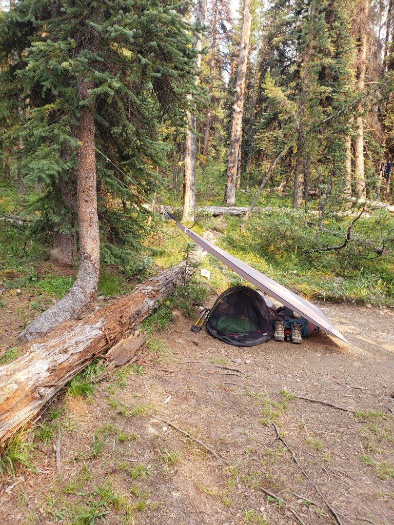 I investigated their recommended approach and I could see where an avalanche must have once cleared a gap in the trees, but that gap is probably now 15 year growth amongst a forest of 30 year growth and is no longer easy travel. I only took a few steps into the new growth before deciding this was terrible and going back to the drainage pictured above. The drainage was much easier and the turn-off was marked with flagging tape and should be easy to find. The ~5 m cliff pictured above was the only scrambling of the day, but it was easily bypassed at either side.I continued along the drainage mentioned above, which runs directly below the large bowl in the northwest of the mountain. Most of the travel was easy, like in this photo. I exited the drainage before the sides got too steep. This still put me in the trees at that point, but high enough that they were thin and easy to navigate.Once above the trees, the way up is obvious. However, it’s over 2 1/2 hrs to the summit ridge from this point, mostly on tedious treadmill scree. To the left, behind the boulder, is the large bowl above my ascent drainage – hence the importance of exiting the drainage before the walls get too steep.After an eternity of trudging up loose scree, I was starting to question whether I was even making progress – the rock all looks the same and it feels like you’re going nowhere! I tried following lines of run-off and I tried trudging through open slope, but it was all awful. My only advice here would be to bring a friend for moral support. I was overjoyed to finally catch a glimpse of the summit ridge.Finally nearing the summit of Poboktan Mountain. The enormous summit cairn can be seen even from back here.To the west (behind, when looking at the summit) lies the Brazeau Icefield. Unfortunately it was very smoky this day and views were minimal.Poboktan is only 30 m shy of being an 11,000er and I almost wonder if these ambitious cairn-builders were trying to bridge the gap! I had to circle this monolith twice to find the summit register – it’s hidden on the right side of the cairn in this photo, about half way up.It’s interesting to find such an old summit register. This one was placed by Marnie Beane (Pole) and Graeme Pole (Canadian author and photographer) in 1989.Another familiar name – this legend needs no introduction.Photo proof, of sorts, that I was here. By this point the thick smoke obscured all views.The scree-ski out was very easy, taking just over an hour.From the bottom of the scree it’s only 100 m of traversing through thin trees to return to the drainage. This photo is looking back at the easiest line through the trees. I returned the way I’d come, making it back to Waterfalls Campsite in the afternoon.I made it back to Waterfalls Campsite in 7 hrs 45 min, with easily enough time to continue back out to the trailhead. Instead I chose to relax at camp and enjoy an evening of reading alone. I had noted while packing for this trip that the weather would turn cold and rainy overnight, so I packed a small tarp to supplement my bivy sack – an adorable gesture in retrospect.I woke very early the next morning to snow on adjacent Waterfall Peaks – in July! I swiftly packed up camp and hit the trail just before the wind picked up and the downpour started. My original plan had been to head to Replica Peak next, but severity of the weather changed my mind. I finally ended up returning for Replica Peak in 2023.