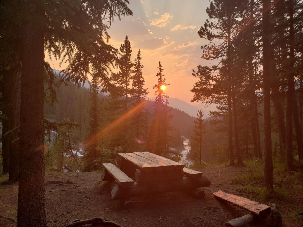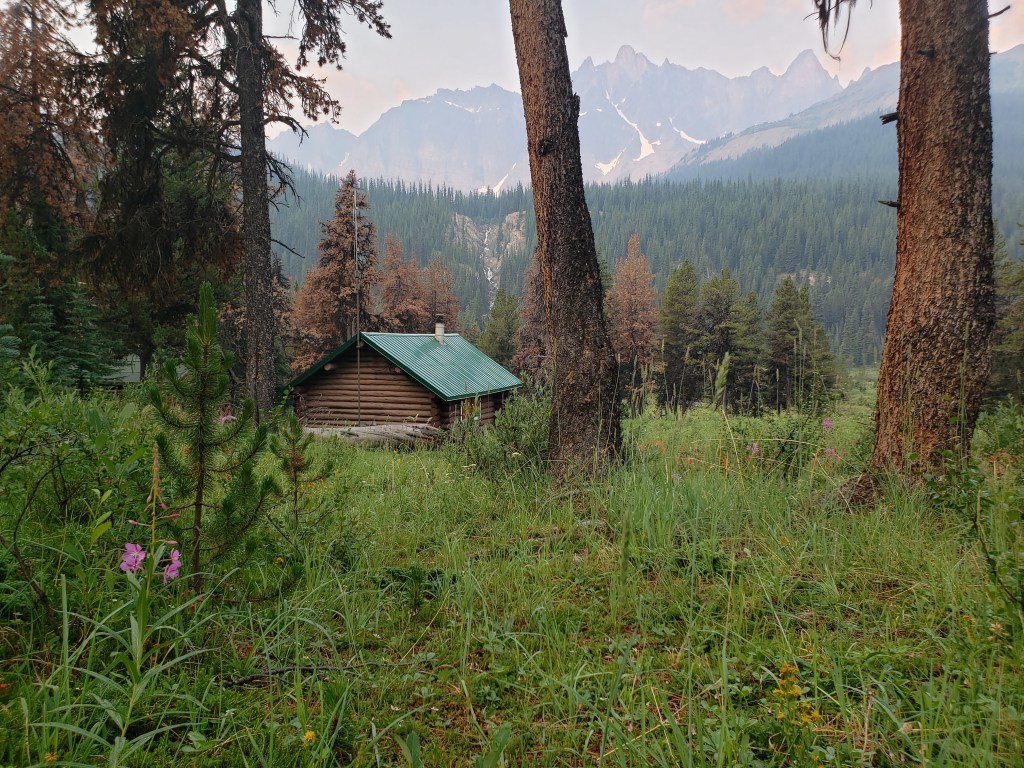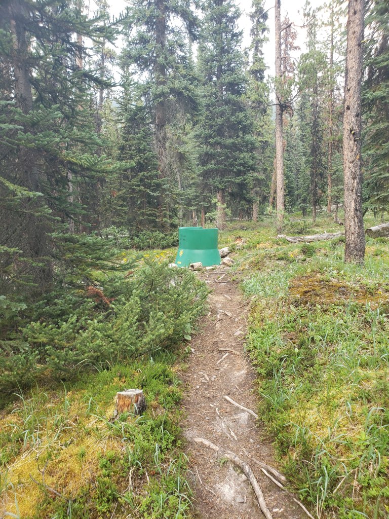 The hike in along Poboktan Creek was on a wide, easy, well-maintained trail. I reached Waterfalls Campsite in 3 hrs 15 min.The enchanting waterfalls in front of Waterfalls Campsite. The campsite sits on high ground, just above this spot.Taking in an idyllic sunset while enjoying a quiet evening of reading at the campsite, before settling in for the first night.A throne fit for backpackers! For those unfamiliar with Park’s Canada’s throne/pit toilets, this is what to expect. I set out for my objective early the next morning, continuing in the direction of Jonas Pass. This charming ranger cabin is passed along the way. Waterfall Peaks are in the background.Just before the turn-off to the peak I spotted a tempting drainage (the above photo is taken a few hundred meters along it). Nearingburg and Coulthard’s recommendation is to continue past the drainage to leave the trail into trees, saying that “the forest is very thin here and the bushwhacking is surprisingly pleasant by Jasper standards.” This is out-of-date beta.