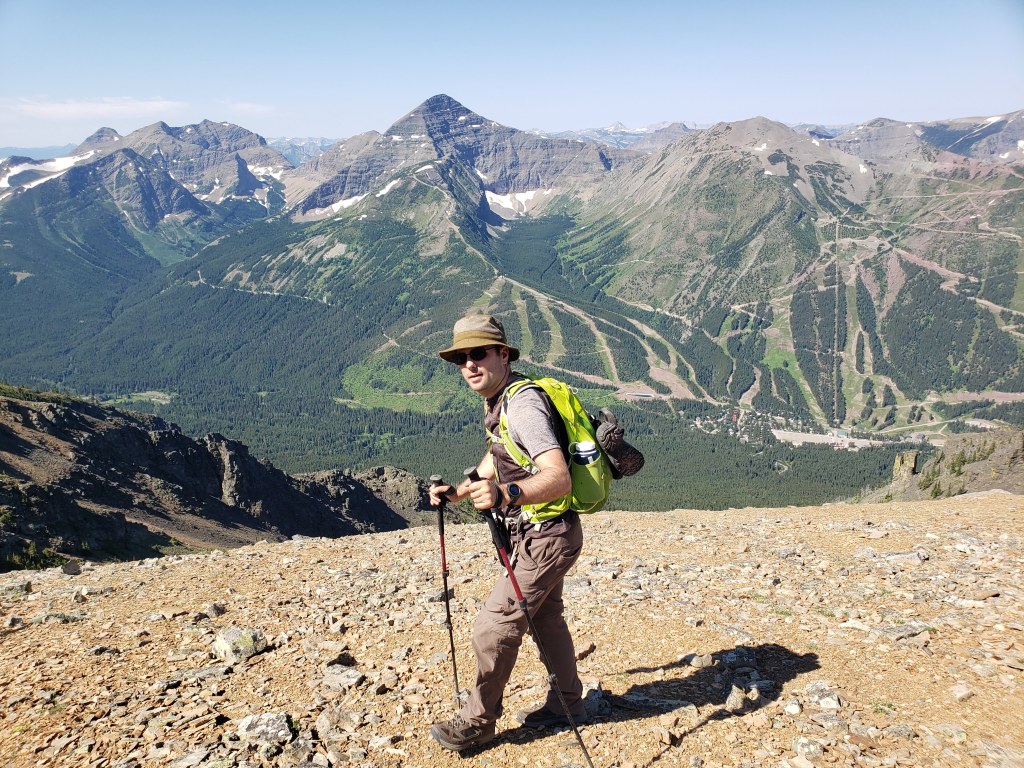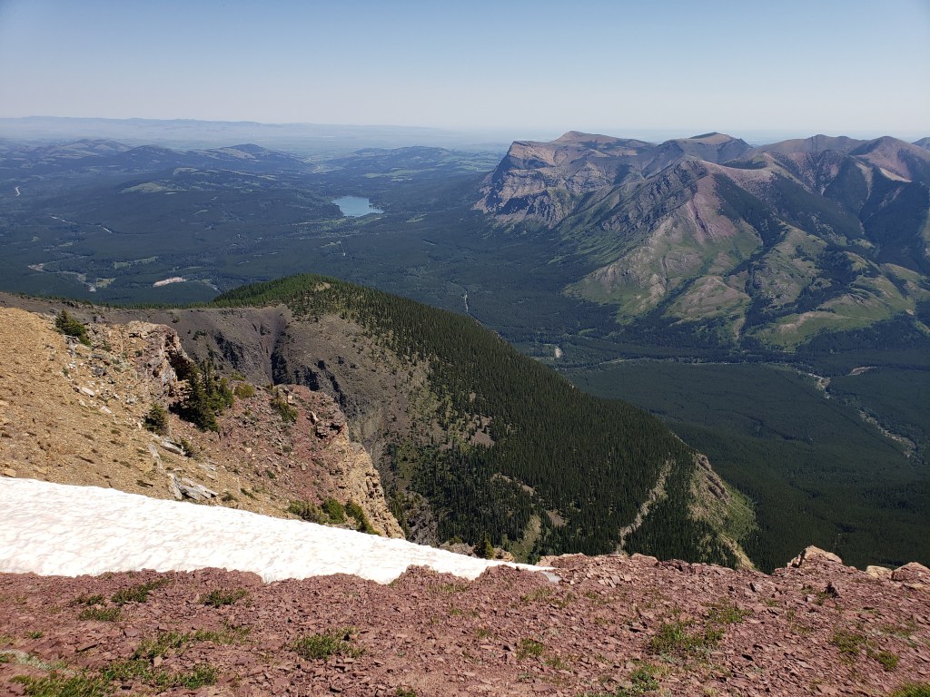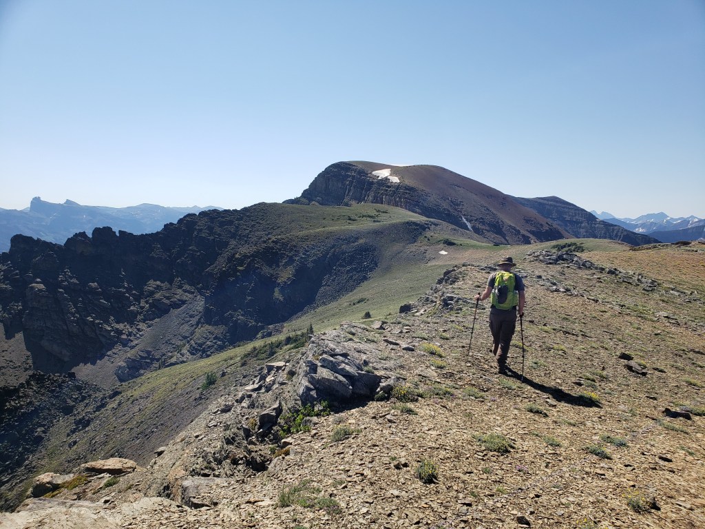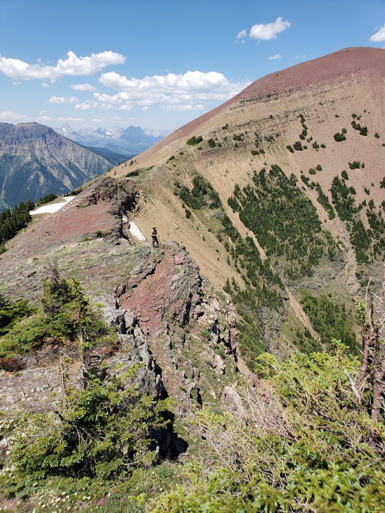 Most people choose to tackle this crossing in autumn when it is only calf deep. With water levels being this high we made sure to unclasp our backpacks before starting across, ready to ditch our packs if we lost our footing. We also packed sturdy sandals for this part.Beyond the river crossing an obvious trail begins. You’d expect the river crossing to deter the majority of hikers, but the trail looked well-travelled. Our first objective, Southfork Mountain, comes into view at the right. The peak is further behind the cliffs that are seen here.Looking north to Crowsnest Pass. Crowsnest Mountain can be seen through the gap in the trees at the right.The first lake encountered is Barnaby Lake. We will be continuing around the right side of the lake and up to the next lakes.Reaching the second of the two Southfork Lakes. From here we kept right and gained the ridge via gentle larch-covered slopes (out of view).We crossed one snow patch that was still lingered along this east-facing slope and then continued up the gentle terrain to the peak of Southfork Mountain.Looking down on Southfork Lakes from the top of Southfork Mountain.The peak of Southfork Mountain was easy to reach, little more than off-trail hiking. We arrived in 3 hrs from the trailhead.From the top of Southfork Mountain we continued south along the ridge toward the high point of Barnaby Ridge. An intermediate high point in the ridge, aka The Amoeba (center), obscures most of the peak from here.Views to the west are of Mount Haig and Gravenstafel Ridge, with the open runs of Castle Mountain Resort.The cliff band ahead will be the only scrambling of the day. The easiest spot through the cliff is directly ahead of me and it gets much friendlier once closer.The moderate line is a zig-zag up the cliff, first right and then left. It’s not exposed, just a bit loose.Reaching the top of the few moves of scrambling for our day.We detoured a couple hundred meters to the edge of The Amoeba to take in the views. Looking northeast to Table Mountain (center) and Beaver Mines Lake. Whistler Mountain is closer and to the right.Continuing south, the peak of Barnaby Ridge comes into view (left of center).The ridge-walk between The Amoeba and Barnaby Ridge offers brightly coloured rock and interesting terrain.Continuing along the ridge, looking east. Castle Peak just pokes out from behind a tree.Looking back at The Amoeba. A trio of scramblers we had passed are continuing across the middle of the red patch on the mountain (not quite visible at this resolution). What looks like a vertical cliff from here is only a gentle scree slope.Small tree patches scattered below the high point of Barnaby Ridge were the closest thing we found to shade while on the ridge, and we eagerly took advantage on the way down.Nearing the peak of Barnaby Ridge. In this photo the highest point can be seen at center. Nugara’s mapping includes three high points along this summit, but the middle is the highest.Along the summit ridge of Barnaby Ridge. The tall peak to the right is Mount Haig. The cluster of peaks to the left includes Rainy Ridge, Three Lakes Ridge, and Scarpe Mountain.Gazing southwest from the high point of Barnaby Ridge, iconic Castle Peak featuring prominently to the left. The tall peak to the left is Victoria Peak.Summit panorama.Returning to the small trees below the peak, we stopped for a break in the best shade available. Our lunches were melted messes by this point.Continuing along the ridge toward The Amoeba. On the way back we tried avoiding elevation gain and loss by side-hilling around the west (left), but it was very loose and probably ended up being more work than just regaining the high point.Beyond The Amoeba, returning to Southfork Mountain.Descending back to the lakes. The snow patch is looking alluring in this heat, but we know we are almost at the lakes.We returned to Southfork Lakes at roughly the hottest point in the day, the perfect time to stop for a dip in the cool, turquoise water.From Southfork Lakes, we hiked the rest of the way back out and finally crossed back through the West Castle River. Don’t be a Downer-Dan, unclasp your backpack for water crossings.