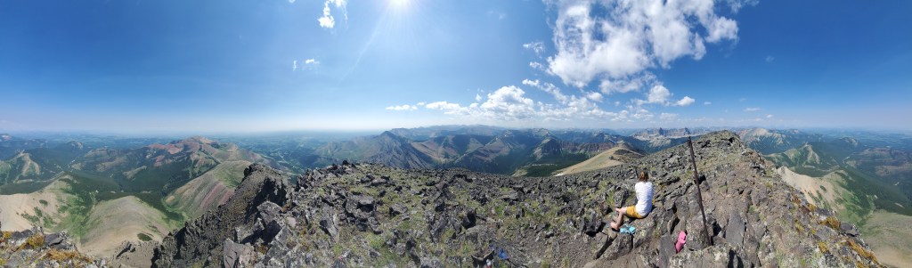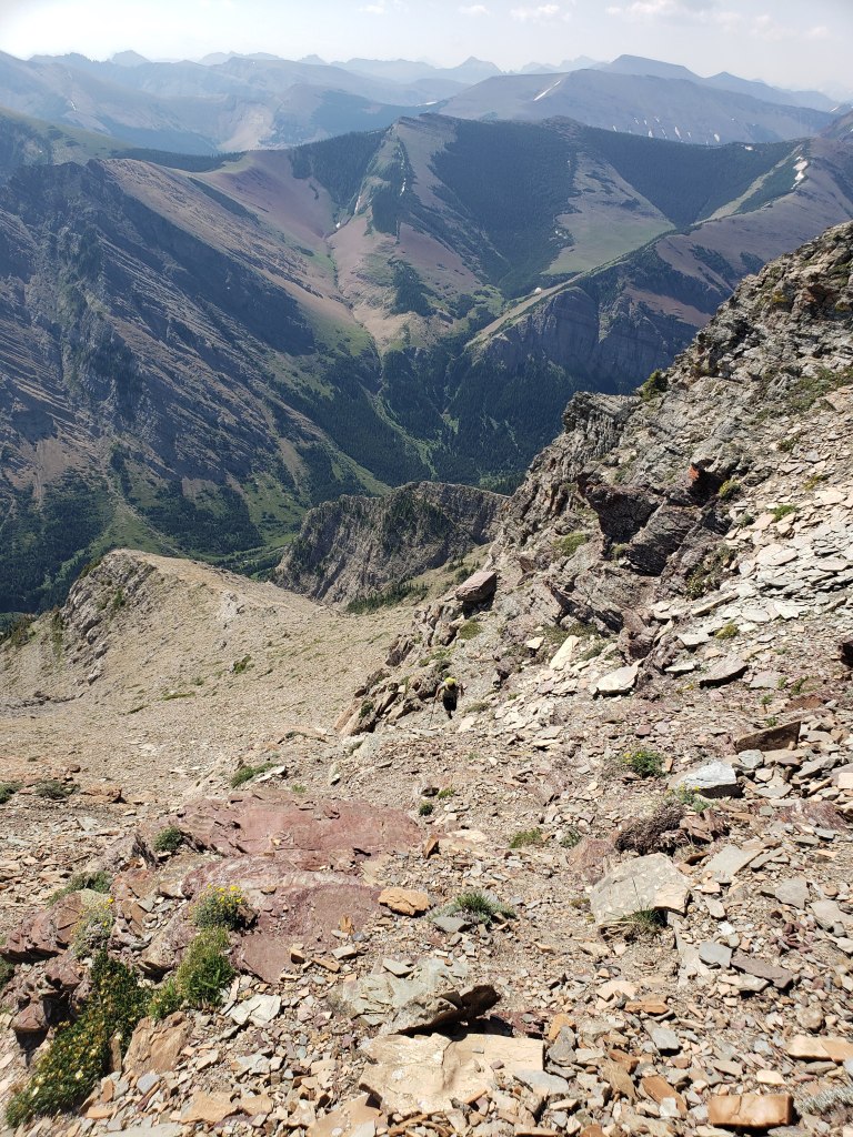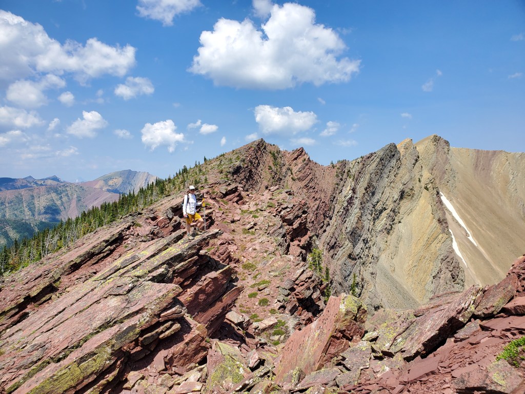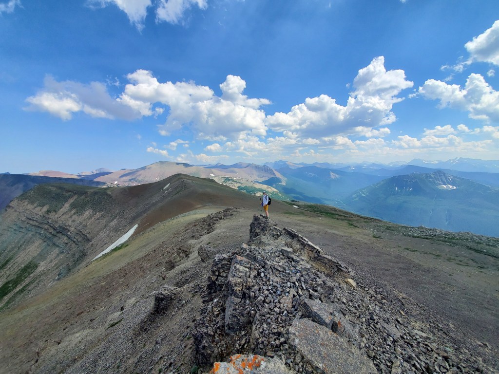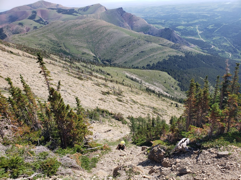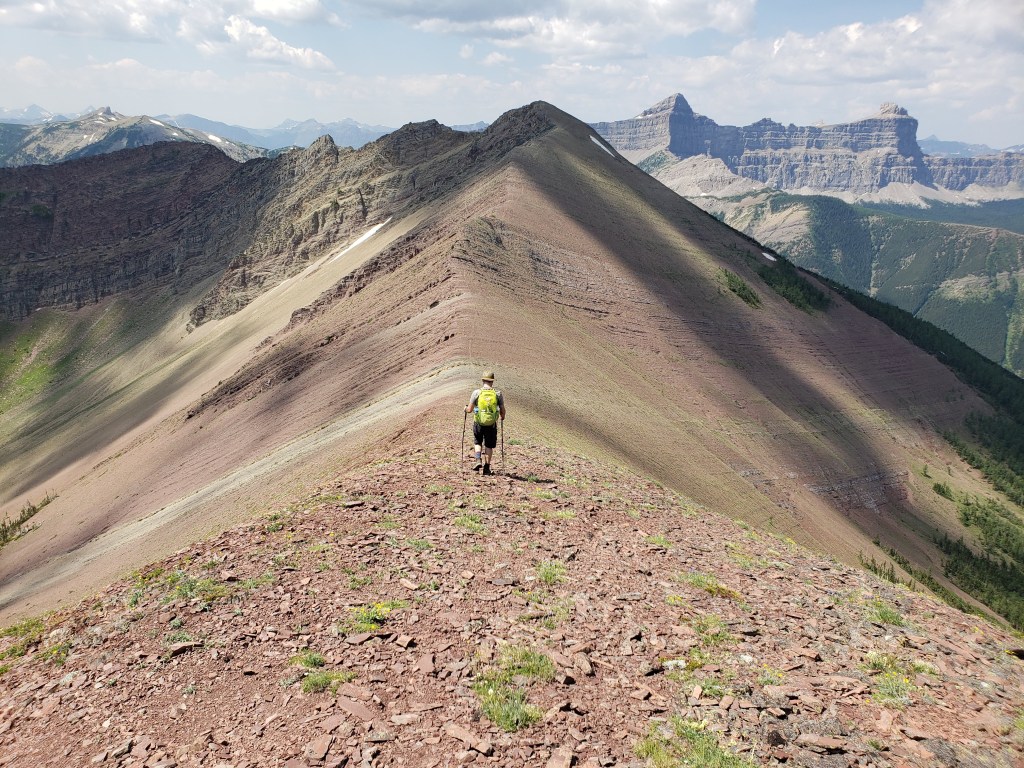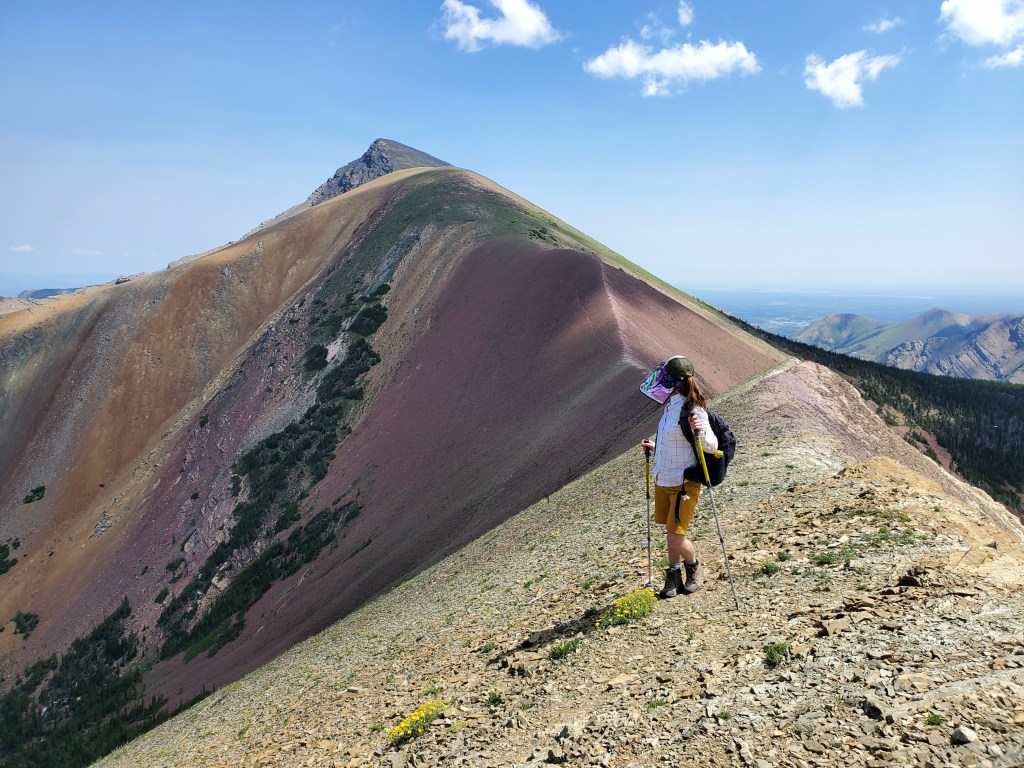 Once past the dogs, we regained our wits and continued biking toward Victoria Peak (left). We stashed our bikes in the trees below Victoria Peak and continued on foot up the grassy slopes above.The first part of the slope is grassy and open. We made our way up, trending toward Victoria Peak’s north cliff (right).Further up the terrain gets rocky and loose, making us wish we’d packed helmets.We continued up, gradually trending to the right while trying to keep to the more solid terrain in the trees.Nearing the top. From here we’ll weave our way through a couple of cliff bands below the peak.Most of the cliff bands were only moderate scrambling, choose-your-own-adventure style.This is supposed to be the moderate line through the final crux, but height may be a factor. I am only 5’4″ and I couldn’t reach the more solid holds beyond the chossy ledge at face level. The slope below me would be a decent tumble, and my hands didn’t feel solid enough to bump my feet up. This line didn’t feel positive at my height.Instead, I climbed the face to the right of the moderate line. This is an exposed scramble (the drop-off to the right is sheer and fatal), but the holds and movement felt more secure for my build.Reaching the top of the difficult scrambling section. Looking down at Dan from the top of the difficult section. The cliff to the left makes the scrambling exposed, bumping this up to a difficult rating.Reaching Victoria Peak! Views extend far across the prairies.Summit panorama.The route from Victoria Peak to Victoria Ridge will follow the backwards “C” in the ridge in front of me before heading up the grassy ridge left of center.We began the long walk to Victoria Ridge summit. Castle Peak (right) looks magnificent from this angle. Surprisingly, that mountain is shorter than the one we just summited, Victoria Peak.Looking back at Victoria Peak and the brightly coloured stripes of the slope connecting it to Victoria Ridge.Continuing through the backwards “C” part of the ridge, where the terrain gets a little more blocky. Our destination is the high point right of center in the distance.Stacked, red rock plates add interest to this section of the ridge.Looking back from another angle at the bright stripes of the ridge.These stacked, red rock plates make for delightful cliffs. We will walk out below them later.Rounding out the end of the “C” ahead and nearing the treed section of the route.We followed an obvious trail trending right, and then turned left up a gap in the trees (center). It worked, but didn’t connect as nicely as hoped. It looks like trending left at the trees would have led to an easier path.The gap in the trees was snowier and more enclosed than we expected. We followed this to its high point and then bushwhacked a few dozen meters until we were out of trees again.Once through the trees, the rest of the route comes into view. The summit of Victoria Ridge is behind the high point left of center in this photo, a bit more of a trek than it looks.Nearing the top, looking back at our long journey from Victoria Peak, the high point to the right.The high point of Victoria Ridge is the rocky mound in the otherwise smooth rolling ridgeline. Shortly past the point where this photo was taken, we were surprised to see two mountain bikers speeding toward us in the distance.Dan reaches the high point of Victoria Ridge. The ridge walk from Victoria Peak can be seen winding off into the distance at the right.The ridges are broad and uniform here, almost making it tempting to keep going to Loaf Mountain (left, not in shade), but we knew we still had a long trek back out.The infamous bullseye of Pincher Ridge.We begin the long walk back. Rather than returning over Victoria Peak, we’ll be turning right just before the “C” in the ridge and then following Pincher Creek out.A good trail leads down toward Pincher Creek.Following the trail out, looking back up at the impressive cliffs from the ridge walk earlier in the day.A small waterfall in the creek was an unexpected treat on the walk out.Continuing along trail through meadow, looking up at the cliffs from earlier.The last part of the trail was getting overgrown, but the way was still obvious.