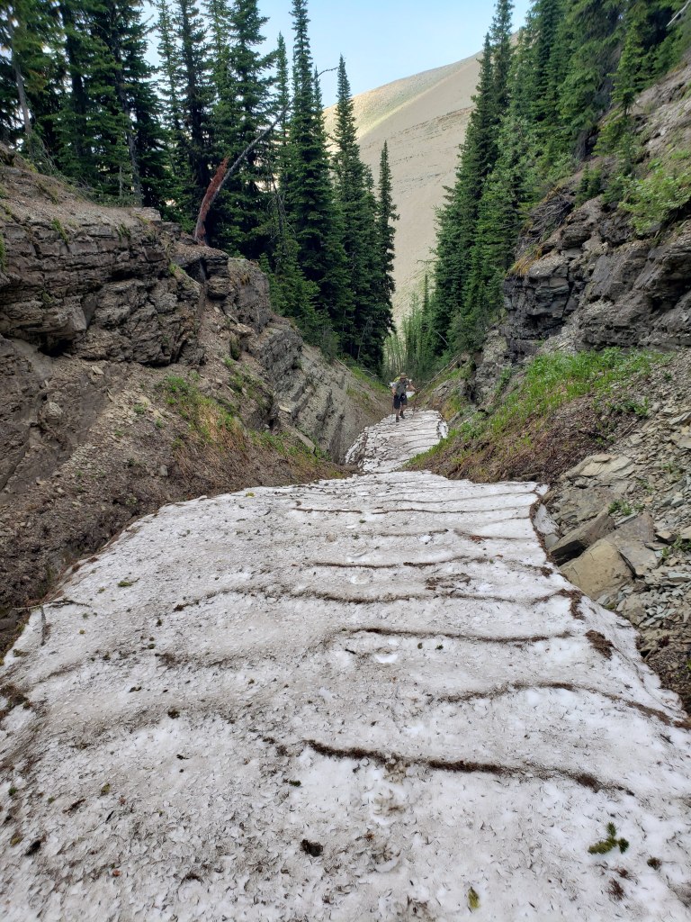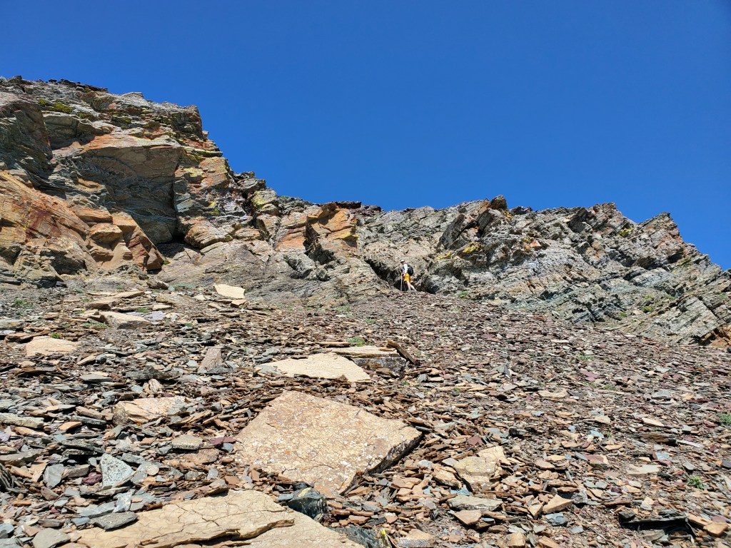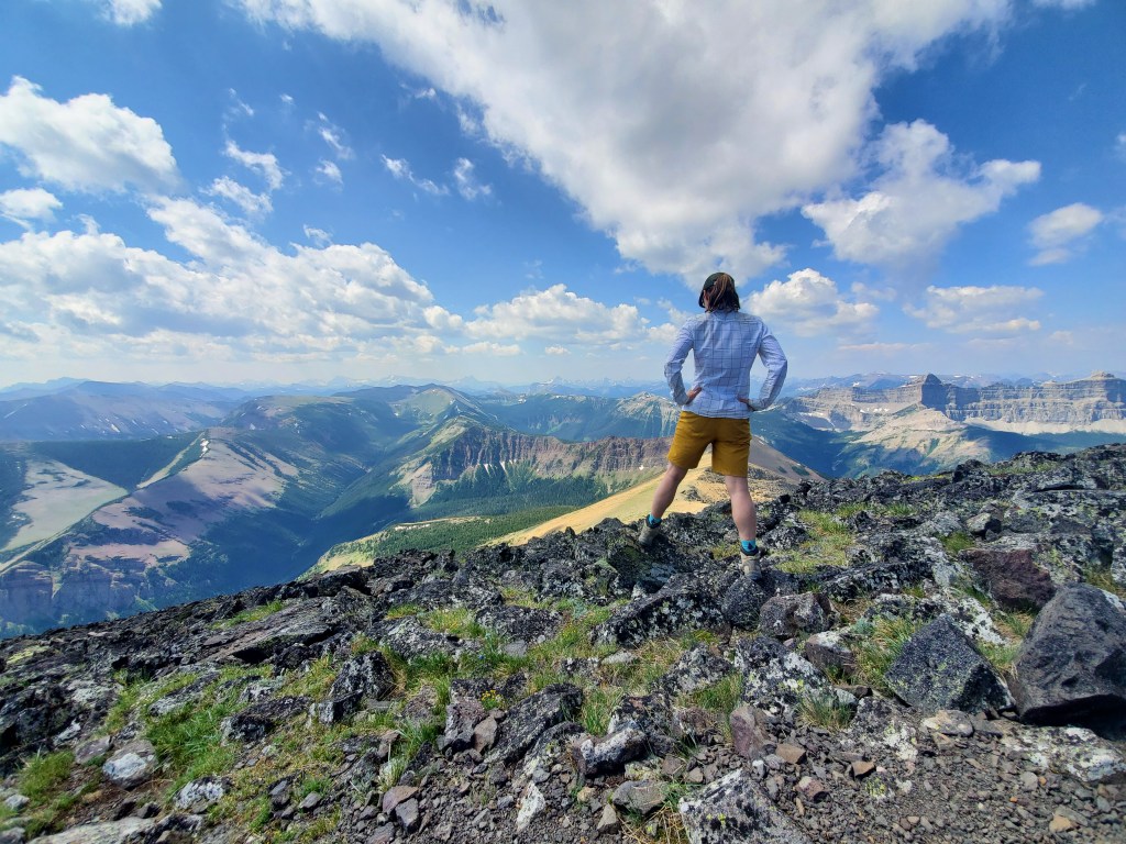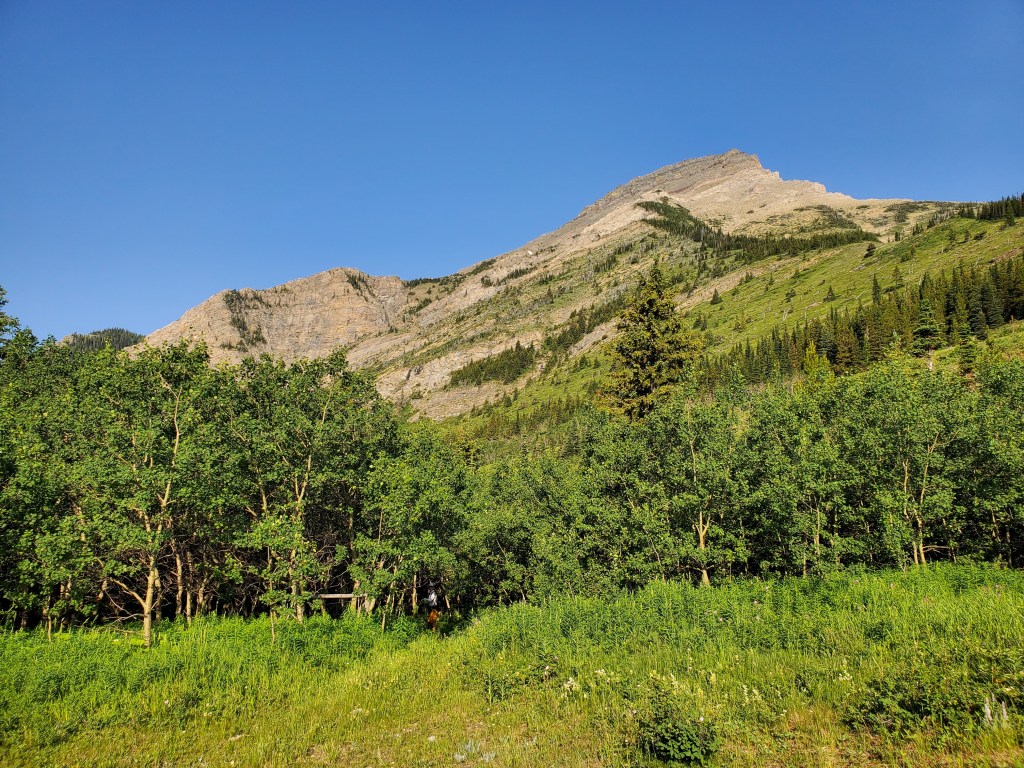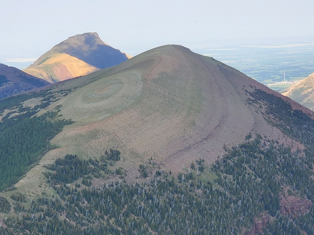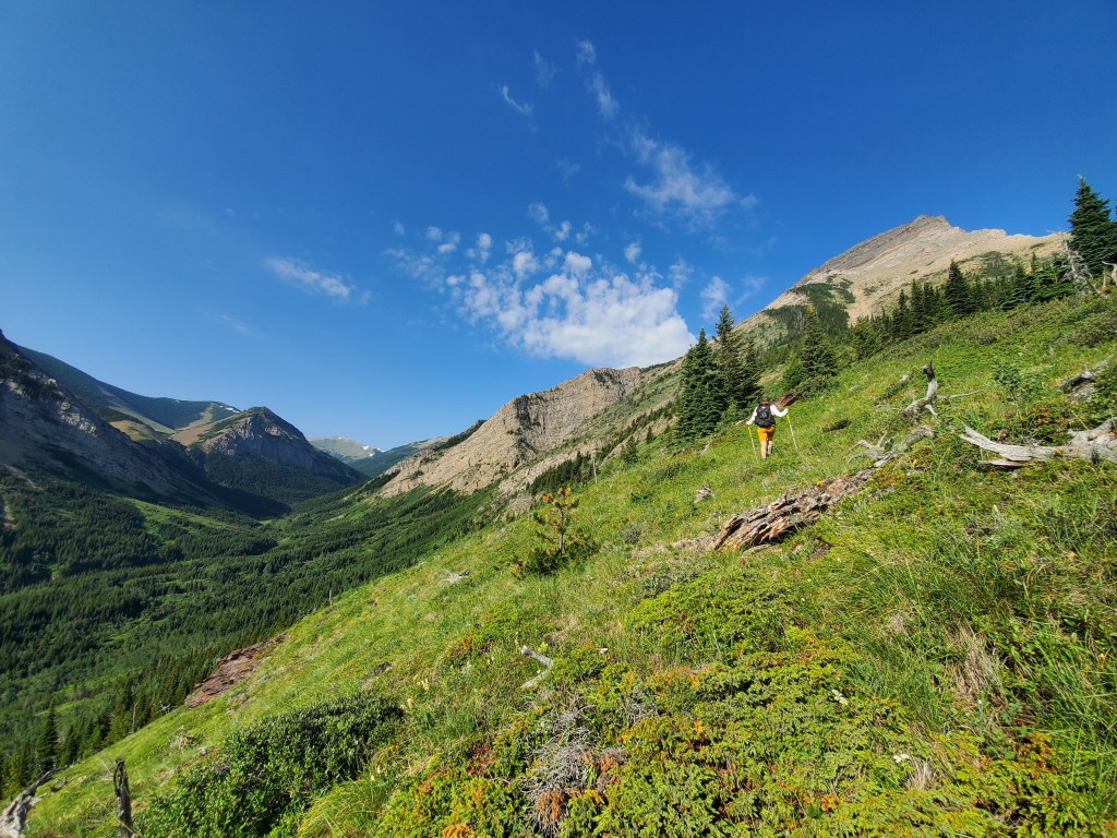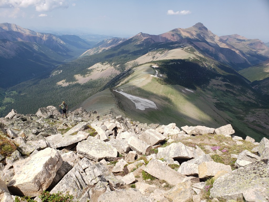 Once past the dogs, we regained our wits and continued biking toward Victoria Peak (left). We stashed our bikes in the trees below Victoria Peak and continued on foot up the grassy slopes above.The first part of the slope is grassy and open. We made our way up, trending toward Victoria Peak’s north cliff (right).Further up the terrain gets rocky and loose, making us wish we’d packed helmets.We continued up, gradually trending to the right while trying to keep to the more solid terrain in the trees.Nearing the top. From here we’ll weave our way through a couple of cliff bands below the peak.Most of the cliff bands were only moderate scrambling, choose-your-own-adventure style.This is supposed to be the moderate line through the final crux, but height may be a factor. I am only 5’4″ and I couldn’t reach the more solid holds beyond the chossy ledge at face level. The slope below me would be a decent tumble, and my hands didn’t feel solid enough to bump my feet up. This line didn’t feel positive at my height.Instead, I climbed the face to the right of the moderate line. This is an exposed scramble (the drop-off to the right is sheer and fatal), but the holds and movement felt more secure for my build.Reaching the top of the difficult scrambling section. Looking down at Dan from the top of the difficult section. The cliff to the left makes the scrambling exposed, bumping this up to a difficult rating.Reaching Victoria Peak! Views extend far across the prairies.Summit panorama.The route from Victoria Peak to Victoria Ridge will follow the backwards “C” in the ridge in front of me before heading up the grassy ridge left of center.We began the long walk to Victoria Ridge summit. Castle Peak (right) looks magnificent from this angle. Surprisingly, that mountain is shorter than the one we just summited, Victoria Peak.Looking back at Victoria Peak and the brightly coloured stripes of the slope connecting it to Victoria Ridge.Continuing through the backwards “C” part of the ridge, where the terrain gets a little more blocky. Our destination is the high point right of center in the distance.Stacked, red rock plates add interest to this section of the ridge.Looking back from another angle at the bright stripes of the ridge.These stacked, red rock plates make for delightful cliffs. We will walk out below them later.Rounding out the end of the “C” ahead and nearing the treed section of the route.We followed an obvious trail trending right, and then turned left up a gap in the trees (center). It worked, but didn’t connect as nicely as hoped. It looks like trending left at the trees would have led to an easier path.The gap in the trees was snowier and more enclosed than we expected. We followed this to its high point and then bushwhacked a few dozen meters until we were out of trees again.Once through the trees, the rest of the route comes into view. The summit of Victoria Ridge is behind the high point left of center in this photo, a bit more of a trek than it looks.Nearing the top, looking back at our long journey from Victoria Peak, the high point to the right.The high point of Victoria Ridge is the rocky mound in the otherwise smooth rolling ridgeline. Shortly past the point where this photo was taken, we were surprised to see two mountain bikers speeding toward us in the distance.Dan reaches the high point of Victoria Ridge. The ridge walk from Victoria Peak can be seen winding off into the distance at the right.The ridges are broad and uniform here, almost making it tempting to keep going to Loaf Mountain (left, not in shade), but we knew we still had a long trek back out.The infamous bullseye of Pincher Ridge.We begin the long walk back. Rather than returning over Victoria Peak, we’ll be turning right just before the “C” in the ridge and then following Pincher Creek out.A good trail leads down toward Pincher Creek.Following the trail out, looking back up at the impressive cliffs from the ridge walk earlier in the day.A small waterfall in the creek was an unexpected treat on the walk out.Continuing along trail through meadow, looking up at the cliffs from earlier.The last part of the trail was getting overgrown, but the way was still obvious.