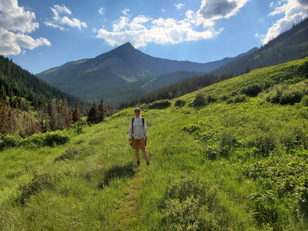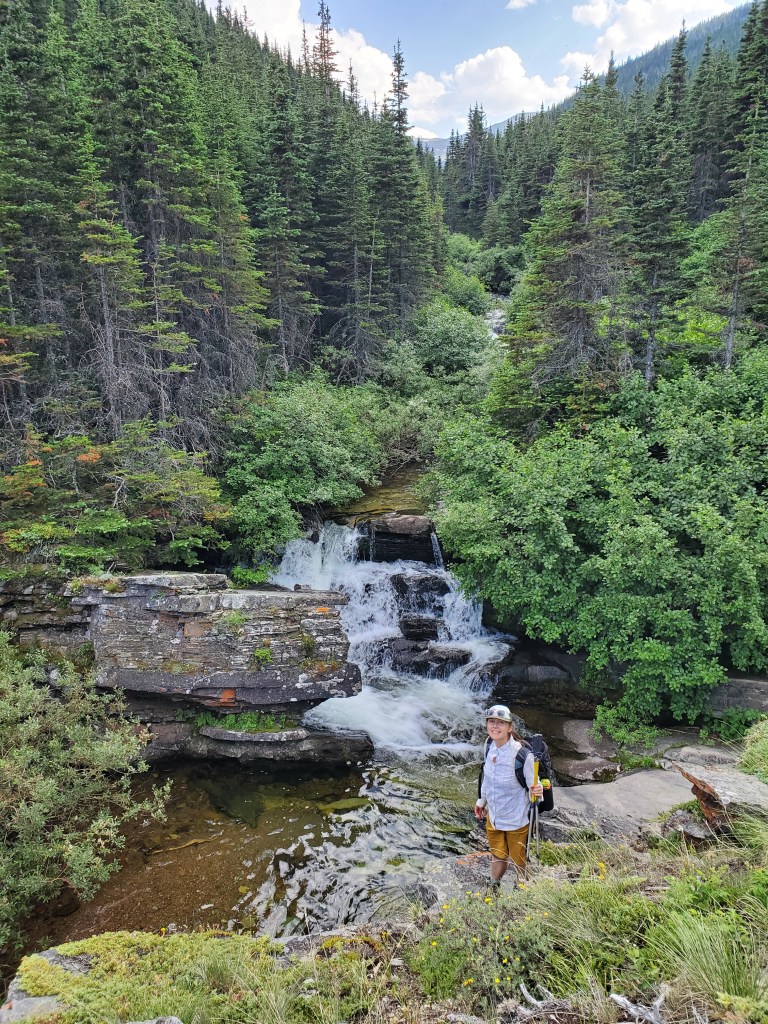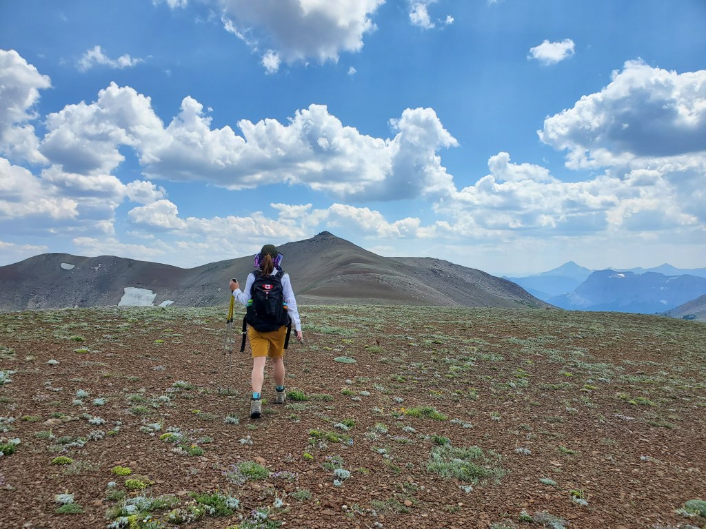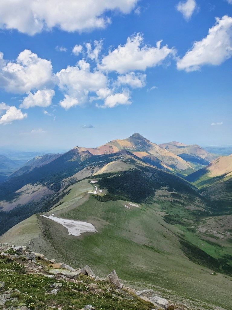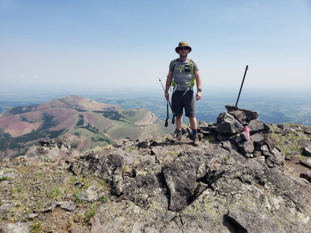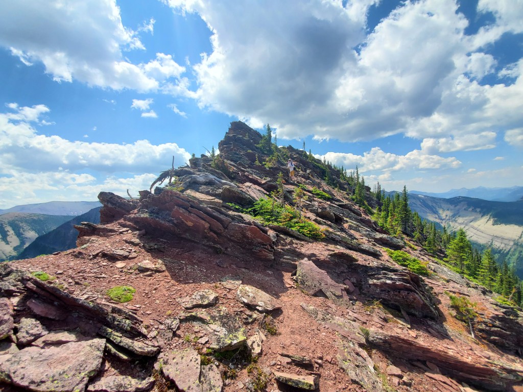 Once past the dogs, we regained our wits and continued biking toward Victoria Peak (left). We stashed our bikes in the trees below Victoria Peak and continued on foot up the grassy slopes above.The first part of the slope is grassy and open. We made our way up, trending toward Victoria Peak’s north cliff (right).Further up the terrain gets rocky and loose, making us wish we’d packed helmets.We continued up, gradually trending to the right while trying to keep to the more solid terrain in the trees.Nearing the top. From here we’ll weave our way through a couple of cliff bands below the peak.Most of the cliff bands were only moderate scrambling, choose-your-own-adventure style.This is supposed to be the moderate line through the final crux, but height may be a factor. I am only 5’4″ and I couldn’t reach the more solid holds beyond the chossy ledge at face level. The slope below me would be a decent tumble, and my hands didn’t feel solid enough to bump my feet up. This line didn’t feel positive at my height.Instead, I climbed the face to the right of the moderate line. This is an exposed scramble (the drop-off to the right is sheer and fatal), but the holds and movement felt more secure for my build.Reaching the top of the difficult scrambling section. Looking down at Dan from the top of the difficult section. The cliff to the left makes the scrambling exposed, bumping this up to a difficult rating.Reaching Victoria Peak! Views extend far across the prairies.Summit panorama.The route from Victoria Peak to Victoria Ridge will follow the backwards “C” in the ridge in front of me before heading up the grassy ridge left of center.We began the long walk to Victoria Ridge summit. Castle Peak (right) looks magnificent from this angle. Surprisingly, that mountain is shorter than the one we just summited, Victoria Peak.Looking back at Victoria Peak and the brightly coloured stripes of the slope connecting it to Victoria Ridge.Continuing through the backwards “C” part of the ridge, where the terrain gets a little more blocky. Our destination is the high point right of center in the distance.Stacked, red rock plates add interest to this section of the ridge.Looking back from another angle at the bright stripes of the ridge.These stacked, red rock plates make for delightful cliffs. We will walk out below them later.Rounding out the end of the “C” ahead and nearing the treed section of the route.We followed an obvious trail trending right, and then turned left up a gap in the trees (center). It worked, but didn’t connect as nicely as hoped. It looks like trending left at the trees would have led to an easier path.The gap in the trees was snowier and more enclosed than we expected. We followed this to its high point and then bushwhacked a few dozen meters until we were out of trees again.Once through the trees, the rest of the route comes into view. The summit of Victoria Ridge is behind the high point left of center in this photo, a bit more of a trek than it looks.Nearing the top, looking back at our long journey from Victoria Peak, the high point to the right.The high point of Victoria Ridge is the rocky mound in the otherwise smooth rolling ridgeline. Shortly past the point where this photo was taken, we were surprised to see two mountain bikers speeding toward us in the distance.Dan reaches the high point of Victoria Ridge. The ridge walk from Victoria Peak can be seen winding off into the distance at the right.The ridges are broad and uniform here, almost making it tempting to keep going to Loaf Mountain (left, not in shade), but we knew we still had a long trek back out.The infamous bullseye of Pincher Ridge.We begin the long walk back. Rather than returning over Victoria Peak, we’ll be turning right just before the “C” in the ridge and then following Pincher Creek out.A good trail leads down toward Pincher Creek.Following the trail out, looking back up at the impressive cliffs from the ridge walk earlier in the day.A small waterfall in the creek was an unexpected treat on the walk out.Continuing along trail through meadow, looking up at the cliffs from earlier.The last part of the trail was getting overgrown, but the way was still obvious.