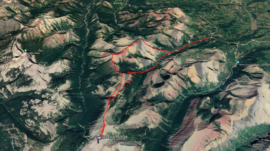 A better option: Victoria Ridge can be easily accessed by bike using the Bovin Lake Trail, along South Drywood Creek. This Alberta Parks link includes a georeferenced map which identifies the quarter section of private land below Victoria Peak that can’t be accessed. Using an app like Avenza Maps, a user can view their real life location on a georeferenced map. It might take more than a day to continue all the way to Victoria Peak and back via South Drywood Creek, but the charming backcountry campsite at Bovin Lake nicely solves that problem.