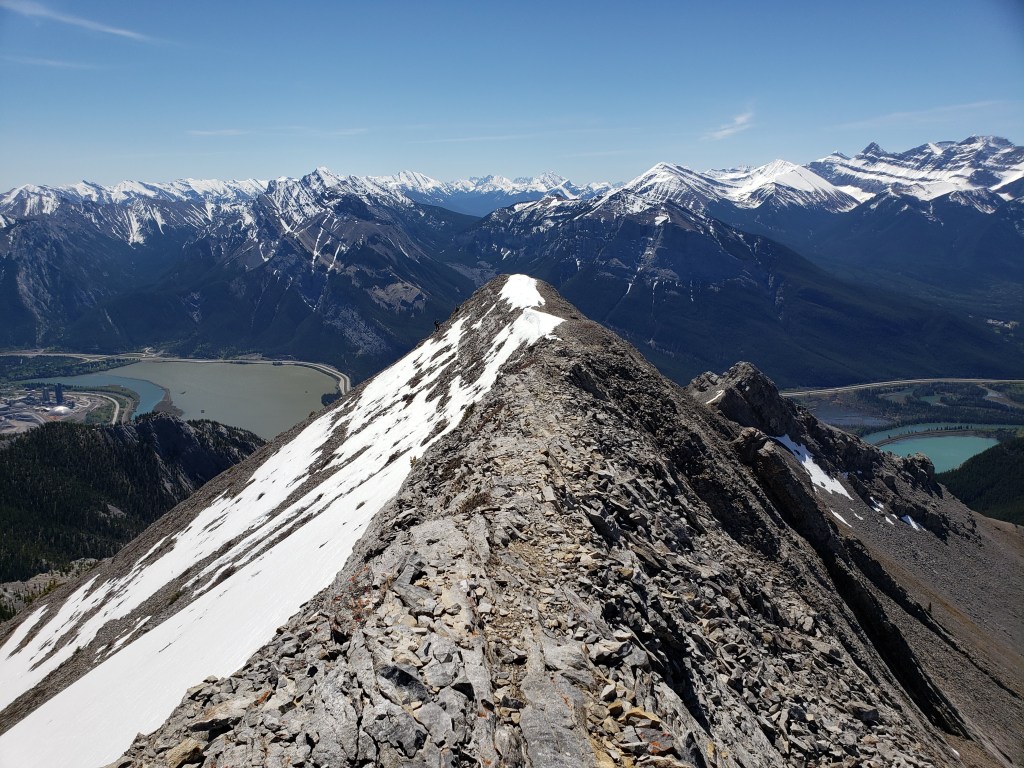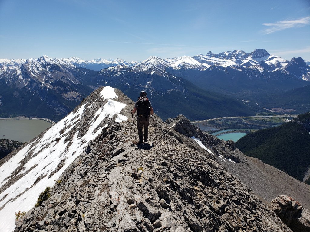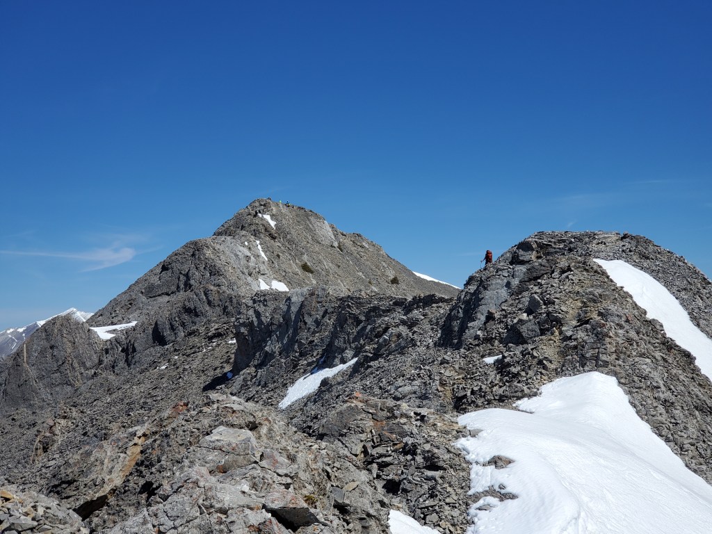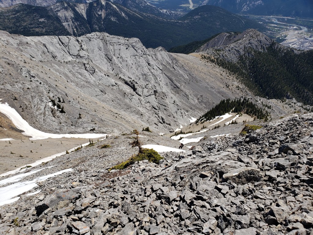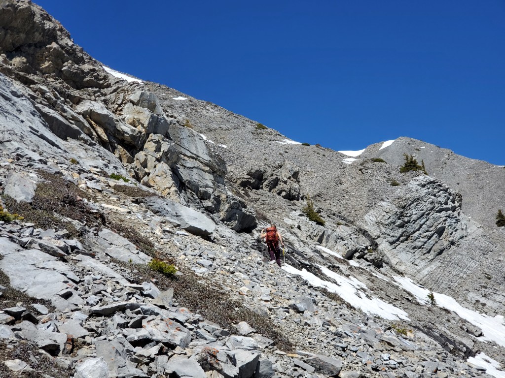 After some hiking toward our objective, an obvious trail emerges leading up the ascent ridge through the trees and toward the first cliff band.As we rose above the trees, views opened up over Lac des Arcs and surrounding peaks.When we reached the cliff where we should have found a line to the left and up, I was distracted by the beautiful rock and wasn’t too concerned about the turn since I recalled reading that there was an alternate line below a cliff. It’s an easy enough mountain that I didn’t bother pulling out the book to re-read the description. We continued on our way, staring up at the distracting cliff, and trending to the right below it.The first part of the line was easy and even had a decent trail. The turn we should have taken is behind this cliff.As the traverse below the cliff tapered out, the terrain got looser. We saw the ridge we wanted to get to and picked the easiest line up to it. Even though there was little in the way of a trail by this point, I reasoned that this was because the main route was more popular – not because we were not, in fact, on a route at all.Dan turns to follow up behind me from the end of the traverse (and the end of any semblance of a trail).Nevertheless, we reached the summit ridge. The last part of the slope was steep and loose, but it worked. Dan can be seen nearing the top of the slope here left of center. Terrain up this slope was on wet, gravely, loose slab.Looking ahead as I follow the summit ridge in the direction of the peak, which appears as the high point on the right in this photo.Following the final section of the summit ridge. A few people can be seen sitting at the peak.We reached the peak, still convinced we had taken Kane’s alternate route – I even made a note of this in the summit register. Grotto Mountain can be seen in the background to the west.Looking east to Loder Peak.Summit panorama.The traverse to Mount Fable was still looking a bit snowy, so we called it a day here.Returning back along the summit ridge. We chose to make a loop and return by the more popular route, descending to the right rather than to the left from whence we came.The block ahead in the ridge is considered the crux by many. The scrambling looks intimidating, but the holds are all there and I found it to be good fun once I was actually on it. It’s never beyond moderate scrambling. Another party had seen our “creative” ascent line and asked about returning that way to avoid this section. I hope I persuaded them that it was too loose and tedious, and that it would be too easy to miss the correct turn leading back to the main route.I paused on our descent to admire the views from some interesting rock formations.Below the rock formation is a section of loose, tedious scree – shorter than the scree on the route we’d taken though.