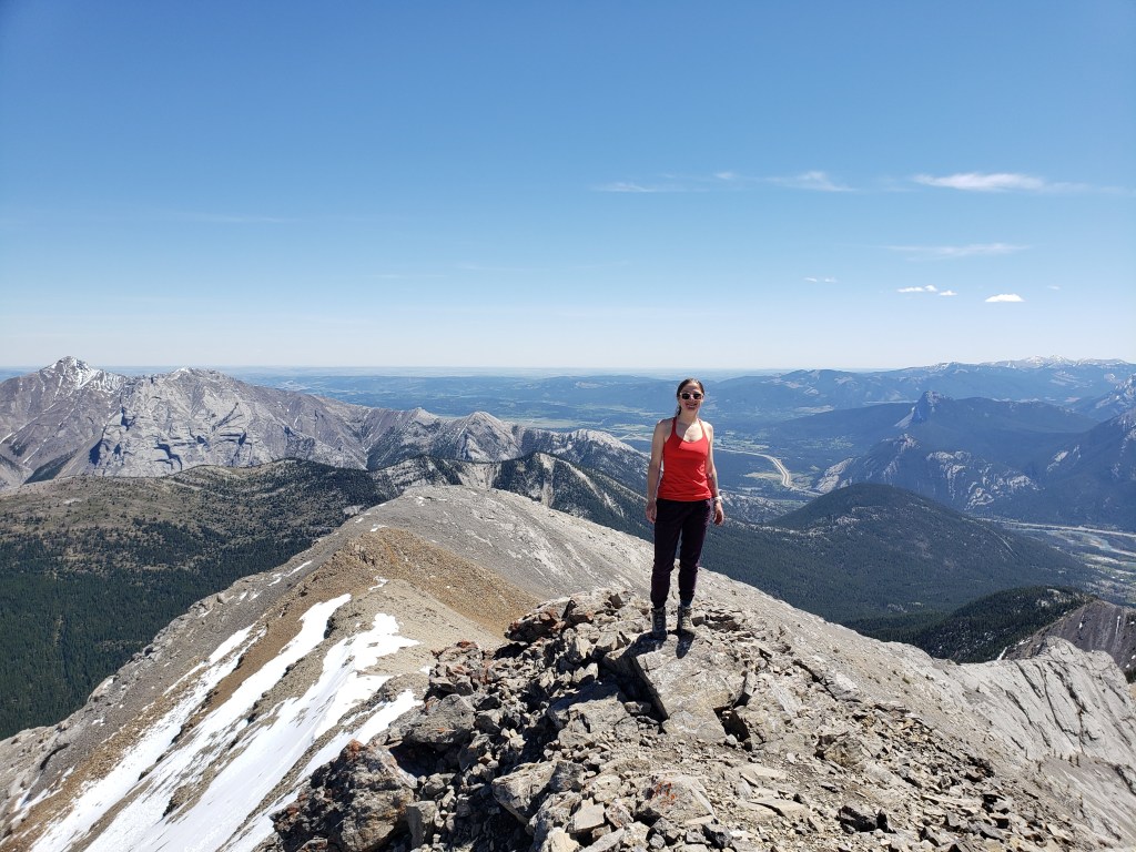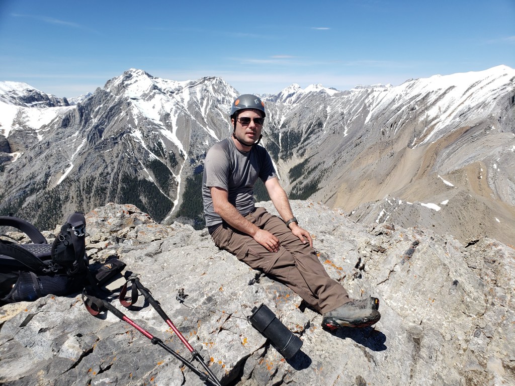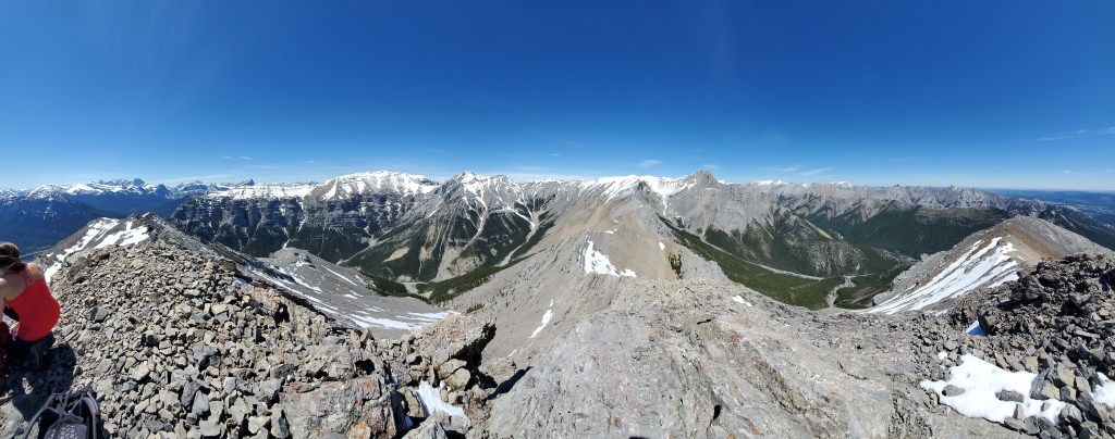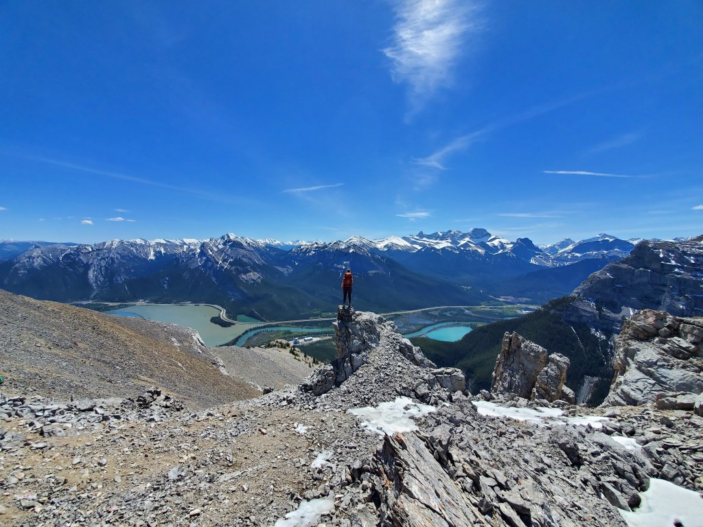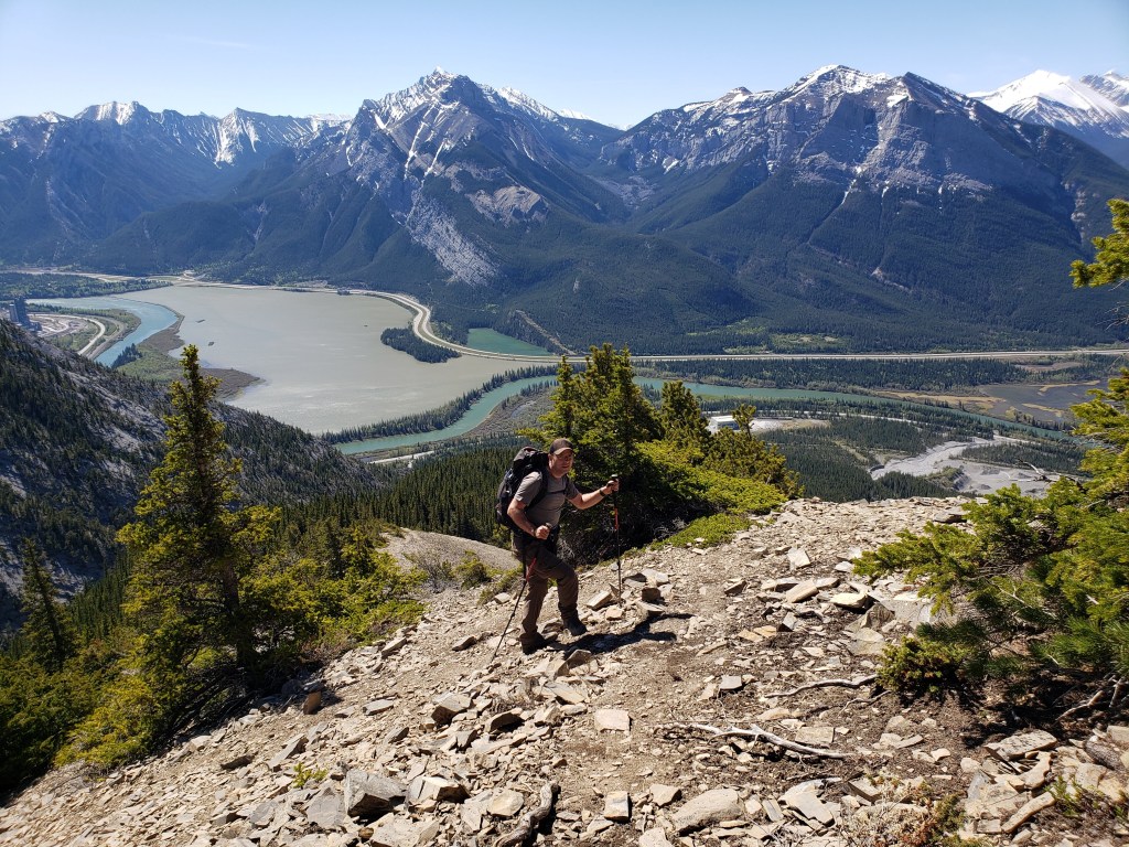 After some hiking toward our objective, an obvious trail emerges leading up the ascent ridge through the trees and toward the first cliff band.As we rose above the trees, views opened up over Lac des Arcs and surrounding peaks.When we reached the cliff where we should have found a line to the left and up, I was distracted by the beautiful rock and wasn’t too concerned about the turn since I recalled reading that there was an alternate line below a cliff. It’s an easy enough mountain that I didn’t bother pulling out the book to re-read the description. We continued on our way, staring up at the distracting cliff, and trending to the right below it.The first part of the line was easy and even had a decent trail. The turn we should have taken is behind this cliff.As the traverse below the cliff tapered out, the terrain got looser. We saw the ridge we wanted to get to and picked the easiest line up to it. Even though there was little in the way of a trail by this point, I reasoned that this was because the main route was more popular – not because we were not, in fact, on a route at all.Dan turns to follow up behind me from the end of the traverse (and the end of any semblance of a trail).Nevertheless, we reached the summit ridge. The last part of the slope was steep and loose, but it worked. Dan can be seen nearing the top of the slope here left of center. Terrain up this slope was on wet, gravely, loose slab.Looking ahead as I follow the summit ridge in the direction of the peak, which appears as the high point on the right in this photo.Following the final section of the summit ridge. A few people can be seen sitting at the peak.We reached the peak, still convinced we had taken Kane’s alternate route – I even made a note of this in the summit register. Grotto Mountain can be seen in the background to the west.Looking east to Loder Peak.Summit panorama.The traverse to Mount Fable was still looking a bit snowy, so we called it a day here.Returning back along the summit ridge. We chose to make a loop and return by the more popular route, descending to the right rather than to the left from whence we came.The block ahead in the ridge is considered the crux by many. The scrambling looks intimidating, but the holds are all there and I found it to be good fun once I was actually on it. It’s never beyond moderate scrambling. Another party had seen our “creative” ascent line and asked about returning that way to avoid this section. I hope I persuaded them that it was too loose and tedious, and that it would be too easy to miss the correct turn leading back to the main route.I paused on our descent to admire the views from some interesting rock formations.Below the rock formation is a section of loose, tedious scree – shorter than the scree on the route we’d taken though.