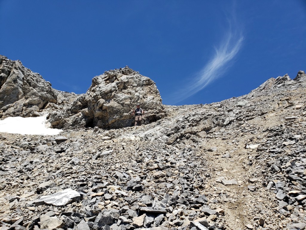 We returned back to our vehicle on an obvious trail, with a round trip time of 6 1/2 hours. It wasn’t until we were driving home that I opened my book to make notes on our route, parking etc. and realized that Kane’s alternate route goes left under the cliff, not right. We were so confident that we were on-route, that we followed the line all the way to the peak without hesitation. If I were going back to do this one with a friend, I would insist on sticking with Kane’s main route. There is one section of moderate scrambling, but the rock is solid and the movement felt secure. The route we took is loose enough for significant rock fall, particularly likely to result in injury on a mountain as popular as this one.