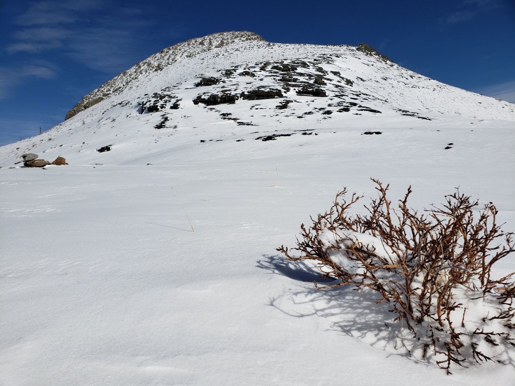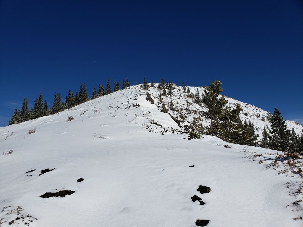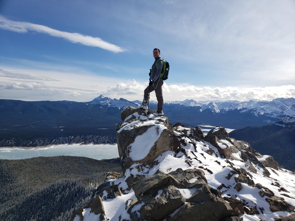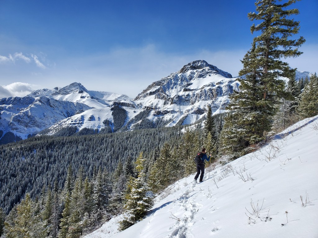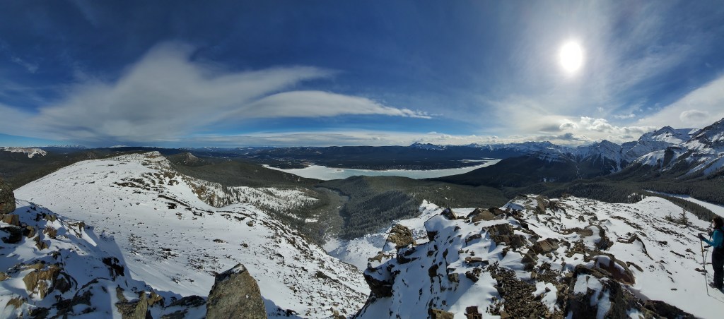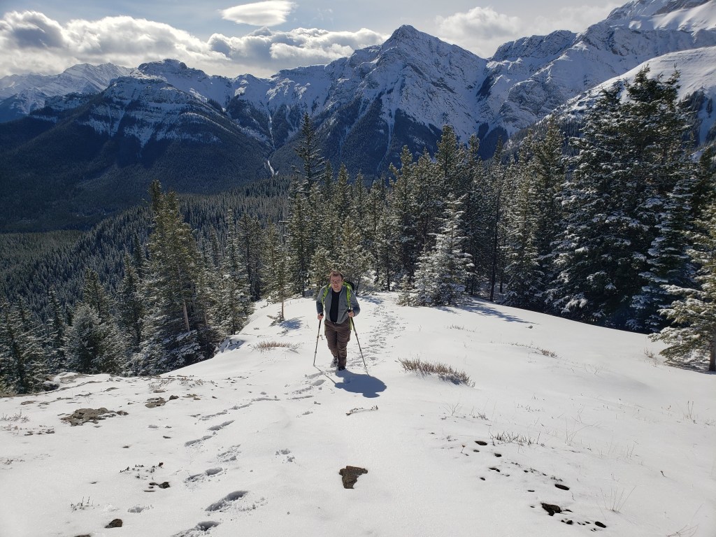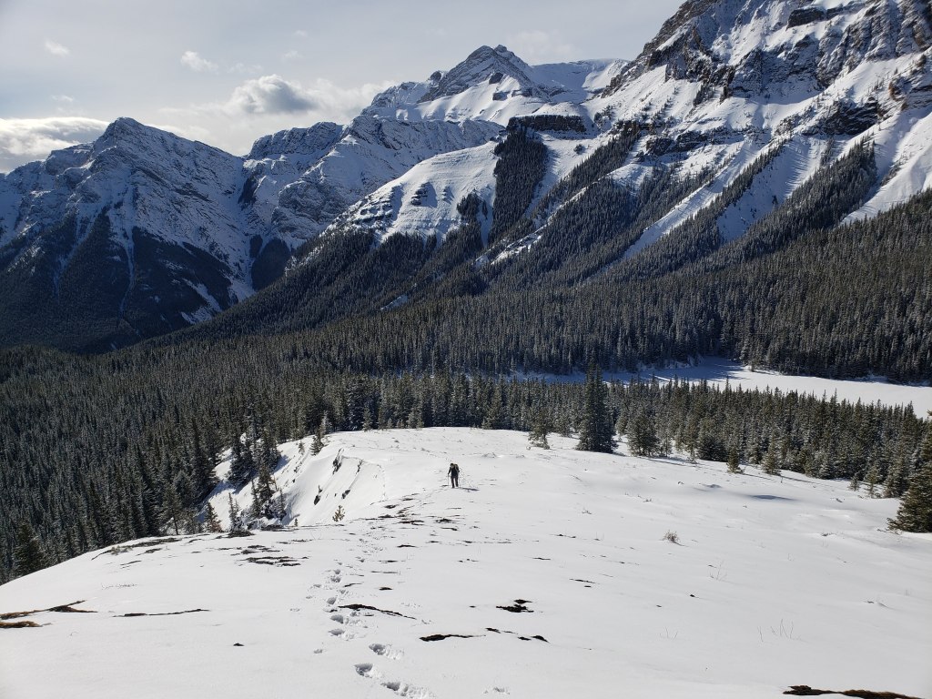 An obvious trail is picked up across the highway, on the north side of Allstones Creek. The elevation gain is gradual for the majority of the route.After almost an hour in the trees, the surroundings started to open around us. In the background, Kista Peak (left) stands above Abraham Lake.As we neared the top, we first crossed below this small avalanche slope and then gained the high point from the southwest. The snow on this slope was fairly shallow on this day, but the slope may be a concern with deeper snow.Just before reaching the lake, we made a right turn toward the highpoint of the ridge. Two groups ahead of us had been turned back by the snow depth, but we found it was only deep for about 50 m, where it had accumulated in a flat stand of trees. Once above the trees, travel was easy again. Behind us are The Buckle (left) and Talus Peak (center).The final slope to the top of Allstones Ridge was fairly gentle and the thin, windswept snow caused us no issues.Looking back at Dan. Allstones Lake is to the right and the slopes above it are a toe of Allstones Peak.Nearly at the top, little more than a stroll away.Dan at the top of Allstones Ridge, with Abraham Lake in the background.Summit panorama.We returned the way we came, passing many groups along the way on this popular trail.