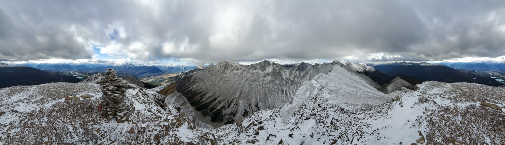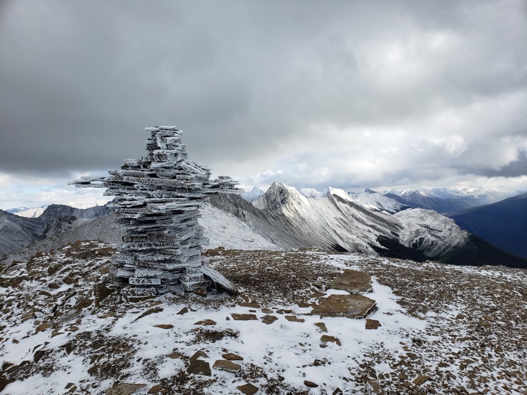 We picked up the trail from Maligne Lake Road and followed it up along the edge of a drainage to treeline. The trail is steep with about 1000 m of elevation gained in 2 hrs. This photo is looking back at the Jasper townsite.Looking ahead, a short, scrambly section leads to the summit ridge. The scrambling is never beyond easy.Gazing south at the peaks of Skyline Trail including Excelsior Mountain (left) and Mount Tekarra (center-right).Continuing along the summit ridge. The large summit cairn can just barely be made out in the distance to the left.There was one short section of downclimbing along the summit ridge. This gentle ramp would typically be an easy walk, but had a particularly fierce coating of frost on the day we were out.Looking southeast along the Colin Range. In the foreground, Roche Bonhomme’s summit cairn is encased in hoar frost.Looking west from the summit to Pyramid Mountain (left) and The Palisade (center). Autumn can still be seen lingering in the valley below us, but the cold bite of winter has very much arrived in the alpine.Summit panorama.We returned the way we came, happy to be back in the trees.We passed several other parties, with varying levels of winter layers. Most seemed to have turned back just below the summit ridge, having possibly misjudged how frosty it would be above treeline. Back in the Jasper townsite, looking northeast at Roche Bonhomme from Connaught Drive. A face can clearly be seen just left of center – he is asleep on his back with his hands clasped in front of him on his belly (right of center). The ascent route follows an avalanche gully just behind (left of) his head.