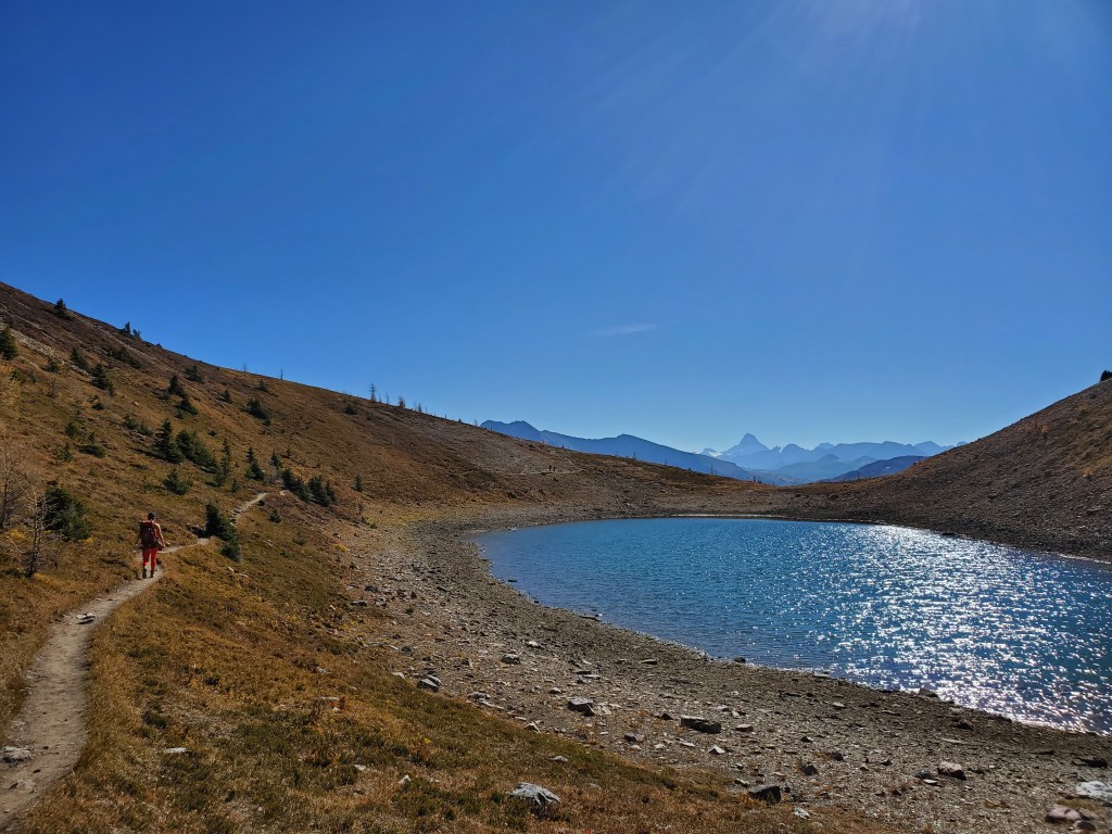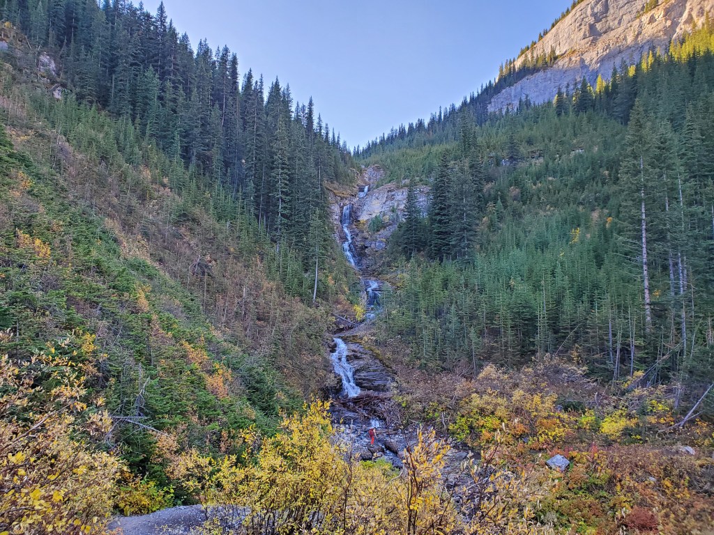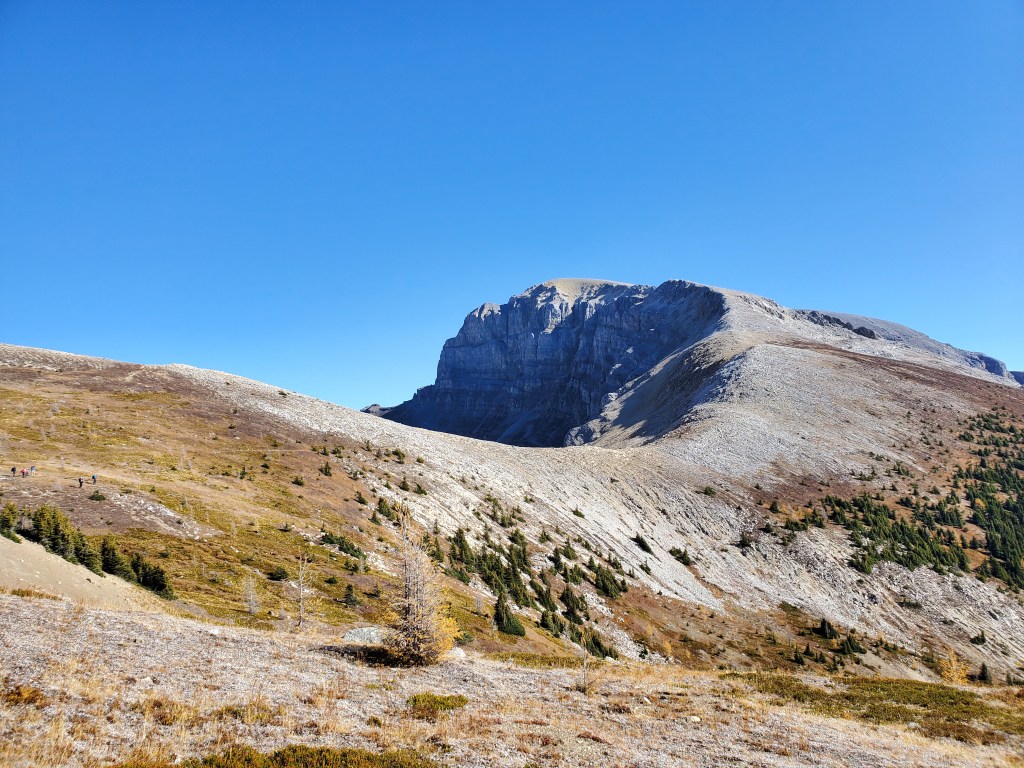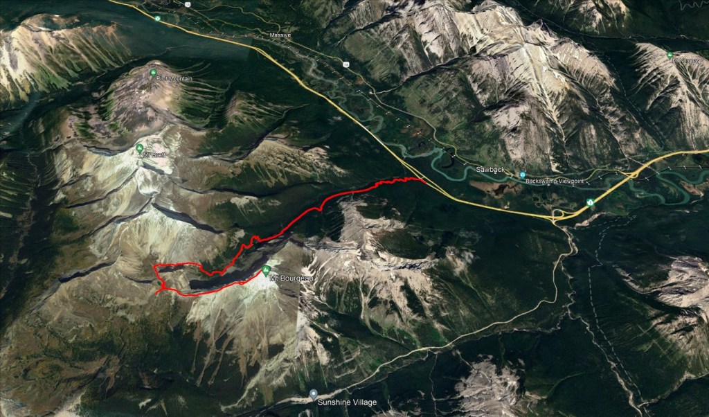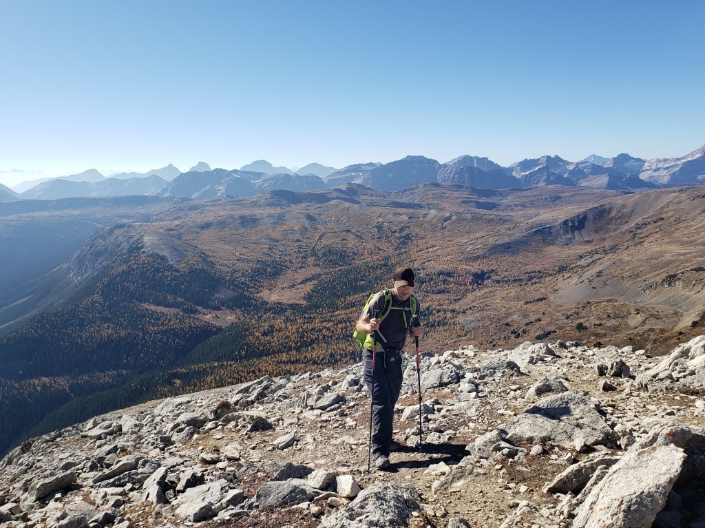 The crux of the day proved to be finding parking on this unusually warm October day. Once on our way, the trail was easy, well-graded, and bustling with people.A tall, cascading waterfall is passed along the trail. I am the figure in orange at the base of the falls.Bourgeau Lake is reached in under two hours. The bright turquoise water will be more stunning in the afternoon Sun. For now, we will continue hiking and gain these cliffs from the right (by a route not visible in this photo).Continuing on and looking back at Bourgeau Lake. The peak of Mount Bourgeau can be seen to the left.Once above the lake, the trail turns left to Harvey Pass, the rise ahead. Looking back from Harvey Pass at Dan, ahead of a line of other people pursuing the same objective today.A lovely alpine tarn makes Harvey Pass a fine place to pause for a break. Once satisfied with the the views, the route up Mount Bourgeau is to the left.Standing at Harvey Pass, looking across the larch-covered mountains surrounding Sunshine Village. Mount Assiniboine can be seen further in the distance, left of center.Studying the rest of the route up Mount Bourgeau from Harvey Pass. The gentle line to the peak is obvious from here.Looking back as Dan follows along the well-worn route to the summit.This was the only part of the day that might be considered scrambling. If not for the attention given by hikers we passed, I probably would have breezed past without noticing it. The peak is just ahead (center).Looking back, Dan is standing on the cliff seen earlier above Bourgeau Lake. The lake is out of view, below the cliff edge. Glaciated Mount Ball can be seen at the left.A modest cairn marks the summit. In the background the Bow Valley winds off into the distance, framed by Mount Norquay and Cascade Mountain to the left and by Sundance Peak to the right.Dan gives Mount Assiniboine an assuring pat on the head.Victory selfie. Dan was so taken by Pilot Mountain (right) that it made our must-do list for the following summer!Summit panorama.We returned the way we came, pausing again at the alpine tarn in Harvey Pass.Approaching another small tarn along the trail back to Bourgeau Lake.Gazing back up at our route above Bourgeau Lake, with its turquoise water now glittering in the warm afternoon sun.We enjoyed our last glimpse of the sky before beginning the long walk out through the trees.