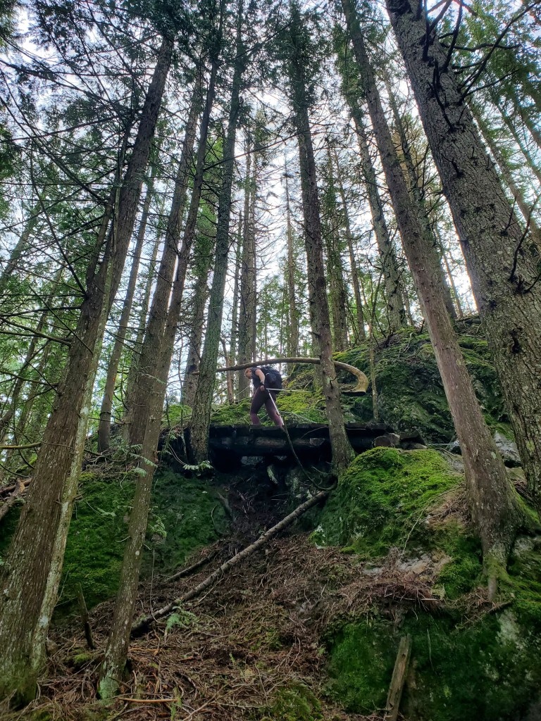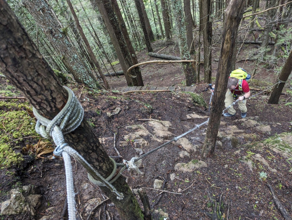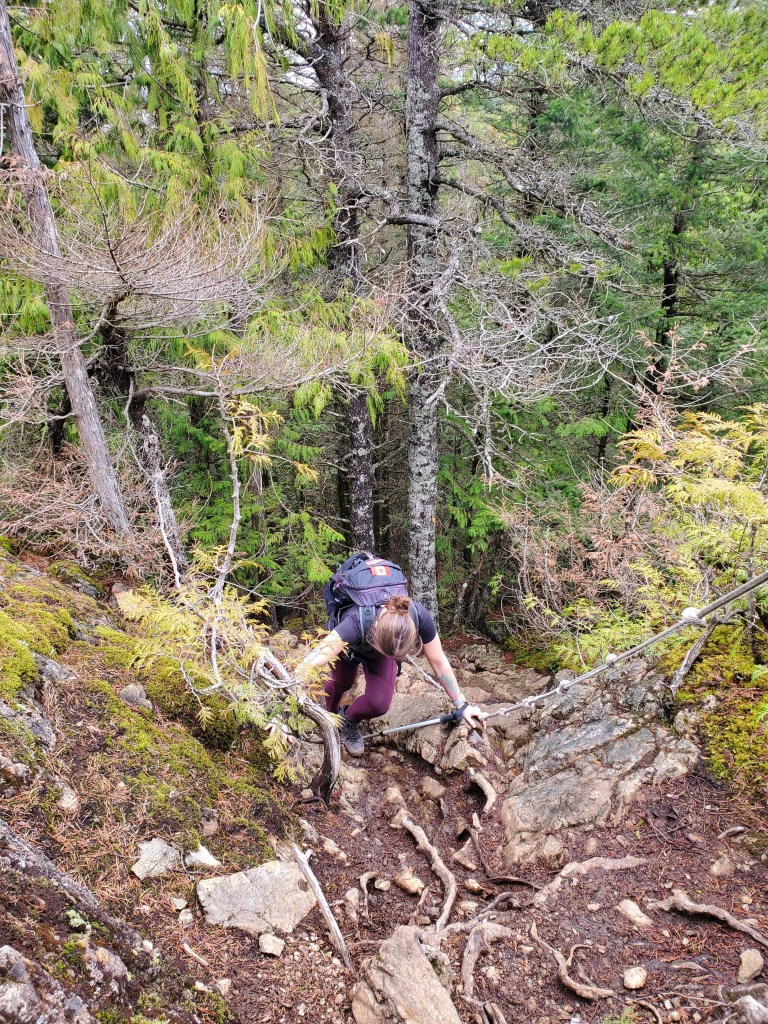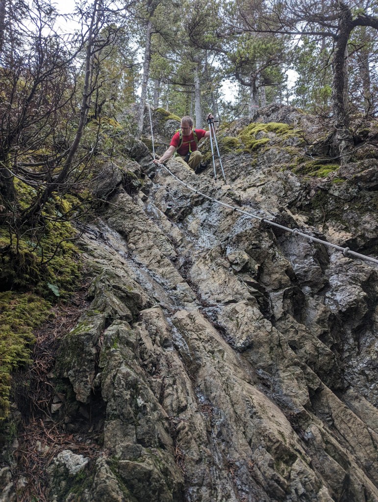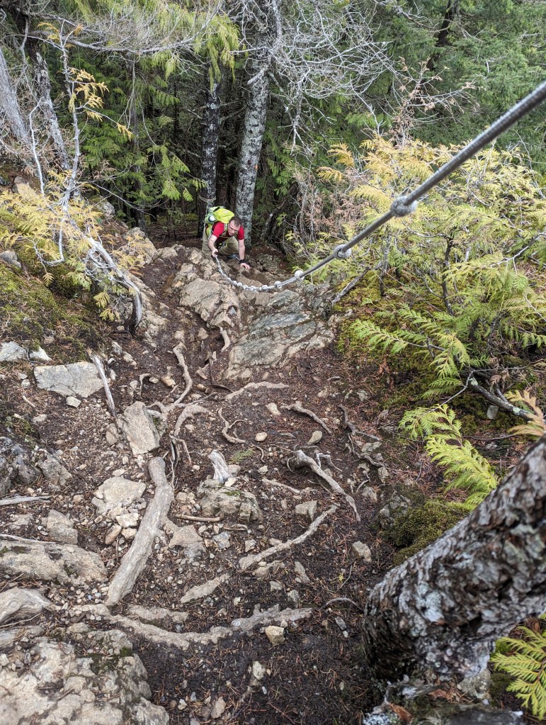 A small sign-post (left) marks the turn-off from the ungraded road to the start of the trail. The short walk up the road might be the most tiring part of the day!After hiking up two switchbacks the ridge trail is easily gained. The ridge is densely treed with only a few viewpoints. The first one, at ~3.5 km, is centered nicely above the Yarrow townsite.The ridgeline trail has a few hills, but is very simple up until the summit block – pointed to by Dan. A short, steep trail winds around the left and requires a few moves of easy scrambling. I don’t recall doing this last section on our 5th grade field trip.Looking at the start of the route up the summit block. Metal grips on the wood slats help with footing, and there is also a chain bolted into the rock for hand support; but this is easiest when fully dry.The first of two rope sections. Though only easy scrambling, we appreciated the rope for this day’s muddy conditions.The second rope section is slightly steeper, but was drier too, thankfully.The peak itself is mostly treed with only a narrow view southeast over Cultus Lake and Lindell.Signage to a north viewpoint led us to our best views of the day. Below lies Sumas Prairie framed by Sumas Mountain to the north (center) and the Vedder Canal to the East (right). The former Sumas Lake would have been roughly at the center of this photo for most of the year, but could extended across all of Sumas Prairie during flood season. The lake was drained in the 1920’s.We returned the way we came and downclimbed the rope section.A shot look back up at the upper rope section.Looking up at the lower rope section. In dry conditions I don’t think the rope would be needed.On the way out we again passed the viewpoint overlooking the Yarrow townsite. A lot has changed since I was a child, but there are still plenty of spots I recognize!
