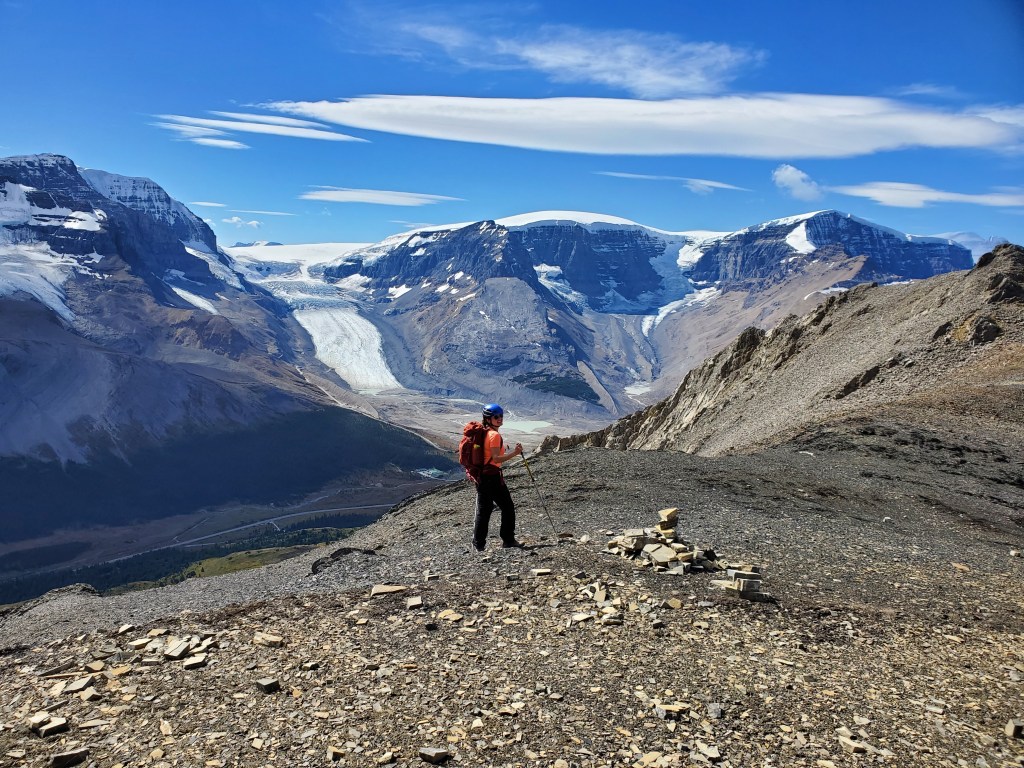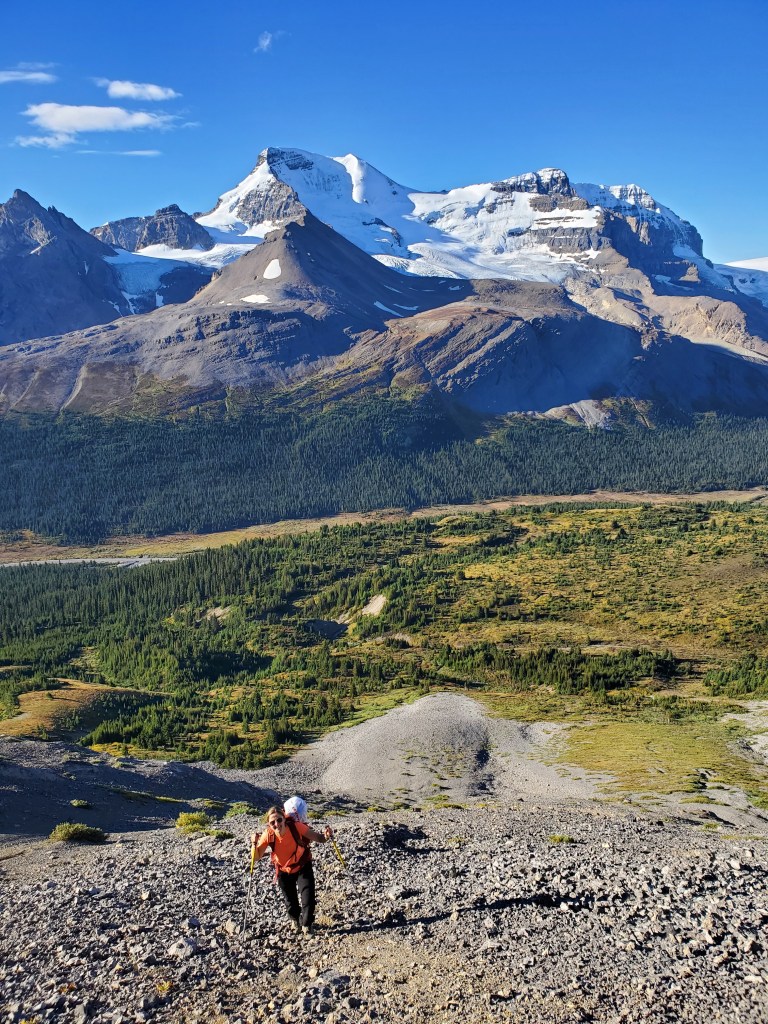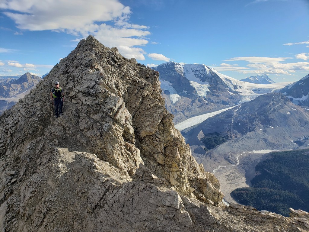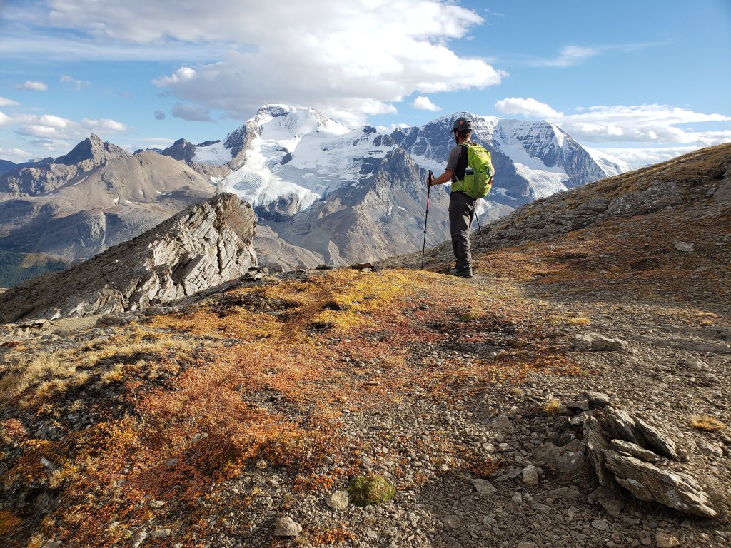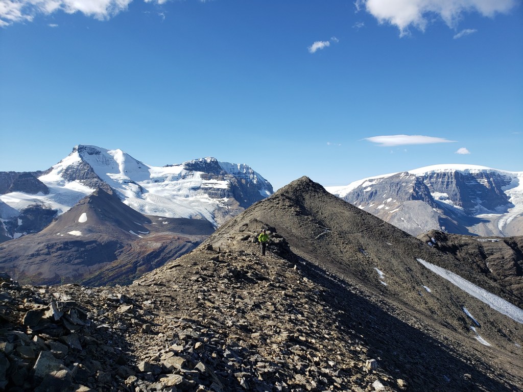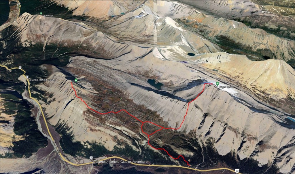 The trail up to Wilcox Pass is wide and well-maintained. We happened upon this handsome grouse, being the first ones on the trail this morning. The wildflowers had long-since finished blooming for the season, but their remaining tufts were still stunning in the low morning sun.We left the trail once the trees opened up into plateau and turned right, heading for Nigel first. We will start by gaining the ridge ahead of us. An easy slope exists at roughly the middle of this photo, about 200m before a large drainage. Nigel Peak can be seen above the ridge, left of center.Looking back: Mount Athabasca, Mount Andromeda, and the Little A Glacier dominate the horizon.To the east lies a distinctive subpeak of Nigel (Nigel SE3).Once the ridge is gained, the remaining route comes into view. To gain the peak (center) we will first traverse left to the north arête (left). A faint trail can just be seen.Looking back at Dan on the ridge, with Mount Athabasca, Mount Andromeda, and Snowdome in the background.The traverse is much easier once closer. A good trail leads across to the north arête.Looking back at the ascent ridge (foreground), behind which the Athabasca Glacier flows from between Mount Andromeda (center-left) and Snowdome (right).Reaching the arête, the remaining route up is along Nigel’s glacier. The route is quite close to the glacier in places. I would pack my mountaineering axe if doing this one again – even so, a slide on this glacier would almost certainly be fatal. At the left are two parallel ridges – the closer one (in shadow) is the ridge of Nigel, and the one behind it is Mount Wilcox.Gazing across at an impressive spire . A cairn in the foreground confirms that we are on route.A steep section is negotiated just before the summit. We’d had a good view of the sharp drop below the Nigel glacier when we’d done Tangle Ridge earlier in the summer and proceeded very carefully through this section.A shot looking back down this section. The moves are only easy scrambling, but I feel that the fall potential bumps this up to difficult scrambling.Dan nears the top of Nigel Peak. A string of 11,000ers can be seen to the left behind Wilcox, including the dazzling duo of Diadem and Wooley, divided by their snowy col.At last, the peak is just ahead.Topping out on Nigel Peak. Sunwapta can be seen at the left.Summit panorama.We began our descent route, returning to the pass the same way we’d come before heading across to Wilcox.Dan downclimbs a cliff band just below the summitI begin descending the steep section.Returning to the ridge. In the background are Mount Andromeda, Snowdome, and Mount Kitchener.We make our way across the pass, radiant in fall colours. Our next objective, Mount Wilcox, rises at center.Once back on the Wilcox Pass trail, an obvious well-worn route led to the shoulder of Wilcox. The majority of the hikers ahead of us turned back at the shoulder.The shoulder of Wilcox alone is certainly worthy of a day out, offering spectacular views of Mount Athabasca!A tired as we were by this point, we continued on beyond the shoulder.The Moderate scrambling rating is fair for Wilcox. There were a few braiding trails through the cliffs, all roughly equivalent in difficulty. The popularity of this peak makes rockfall a real concern and we were glad to have helmets.The handful of intertwining trails merge at the high point ahead. From there, only a few meters along the ridge will remain.The last few meters to the summit (ahead) feel a bit more exposed and would probably be the crux of the route. This section is still within moderate scrambling.Looking back as Dan begins this final cruxy section. Mount Andromeda and the Athabasca Glacier make for a spectacular backdrop.Looking north from the top of Mount Wilcox as a raven (center) circles us. Tangle ridge is at center with Sunwapta peeking out at the rightLooking southeast over Wilcox Pass to the peak we just came from. Nigel Peak stands at the opposite side of the pass.Summit panorama.We returned the way we came, picking our way back through the braiding trails across Wilcox’s vertical rock bandsOne last pause on the shoulder of Wilcox. From here we’ll return to the obvious, well-maintained Wilcox Pass trail and return to the parking lot.