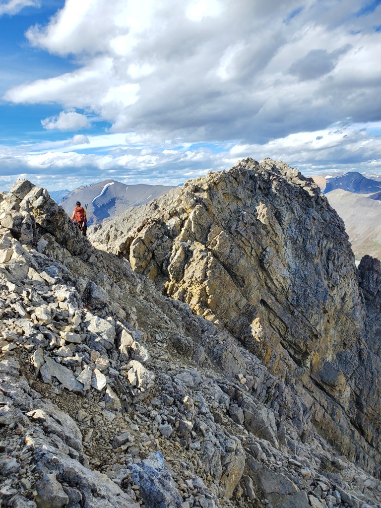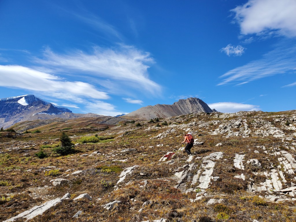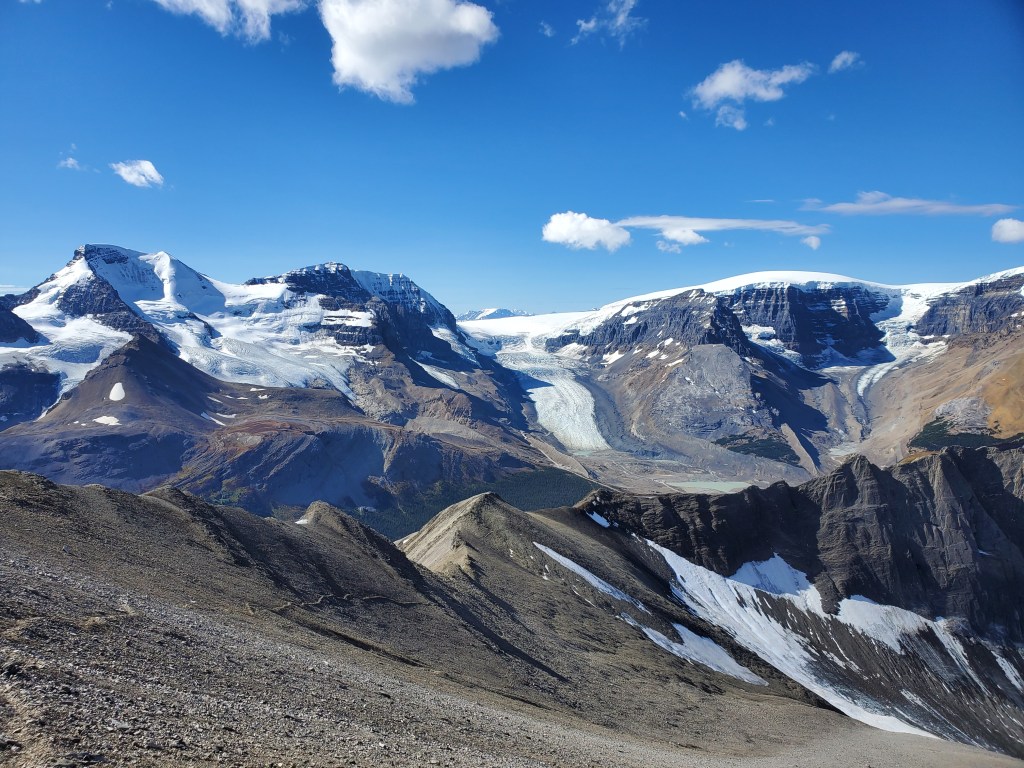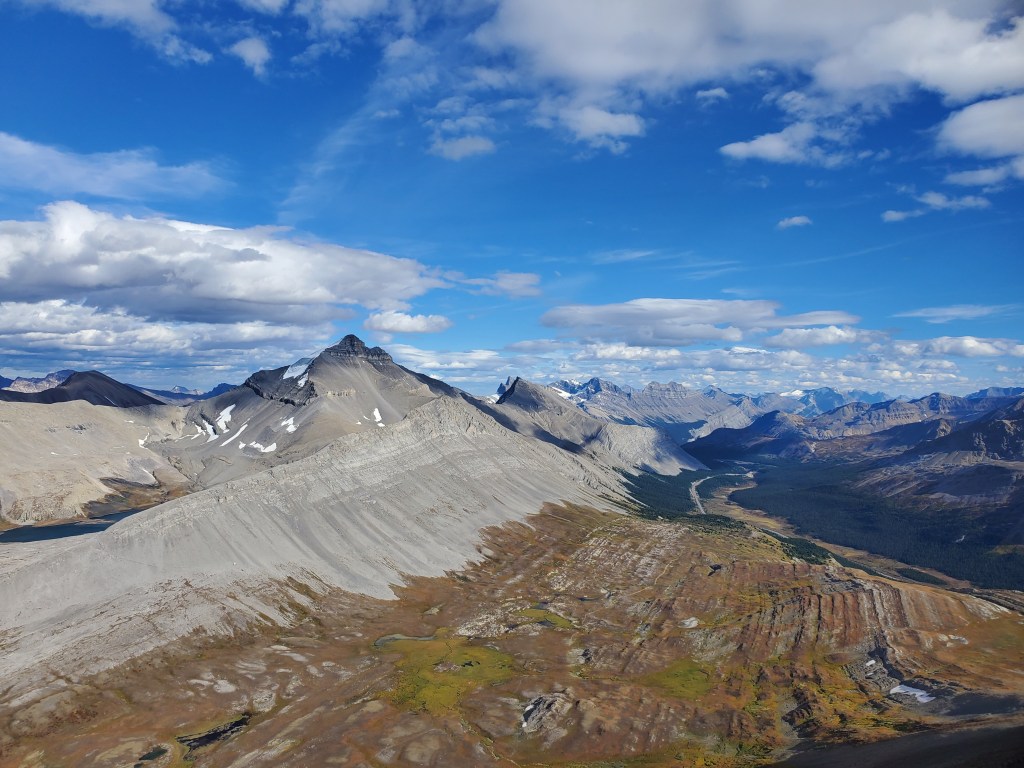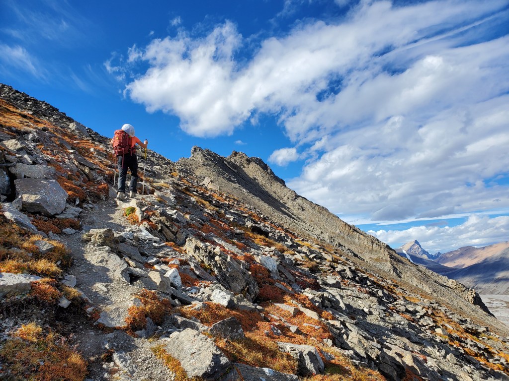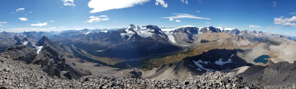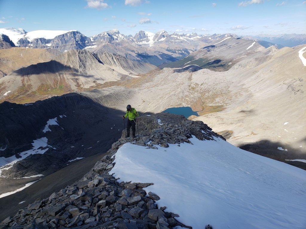 The trail up to Wilcox Pass is wide and well-maintained. We happened upon this handsome grouse, being the first ones on the trail this morning. The wildflowers had long-since finished blooming for the season, but their remaining tufts were still stunning in the low morning sun.We left the trail once the trees opened up into plateau and turned right, heading for Nigel first. We will start by gaining the ridge ahead of us. An easy slope exists at roughly the middle of this photo, about 200m before a large drainage. Nigel Peak can be seen above the ridge, left of center.Looking back: Mount Athabasca, Mount Andromeda, and the Little A Glacier dominate the horizon.To the east lies a distinctive subpeak of Nigel (Nigel SE3).Once the ridge is gained, the remaining route comes into view. To gain the peak (center) we will first traverse left to the north arête (left). A faint trail can just be seen.Looking back at Dan on the ridge, with Mount Athabasca, Mount Andromeda, and Snowdome in the background.The traverse is much easier once closer. A good trail leads across to the north arête.Looking back at the ascent ridge (foreground), behind which the Athabasca Glacier flows from between Mount Andromeda (center-left) and Snowdome (right).Reaching the arête, the remaining route up is along Nigel’s glacier. The route is quite close to the glacier in places. I would pack my mountaineering axe if doing this one again – even so, a slide on this glacier would almost certainly be fatal. At the left are two parallel ridges – the closer one (in shadow) is the ridge of Nigel, and the one behind it is Mount Wilcox.Gazing across at an impressive spire . A cairn in the foreground confirms that we are on route.A steep section is negotiated just before the summit. We’d had a good view of the sharp drop below the Nigel glacier when we’d done Tangle Ridge earlier in the summer and proceeded very carefully through this section.A shot looking back down this section. The moves are only easy scrambling, but I feel that the fall potential bumps this up to difficult scrambling.Dan nears the top of Nigel Peak. A string of 11,000ers can be seen to the left behind Wilcox, including the dazzling duo of Diadem and Wooley, divided by their snowy col.At last, the peak is just ahead.Topping out on Nigel Peak. Sunwapta can be seen at the left.Summit panorama.We began our descent route, returning to the pass the same way we’d come before heading across to Wilcox.Dan downclimbs a cliff band just below the summitI begin descending the steep section.Returning to the ridge. In the background are Mount Andromeda, Snowdome, and Mount Kitchener.We make our way across the pass, radiant in fall colours. Our next objective, Mount Wilcox, rises at center.Once back on the Wilcox Pass trail, an obvious well-worn route led to the shoulder of Wilcox. The majority of the hikers ahead of us turned back at the shoulder.The shoulder of Wilcox alone is certainly worthy of a day out, offering spectacular views of Mount Athabasca!A tired as we were by this point, we continued on beyond the shoulder.The Moderate scrambling rating is fair for Wilcox. There were a few braiding trails through the cliffs, all roughly equivalent in difficulty. The popularity of this peak makes rockfall a real concern and we were glad to have helmets.The handful of intertwining trails merge at the high point ahead. From there, only a few meters along the ridge will remain.The last few meters to the summit (ahead) feel a bit more exposed and would probably be the crux of the route. This section is still within moderate scrambling.Looking back as Dan begins this final cruxy section. Mount Andromeda and the Athabasca Glacier make for a spectacular backdrop.Looking north from the top of Mount Wilcox as a raven (center) circles us. Tangle ridge is at center with Sunwapta peeking out at the rightLooking southeast over Wilcox Pass to the peak we just came from. Nigel Peak stands at the opposite side of the pass.Summit panorama.We returned the way we came, picking our way back through the braiding trails across Wilcox’s vertical rock bandsOne last pause on the shoulder of Wilcox. From here we’ll return to the obvious, well-maintained Wilcox Pass trail and return to the parking lot.