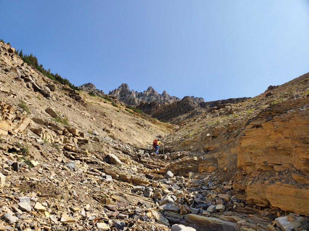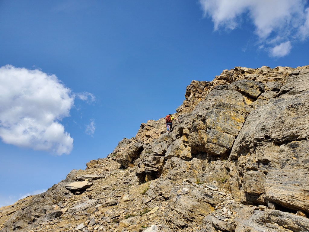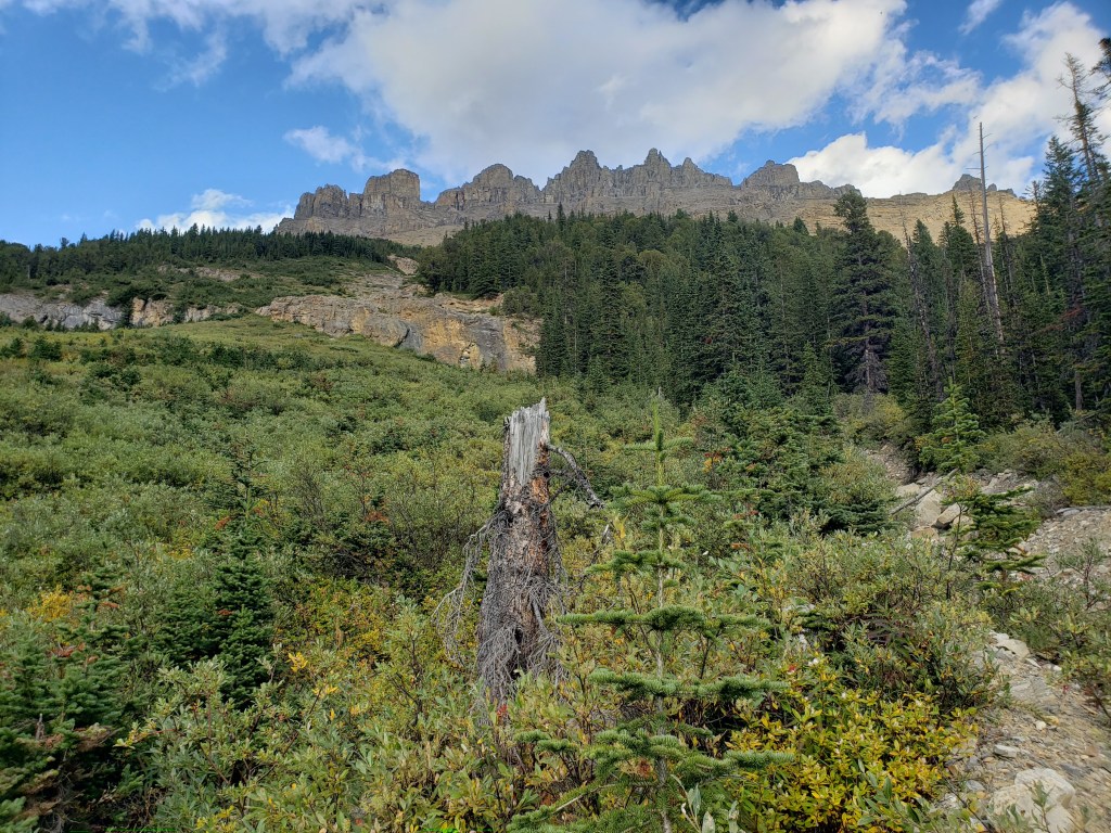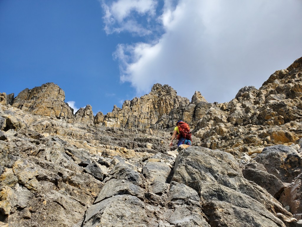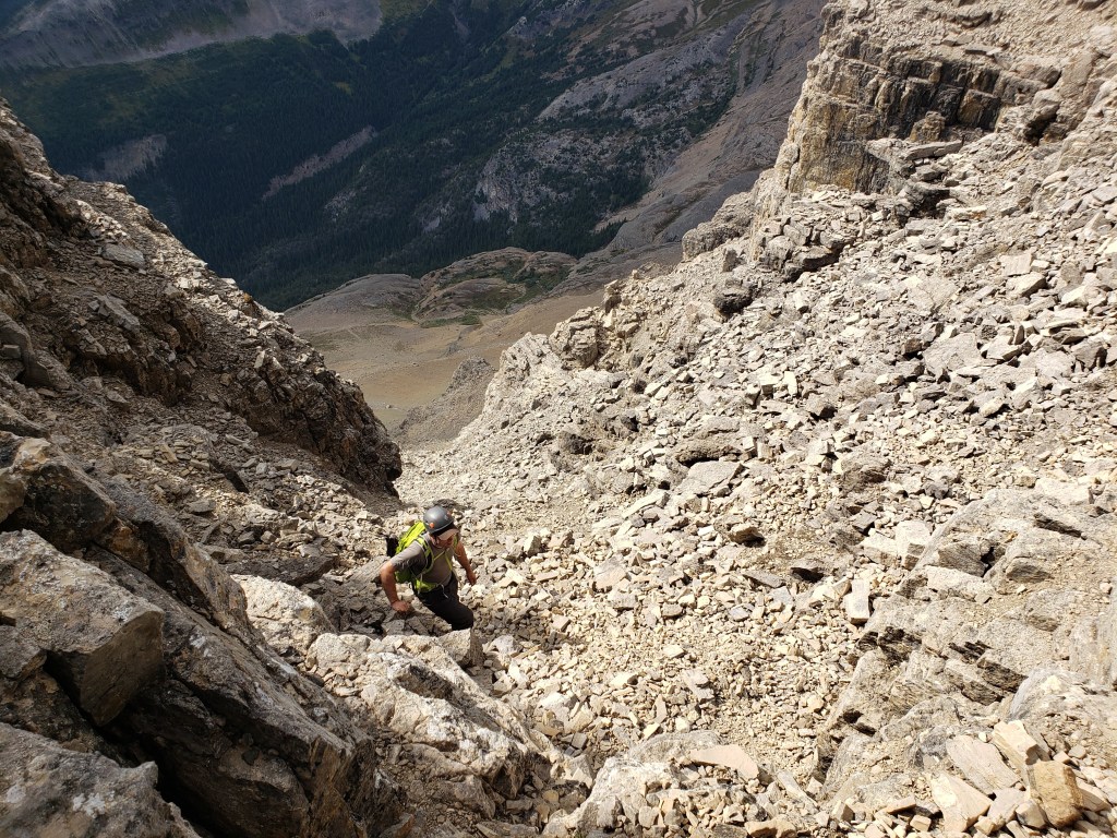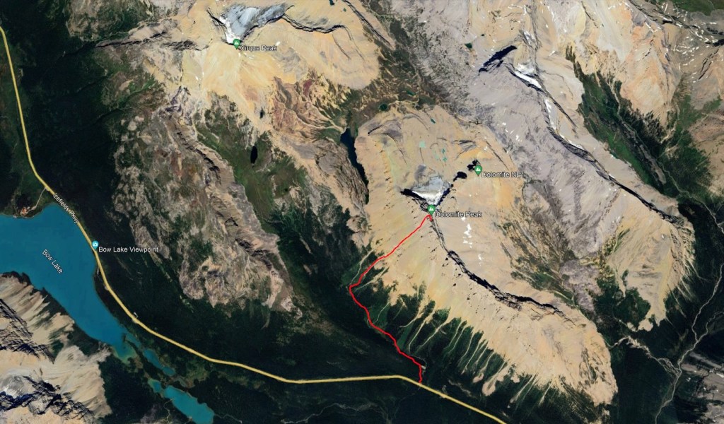 We picked up the trail at the pull-out and followed it in along Helen Creek. The trail thinned in places, but was picked up again within a few hundred meters. Helen Peak can be seen in the gap of trees just right of center.The turn-off for the col between the third and fourth peaks was marked with flagging tape. Our objective is the fourth one in from the left. The low cliff-band ahead is easily overcome via the grassy slope at center.Continuing up the drainage toward the col. Wherever the way looked impassible, a bypass was easily found. The drainage holds much loose rock and we welcomed the variety offered by sections of hands-on scrambling.Making our way through an interesting section of brightly coloured rock.Looking back at Dan. A small cairn in the foreground confirms that we are on route.We bypassed one cliff in the drainage via a moderate scrambling line to the left.Dan gazing ahead to our objective, the fourth peak (center).We bypassed another cliff, again scrambling to the left. This one felt closer to difficult scrambling.Looking back at the Crowfoot Glacier hanging over Bow Lake. The Helen Lake trail can’t quite be made out, but traverses below the ridge in the foreground, roughly at treeline.The drainage narrowed as we neared the col. We started noticing a lot of rock fall and heard faint voices, but didn’t hear a response to our shouts of “hello?”. We eventually caught up with the trio coming down from the fourth peak and beginning up the third peak. I’m not sure what their deal was, but we left them to it.Traversing around the base of the fourth peak, looking back at the third peak. Many, many cairns marked the easiest way around the tower to the ascent chute.One last tricky rock chute before the top.Dan standing at the top of Dolomite Peak (fourth peak) with the fifth peak behind him. Further back (south) are Mount Andromache and Mount Hector.Looking west from the peak to the Wapta Icefield.The trio reached the third peak (using a line to the north of the tower) just as we were returning to the col. Figuring that, if we were quick, we could avoid being in their rockfall, we returned the way we came without pause. This shot is looking back up at the fourth peak.We made it back to Helen Creek with no issue larger than a broken trekking pole. One last look back up at Dolomite before following the creek back out.