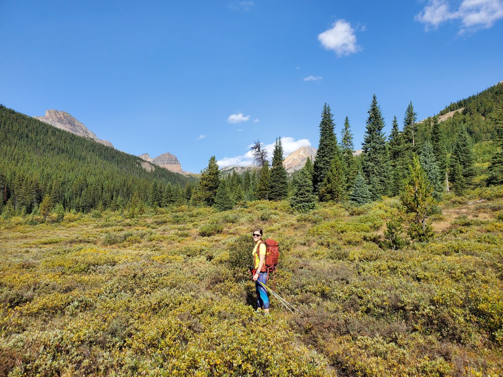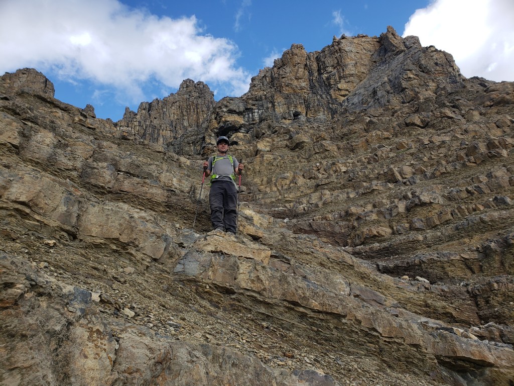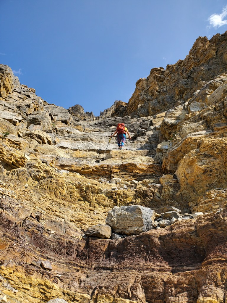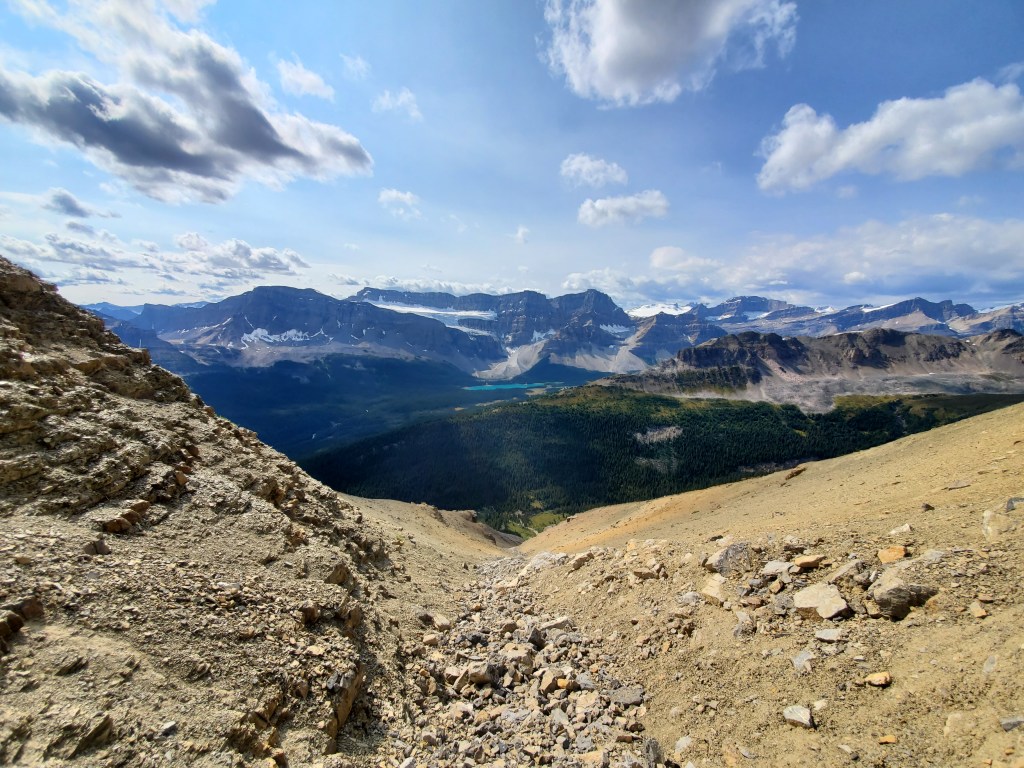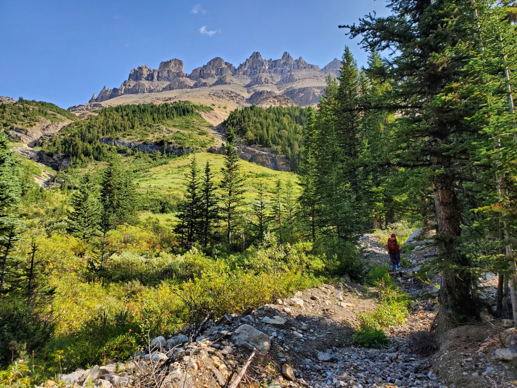 We picked up the trail at the pull-out and followed it in along Helen Creek. The trail thinned in places, but was picked up again within a few hundred meters. Helen Peak can be seen in the gap of trees just right of center.The turn-off for the col between the third and fourth peaks was marked with flagging tape. Our objective is the fourth one in from the left. The low cliff-band ahead is easily overcome via the grassy slope at center.Continuing up the drainage toward the col. Wherever the way looked impassible, a bypass was easily found. The drainage holds much loose rock and we welcomed the variety offered by sections of hands-on scrambling.Making our way through an interesting section of brightly coloured rock.Looking back at Dan. A small cairn in the foreground confirms that we are on route.We bypassed one cliff in the drainage via a moderate scrambling line to the left.Dan gazing ahead to our objective, the fourth peak (center).We bypassed another cliff, again scrambling to the left. This one felt closer to difficult scrambling.Looking back at the Crowfoot Glacier hanging over Bow Lake. The Helen Lake trail can’t quite be made out, but traverses below the ridge in the foreground, roughly at treeline.The drainage narrowed as we neared the col. We started noticing a lot of rock fall and heard faint voices, but didn’t hear a response to our shouts of “hello?”. We eventually caught up with the trio coming down from the fourth peak and beginning up the third peak. I’m not sure what their deal was, but we left them to it.Traversing around the base of the fourth peak, looking back at the third peak. Many, many cairns marked the easiest way around the tower to the ascent chute.One last tricky rock chute before the top.Dan standing at the top of Dolomite Peak (fourth peak) with the fifth peak behind him. Further back (south) are Mount Andromache and Mount Hector.Looking west from the peak to the Wapta Icefield.The trio reached the third peak (using a line to the north of the tower) just as we were returning to the col. Figuring that, if we were quick, we could avoid being in their rockfall, we returned the way we came without pause. This shot is looking back up at the fourth peak.We made it back to Helen Creek with no issue larger than a broken trekking pole. One last look back up at Dolomite before following the creek back out.