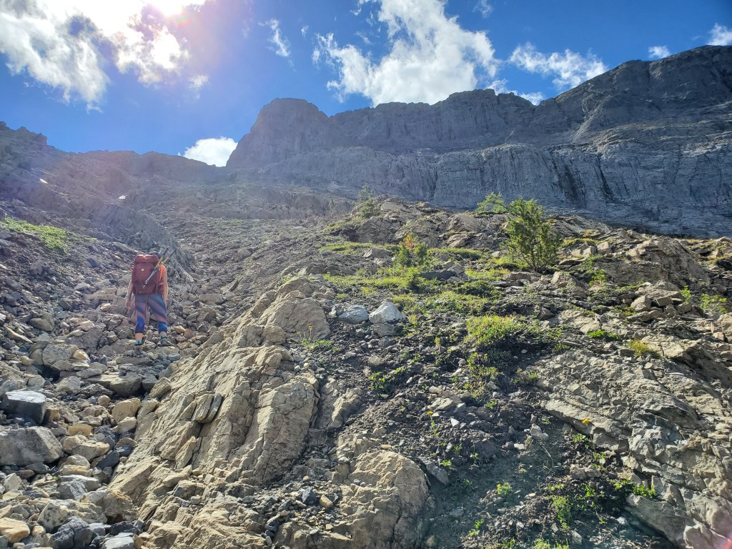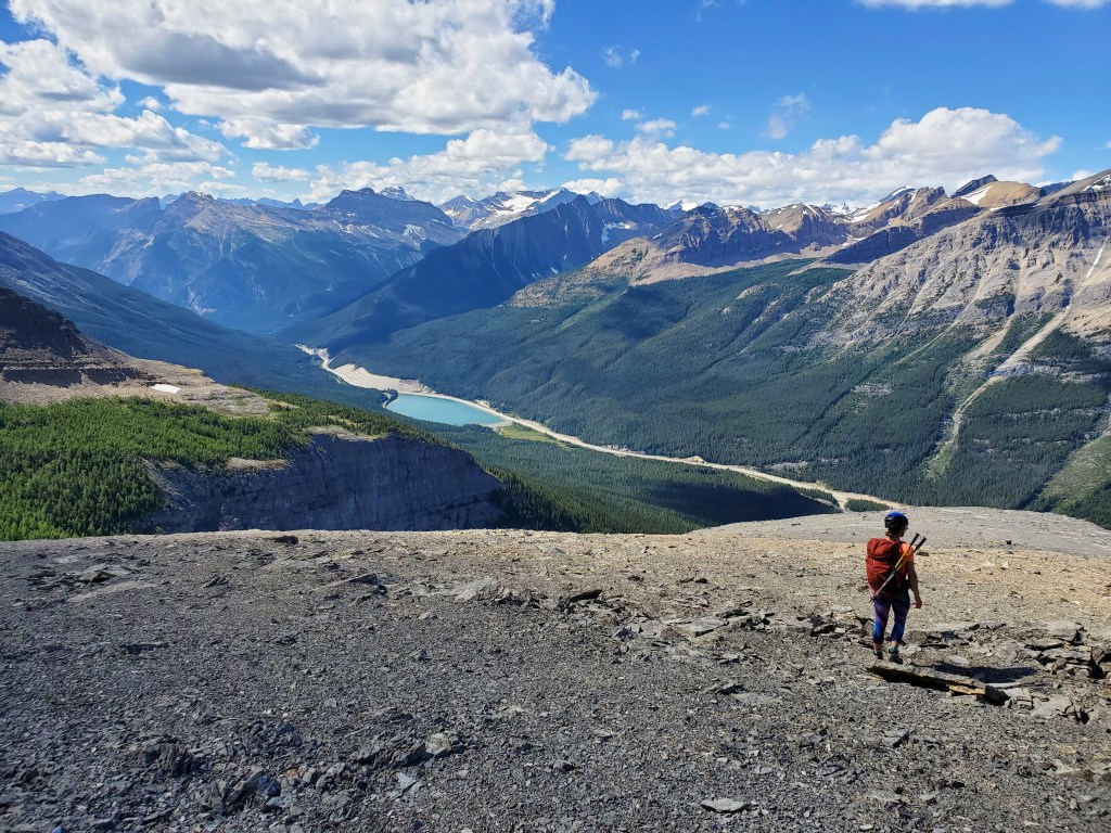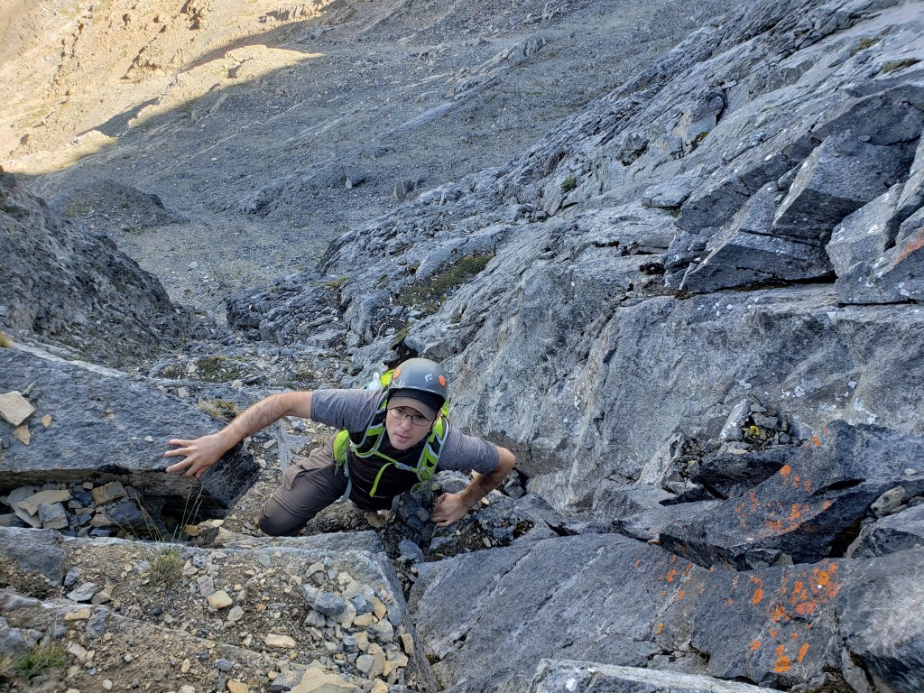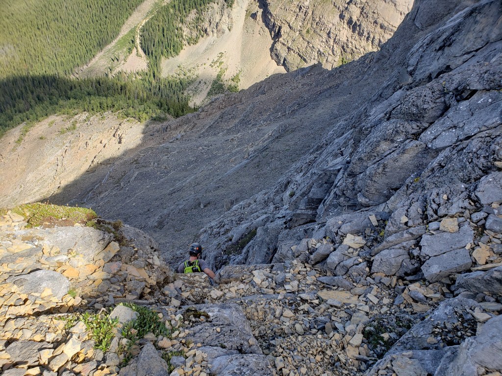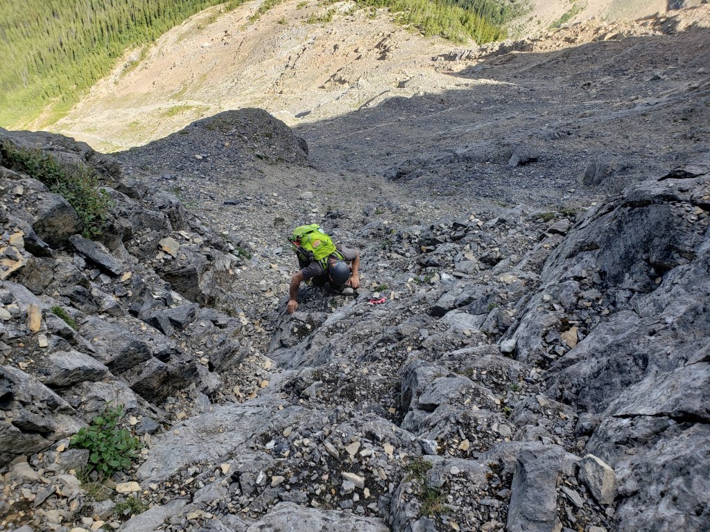 The easy walk to Ross Lake took about 45 min. We saw one other group there, and no one else for the rest of the day. Divide Peak stands above the bright turquoise water of the lake.We continued past the lake for five or so minutes, hoping a trail would have formed at the turn-off, but nothing more than a piece of flagging tape was found. Thankfully the dense bushwhacking was very brief. Believe it or not, Dan is in this photo.The trees soon opened up and a clear avalanche path led the rest of the way to the base of the cliffs ahead.Looking back at the avalanche path we followed. The highway can be seen not far behind us and Ross Lake is out of view to the left.The avalanche path led to a gully, taking us up the left side of this photo. Once above the shelf (seen to the right), we will traverse right to the scramble line.We donned our helmets and began the traverse. This section is somewhat exposed with slabby spots and loose rock, making us grateful for the dry conditions.Looking back as Dan follows through the traverse section. The shoulder of Mount Niblock can be seen in the background.The scramble route climbs an obvious gully. The occasional piece of flagging tape along the line confirmed we were on route.Positive, juggy holds are plentiful, but a dusting of loose gravel gives the route a spicy feel.Looking back at Dan as he searches for solids holds in the chossy face. A piece of flagging tape can be spotted in front of his left hand.Nearly at the summit plateau, a chimney features leads to the top. The chimney is exited at the right, on an exposed, gravel-strewn ledge.Dan exits the chimney to the exposed ledge. I found downclimbing this on the return trip to be the crux of the day.Topping out at the large summit cairn. Mount Niblock (left) and Mount Whyte (center-left) can be seen in the background.Looking north from Divide Peak.Looking south along the ridge from Divide Peak, which forms the border between BC and Alberta. Popes Peak (center) makes for an impressive backdrop.We returned the way we came. We had taken note of a small cairn at the top of the scramble route, making it easier to find on the return trip. The line is difficult to spot until you are right on top of it.Looking down the tricky downclimb from the top. The difficult scramble rating for this mountain is fair.Nearly at the bottom of the scramble line. This photo captures the terrain well – Not the steepest thing I’ve scrambled, but very loose with some exposure.We hiked back out past Ross Lake, taking in one more view of Divide Peak (center). Our route had roughly followed the left shoulder.