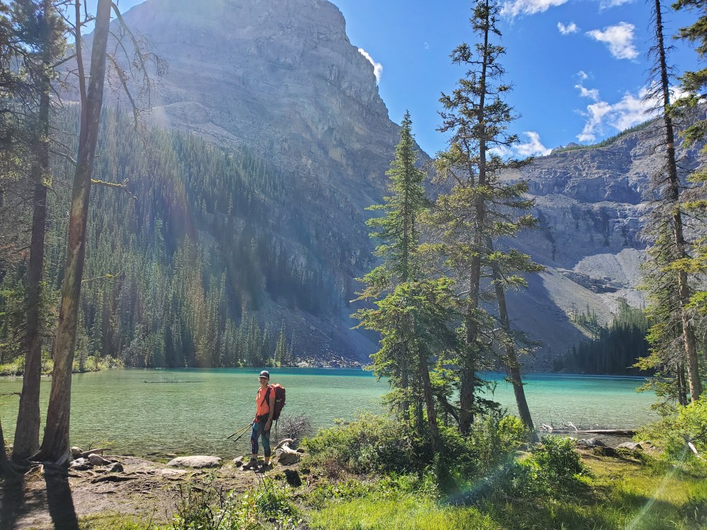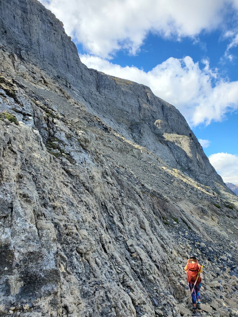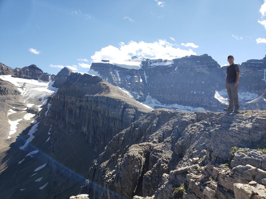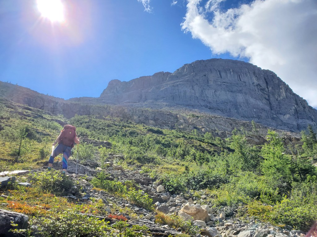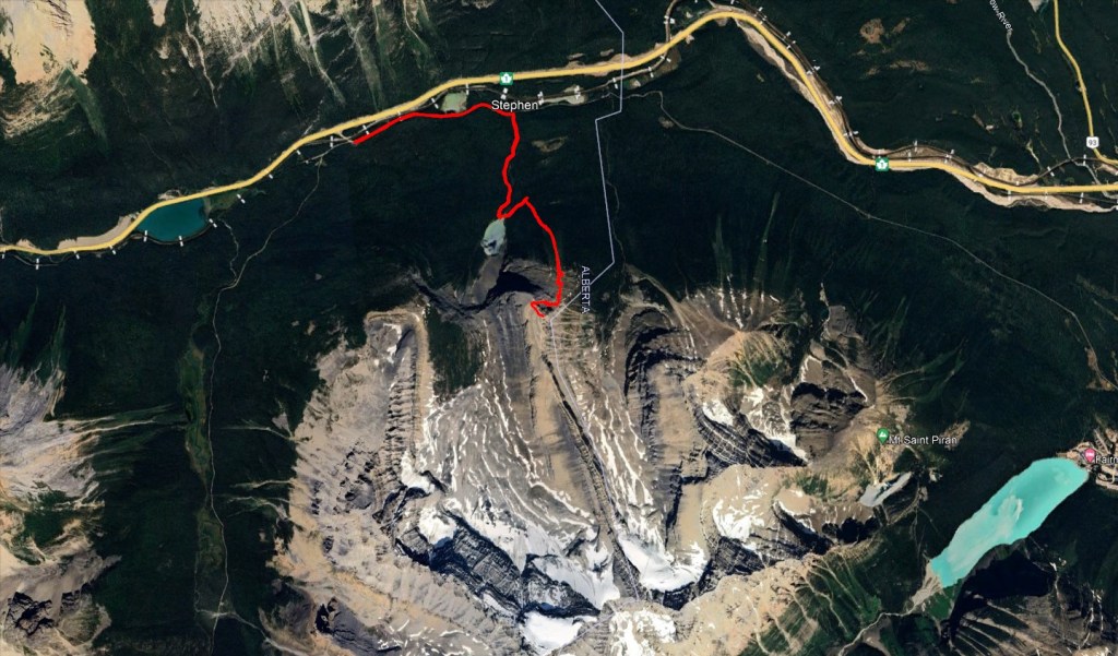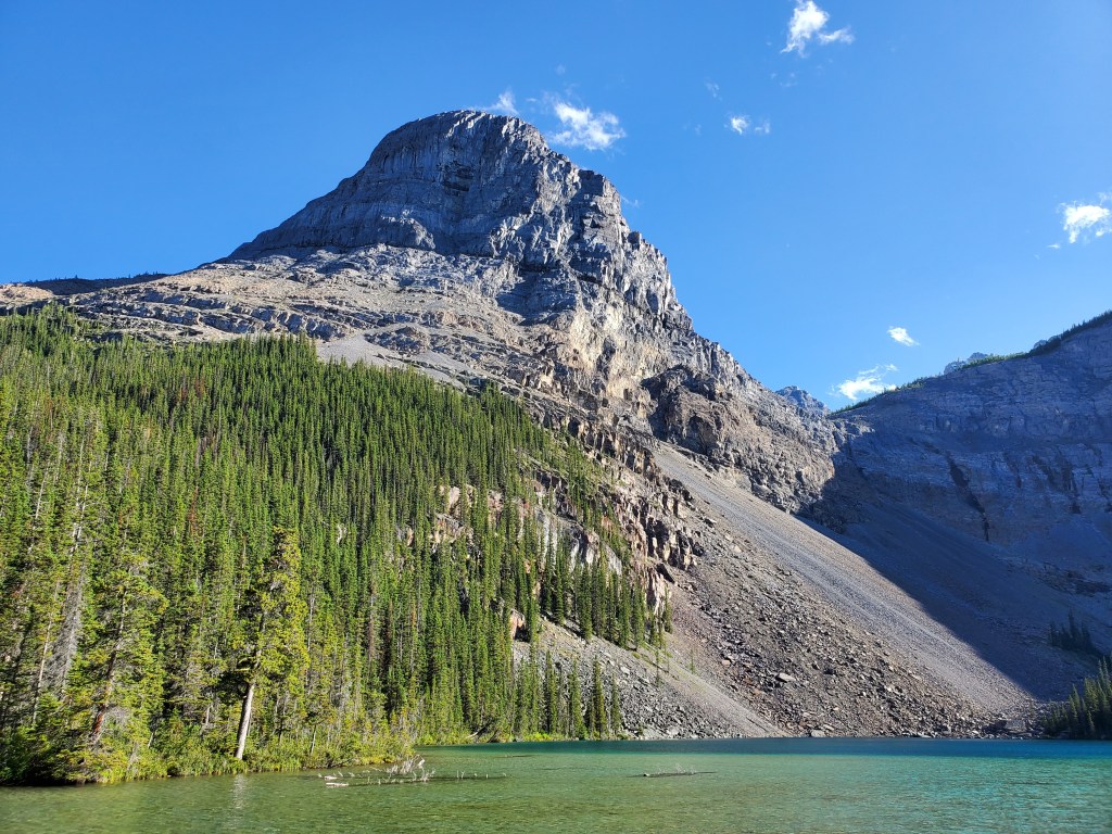 The easy walk to Ross Lake took about 45 min. We saw one other group there, and no one else for the rest of the day. Divide Peak stands above the bright turquoise water of the lake.We continued past the lake for five or so minutes, hoping a trail would have formed at the turn-off, but nothing more than a piece of flagging tape was found. Thankfully the dense bushwhacking was very brief. Believe it or not, Dan is in this photo.The trees soon opened up and a clear avalanche path led the rest of the way to the base of the cliffs ahead.Looking back at the avalanche path we followed. The highway can be seen not far behind us and Ross Lake is out of view to the left.The avalanche path led to a gully, taking us up the left side of this photo. Once above the shelf (seen to the right), we will traverse right to the scramble line.We donned our helmets and began the traverse. This section is somewhat exposed with slabby spots and loose rock, making us grateful for the dry conditions.Looking back as Dan follows through the traverse section. The shoulder of Mount Niblock can be seen in the background.The scramble route climbs an obvious gully. The occasional piece of flagging tape along the line confirmed we were on route.Positive, juggy holds are plentiful, but a dusting of loose gravel gives the route a spicy feel.Looking back at Dan as he searches for solids holds in the chossy face. A piece of flagging tape can be spotted in front of his left hand.Nearly at the summit plateau, a chimney features leads to the top. The chimney is exited at the right, on an exposed, gravel-strewn ledge.Dan exits the chimney to the exposed ledge. I found downclimbing this on the return trip to be the crux of the day.Topping out at the large summit cairn. Mount Niblock (left) and Mount Whyte (center-left) can be seen in the background.Looking north from Divide Peak.Looking south along the ridge from Divide Peak, which forms the border between BC and Alberta. Popes Peak (center) makes for an impressive backdrop.We returned the way we came. We had taken note of a small cairn at the top of the scramble route, making it easier to find on the return trip. The line is difficult to spot until you are right on top of it.Looking down the tricky downclimb from the top. The difficult scramble rating for this mountain is fair.Nearly at the bottom of the scramble line. This photo captures the terrain well – Not the steepest thing I’ve scrambled, but very loose with some exposure.We hiked back out past Ross Lake, taking in one more view of Divide Peak (center). Our route had roughly followed the left shoulder.