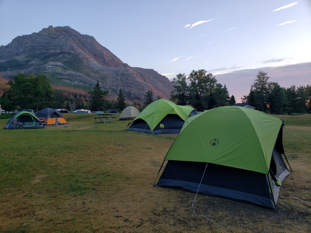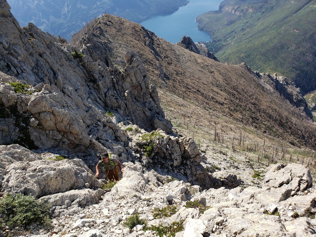 Crandell Mountain Campground was destroyed in the 2017 Kenow Wildfire and remains closed as of writing. This photo of Mount Crandell is taken from what’s serving as the “campground” in the townsite. Tick Ridge is the right-hand shoulder and Bear’s Hump can be seen at center.We spotted our ridge behind the ranger station and easily made our way to the base of it. As of 2020 most of the trees were still standing after the 2017 fire. But, I wouldn’t be surprised if forest fire deadfall worsens this route over the years.The ridge offers splendid views over the Prince of Whales hotel and Waterton Lakes. The immense efforts to save this historic building from the fire are not unappreciated.Continuing up the ridge, a few sections of moderate scrambling are encountered – nothing too serious, just enough fun to add variety.Approaching the top of the ridge, nearing the spot where we’ll meet up with the Bear’s Hump route.We were please to spot signs of life on this sad, scorched slope. This mama-sheep brought her baby over, seemingly to gawk at us clumsy humans.Looking south from the top of Tick Ridge at Upper Waterton Lake, which extends south into the USA. In the foreground the Bear’s Hump route meets up with Tick Ridge. The views here were better than at the peak!Panorama from the top of Tick Ridge.Looking forward, to the cockscomb. We will be bypassing the section immediately ahead of us by detouring to the left under the shadow, and then regaining the ridge at the wider section, where the shadow ends at the left.Bypassing the cockscomb to the left (west) might have been the only shade we encountered this day!This wider section of the cockscomb looked like a reasonable spot to regain the ridge. It starts out as only moderate scrambling.The last few moves to regain the ridge at this spot felt loose and exposed, probably closer to difficult scrambling. Perhaps a more moderate line exists though.Gaining the ridge and looking forward. It looks like continuing the bypass at the left may have led to another option for regaining the ridge after skirting the northern end of the cockscomb, perhaps offering a more moderate line. We had taken the first line that worked.Continuing along the summit ridge and looking back. We bypassed the large fin in the background to climber’s right. The moves to tackle the feature head-on look fun, but the rock is not solid.The final portion of the summit ridge is an easy ridge walk. The peak can be seen ahead, marked by a repeater station.Taking in views of the radio repeater site at the top of Mount Crandell. Aside from those with a particular appreciation for communications infrastructure, most people seem to prefer the views from the top of Tick Ridge to this.From the peak, we continued north to Kane’s descent route, down this drainage. Kane suggests that the full descent could be possible in one hour, but I am highly skeptical.We kept to the left of the stream, keeping high above where it narrows. Cliffs ahead eventually forced us into the drainage.The line down a side drainage was moderate scrambling on loose terrain, not something I would want to rush through. As hot and tired as we were, we plainly saw that Kane’s suggested descent time of one hour was not going to happen. We carefully picked our way down into the drainage and then rock-hopped our way down the steam bed to where we had started. Our descent from peak to car took two and a half hours.We reached our vehicle in 7 hrs 40 min and rewarded ourselves for a safe trip by heading directly to Upper Waterton Lake. This lake is typically too cold to be comfortable for swimming, but on this day it was absolutely perfect. It was also packed with tourists, contrary to the norm. Vimy Peak stands above the lake in the background.